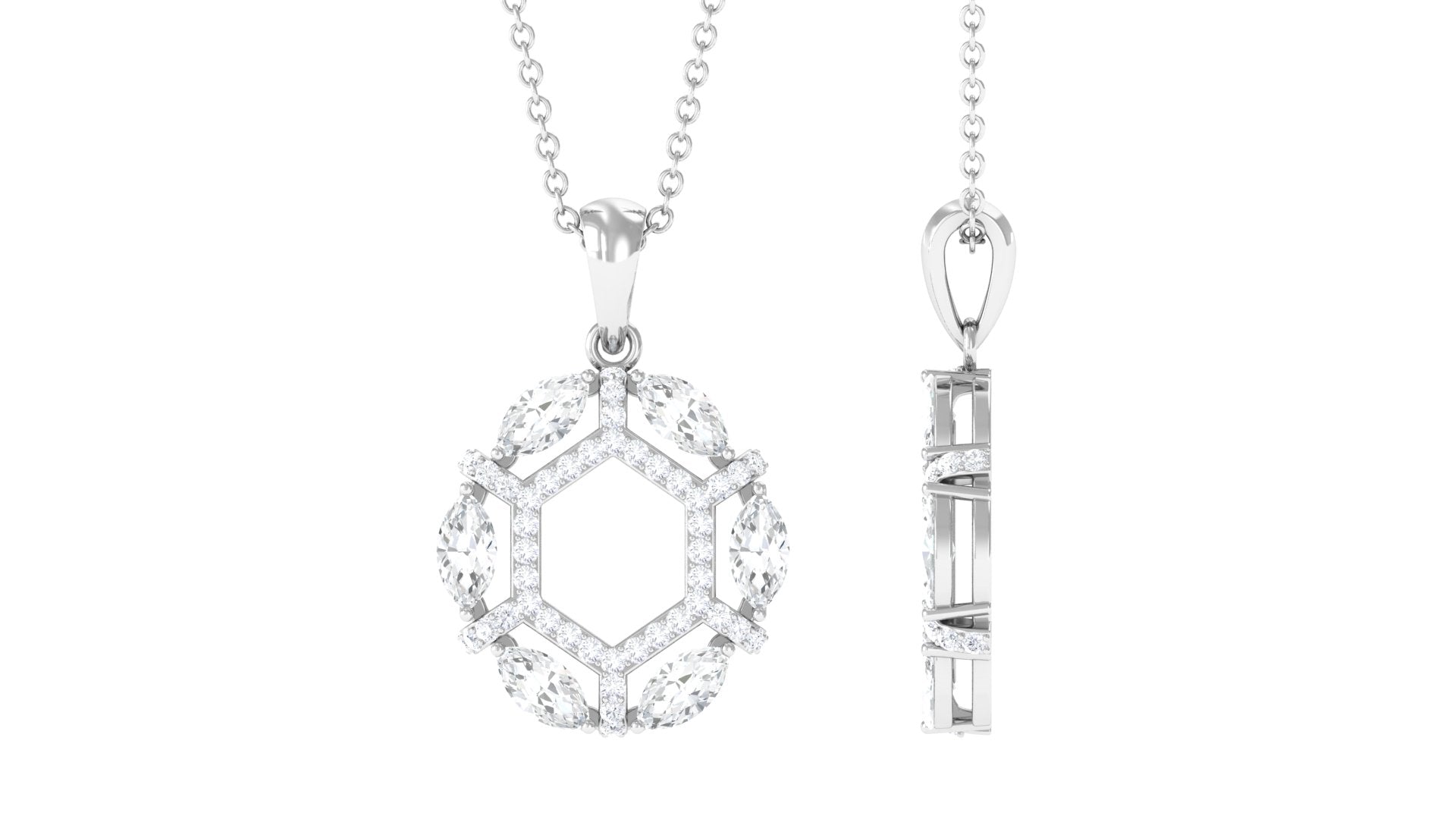 You will definitely steal the spotlight by wearing our Moissanite Art Deco Pendant Necklace embellished with Marquise and Round Shape Moissanite studded on a unique design. This Moissanite Pendant Necklace is composed of Hallmarked Metal. Our unique Moissanite Pendant makes a beautiful present for your beloved wife.