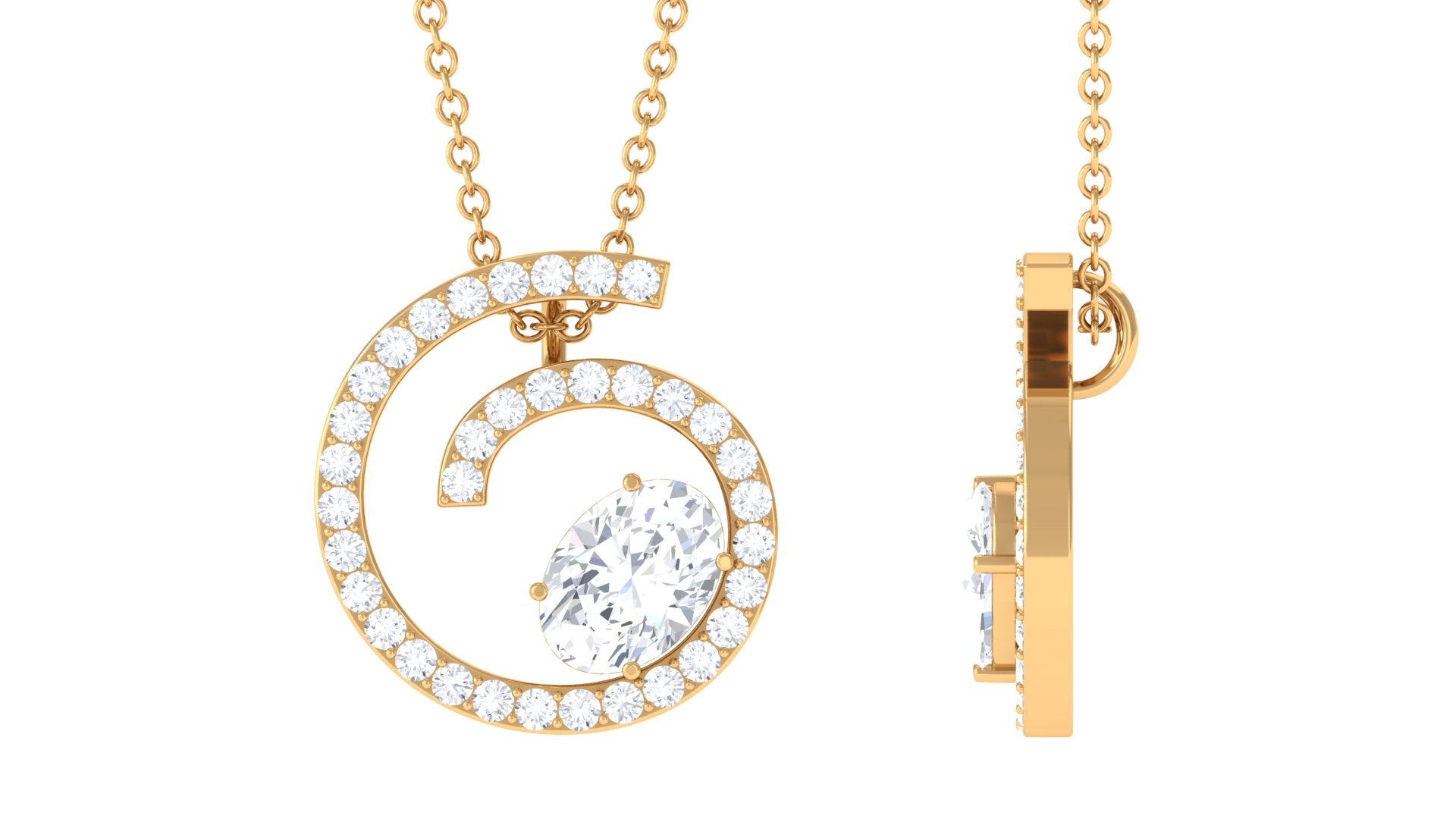The Contemporary Swirl Pendant features an Oval Cut Moissanite gemstone in Prong Setting with Round Moissanite gemstones. The swirl pattern creates an elegant and modern look that will add a touch of sophistication to any outfit. This pendant is a perfect gift for someone special or a timeless addition to your jewelry collection.