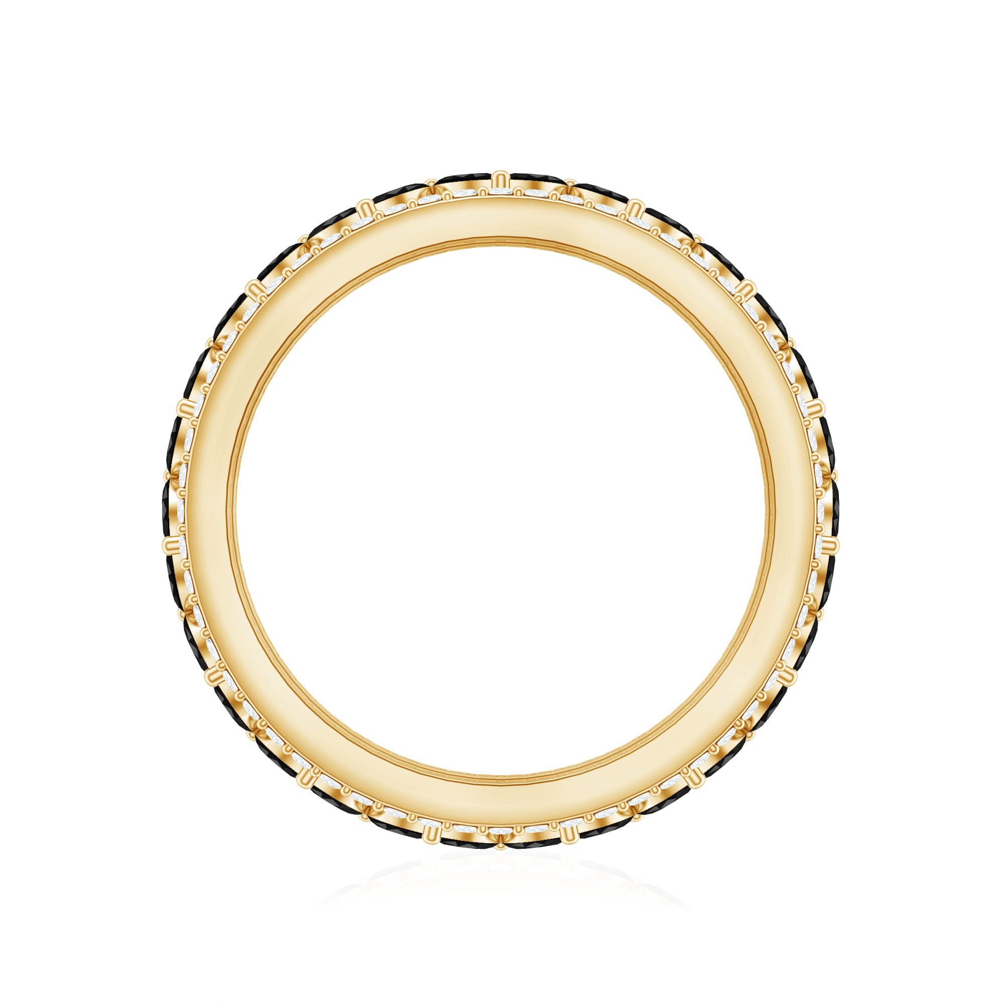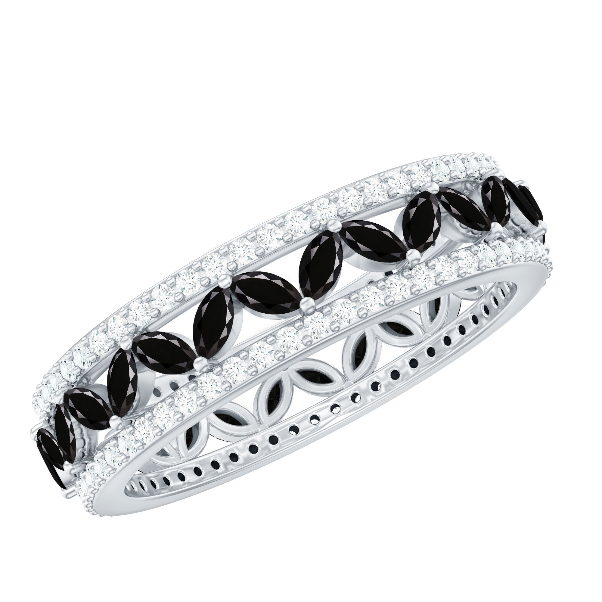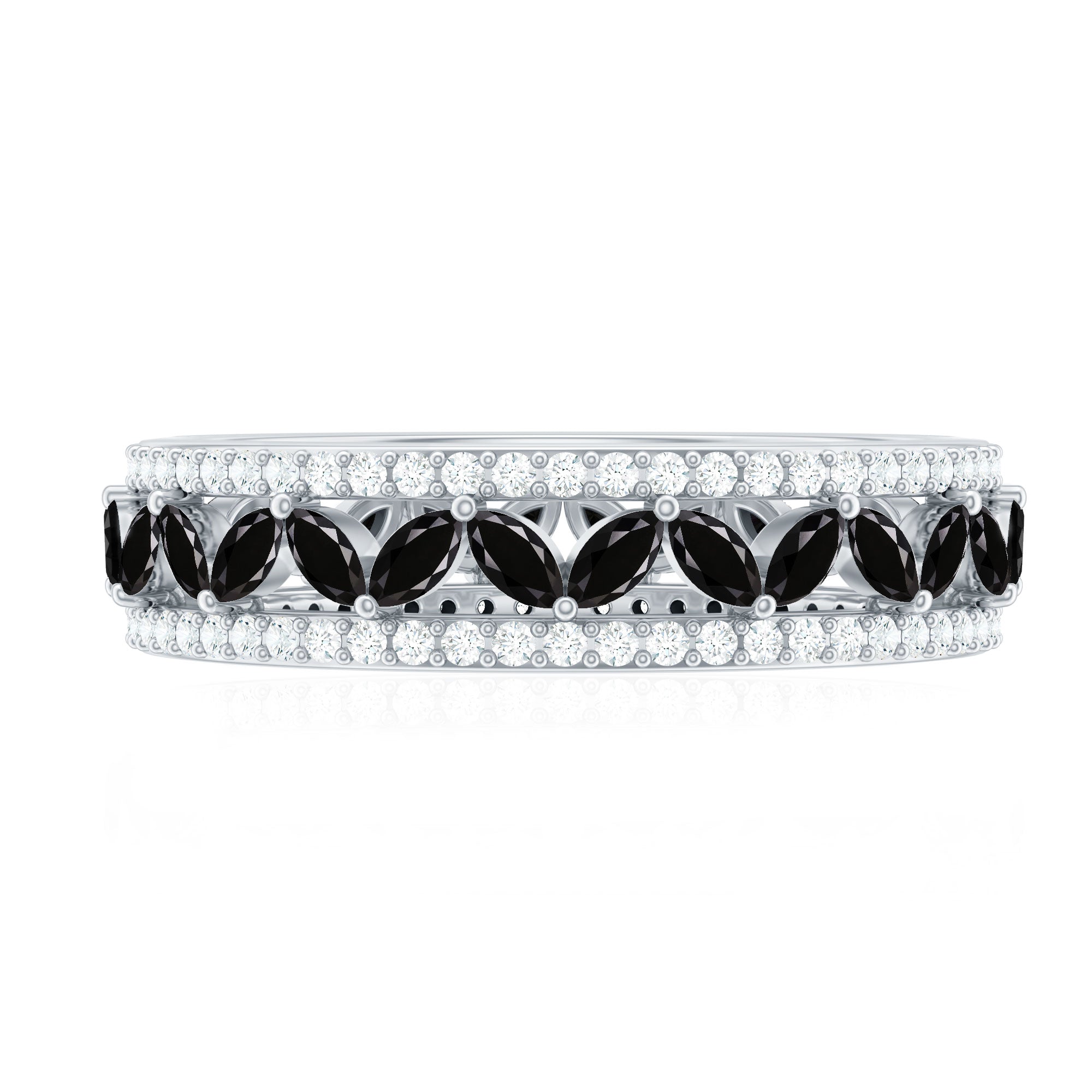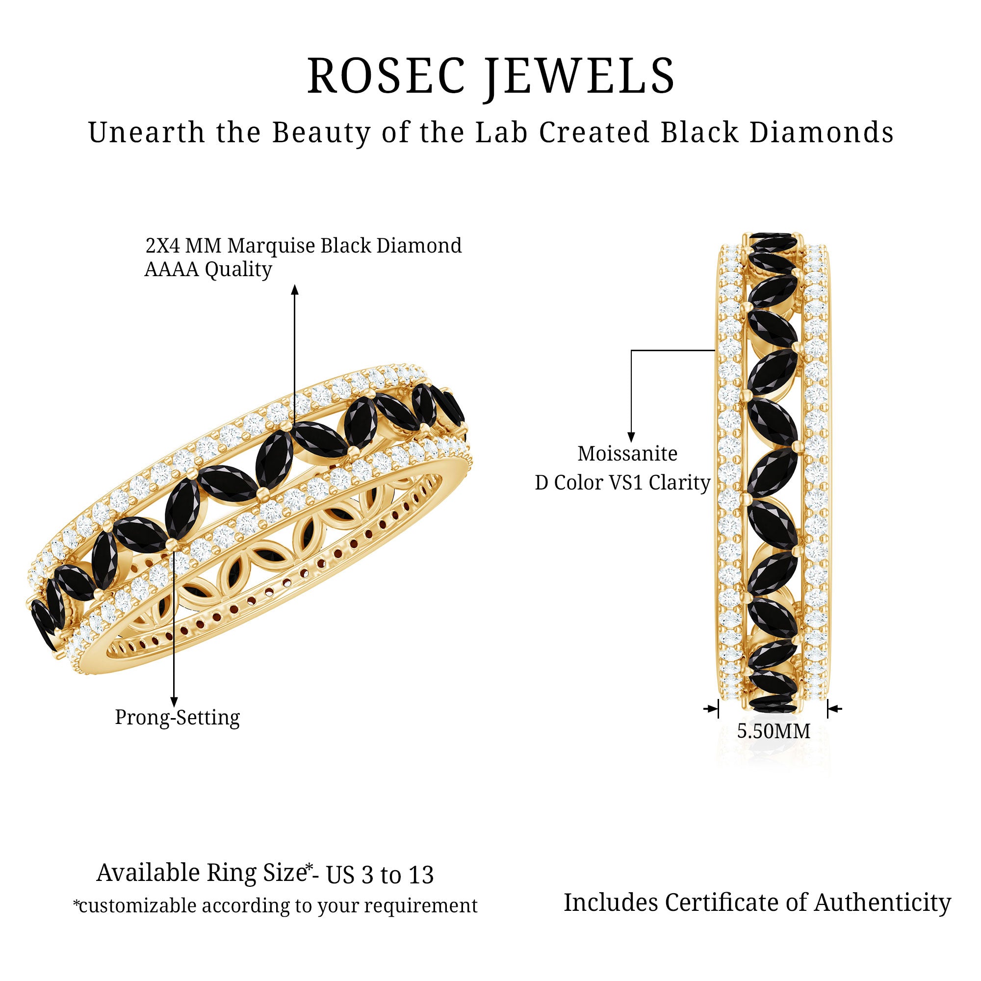 An Elegant Wedding Band Ring embellished with Marquise Cut Created Black Diamond set in a Prong Setting and round shape Moissanite set in a Pave Setting. This Gold Band Ring is Composed of Solid Gold.