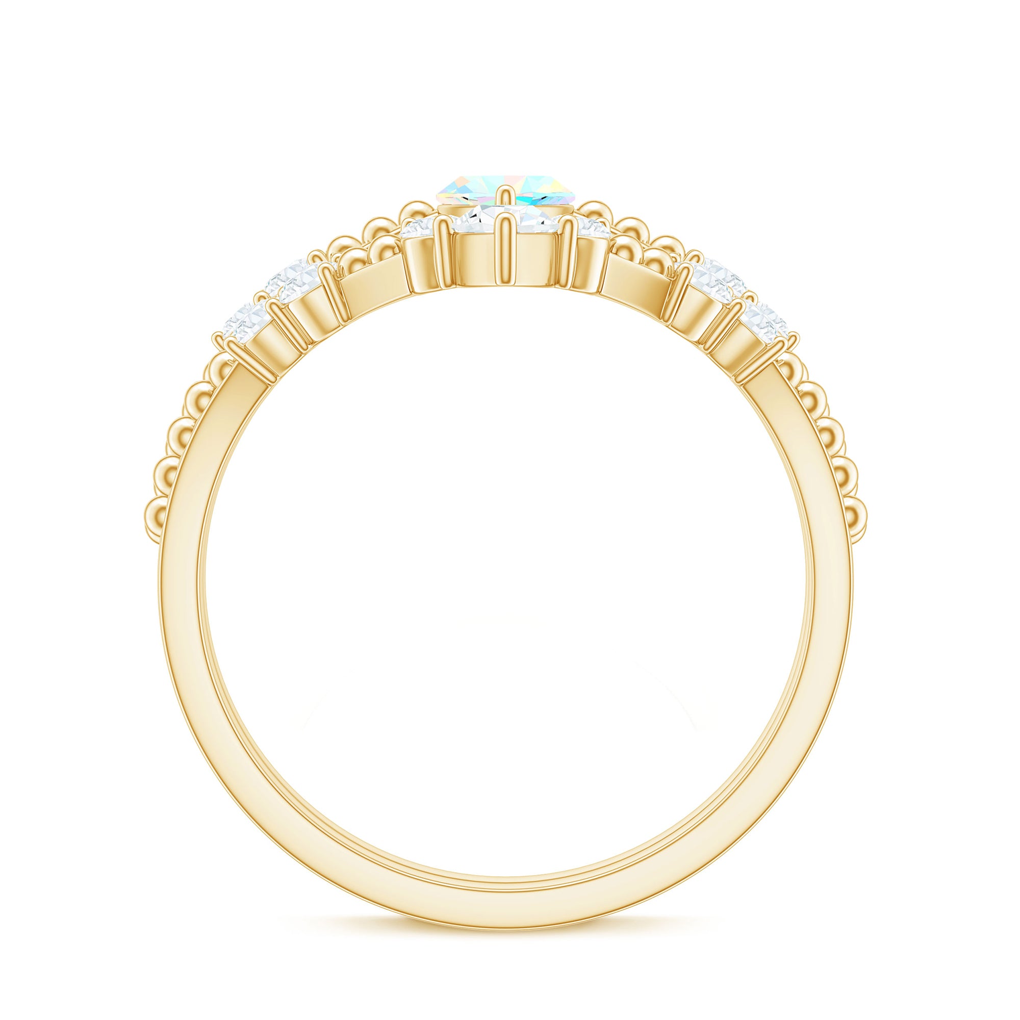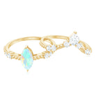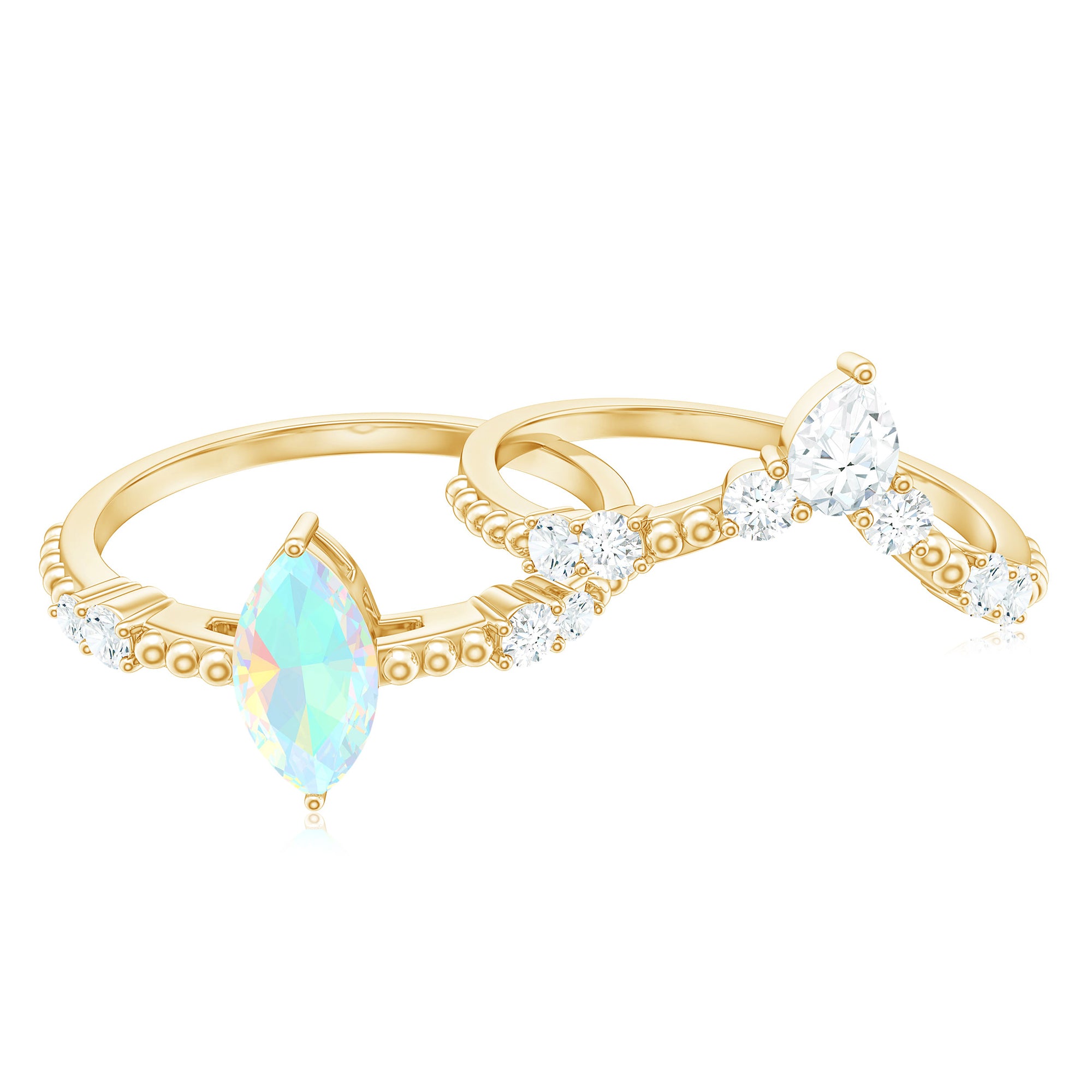 Dare to dazzle with this Wedding Bridal Ring Set that brings together celestial charm and bold sophistication. At the center of the Solitaire Engagement Ring is a 4X8 mm Marquise Shape Ethiopian Opal, flickering with rainbow hues, flanked by sparkling Moissanite stones that amplify its natural magic. The coordinating V Shaped Wedding Band adds more brilliance, adorned with a mix of Pear and Round Shape Moissanite stones that create a dramatic sparkle. This Marquise Engagement Ring with Wedding Band features intricate Beaded Detailing along the bands, giving them a vintage inspired touch with a modern twist. This thoughtfully designed Opal Wedding Ring Set offers perfect symmetry, symbolism and style, ideal for brides who want something unique yet timeless. Available in a variety of sizes and presented in a signature jewelry box, this Opal Engagement Ring Set is ready to gift or wear straight out of the box. Whether you are stepping into forever or upgrading your bridal stack, this Engagement and Wedding Ring Set is crafted for the kind of romance that lights up a lifetime.