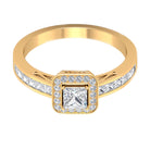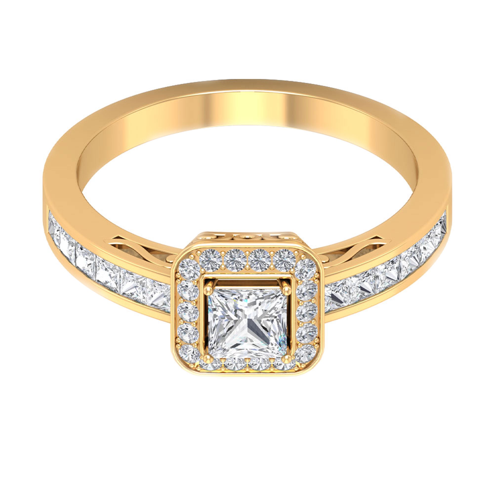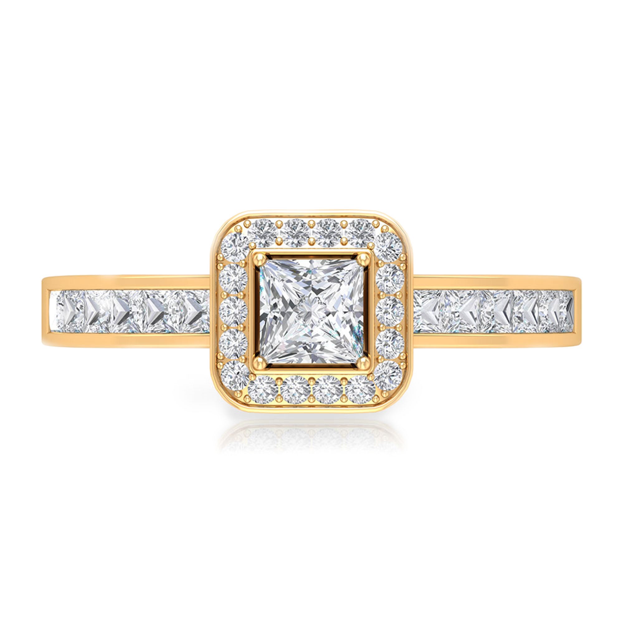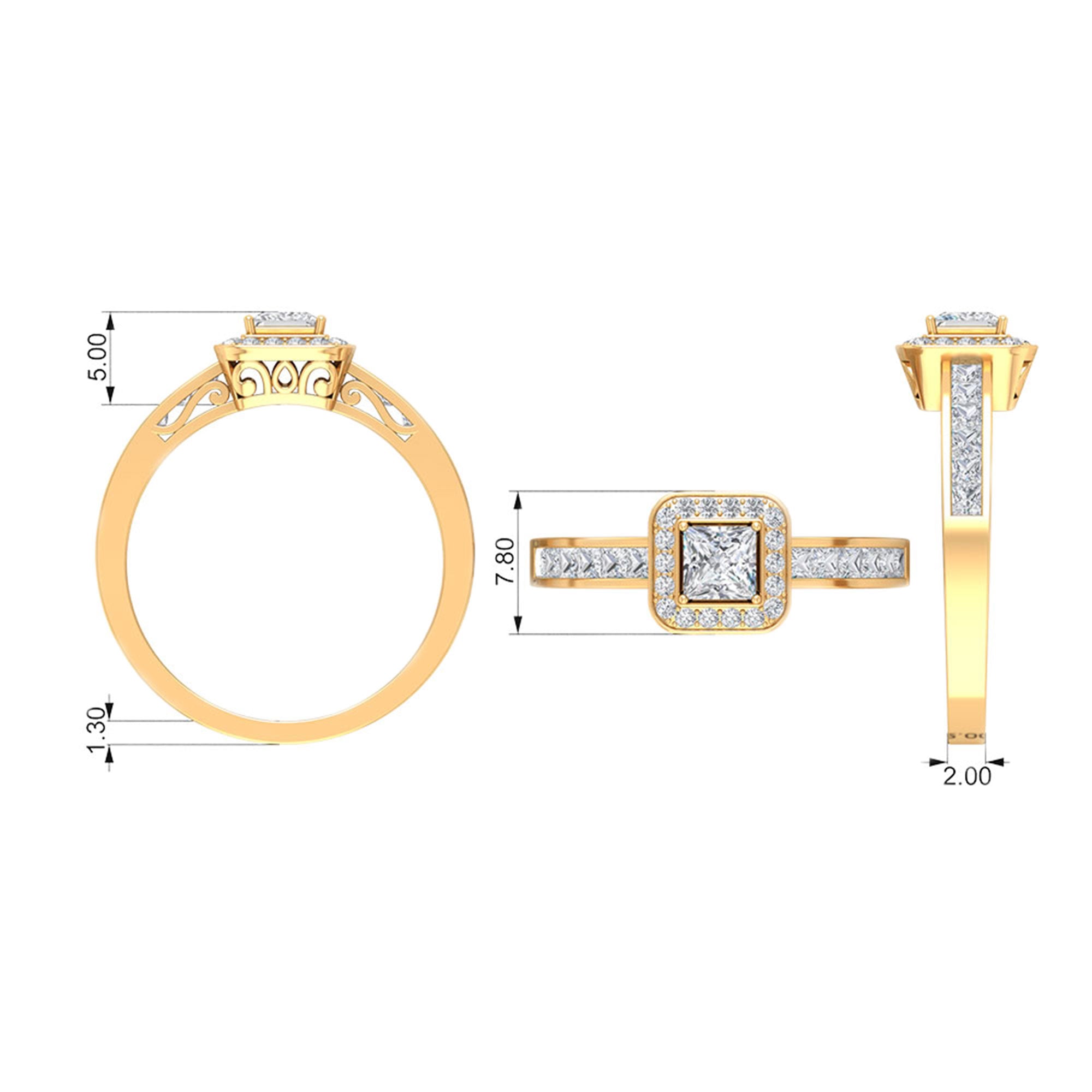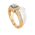 Flawless Solitaire Halo Ring is adorned with Solitaire Princess Cut Diamond is encircled with Round Shape Diamond is set in the halo setting and princess cut diamond in side stone setting gives this ring an amazing look, composed of Solid Gold.