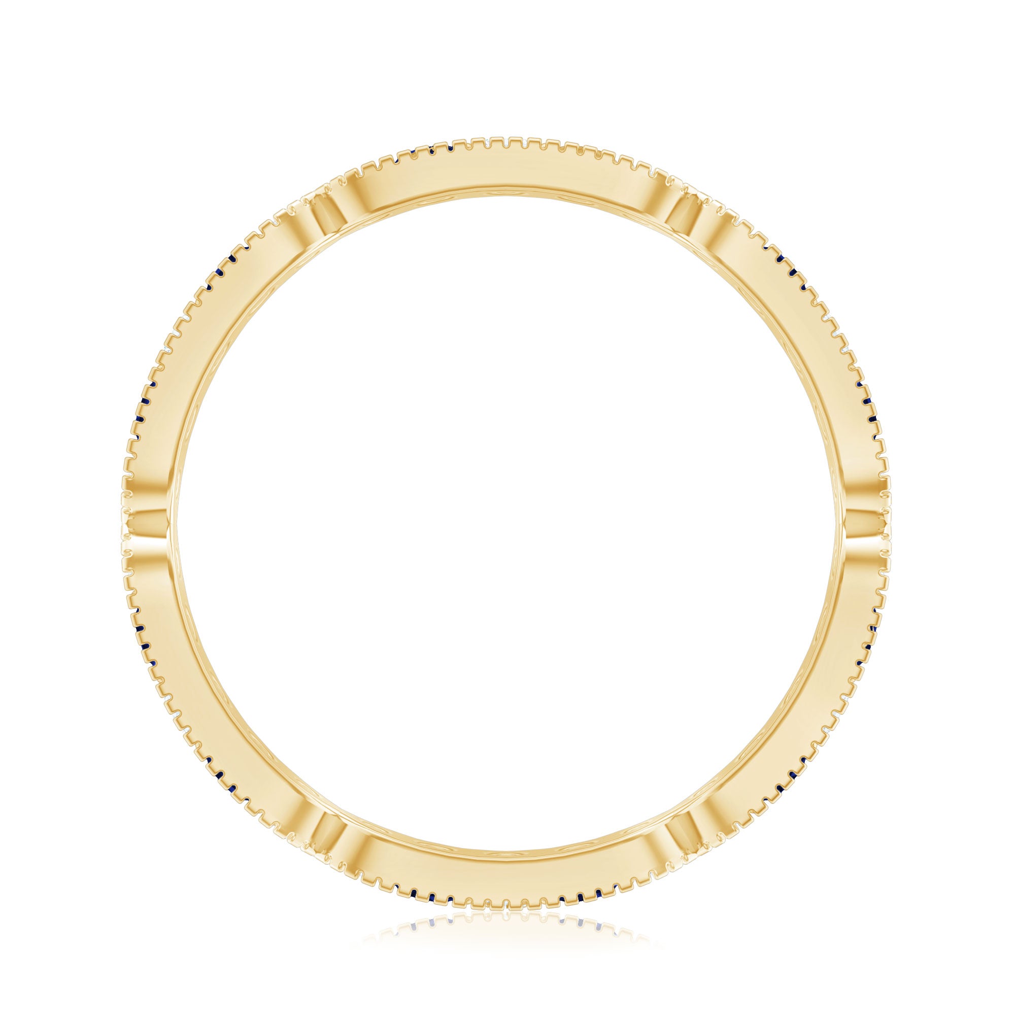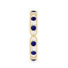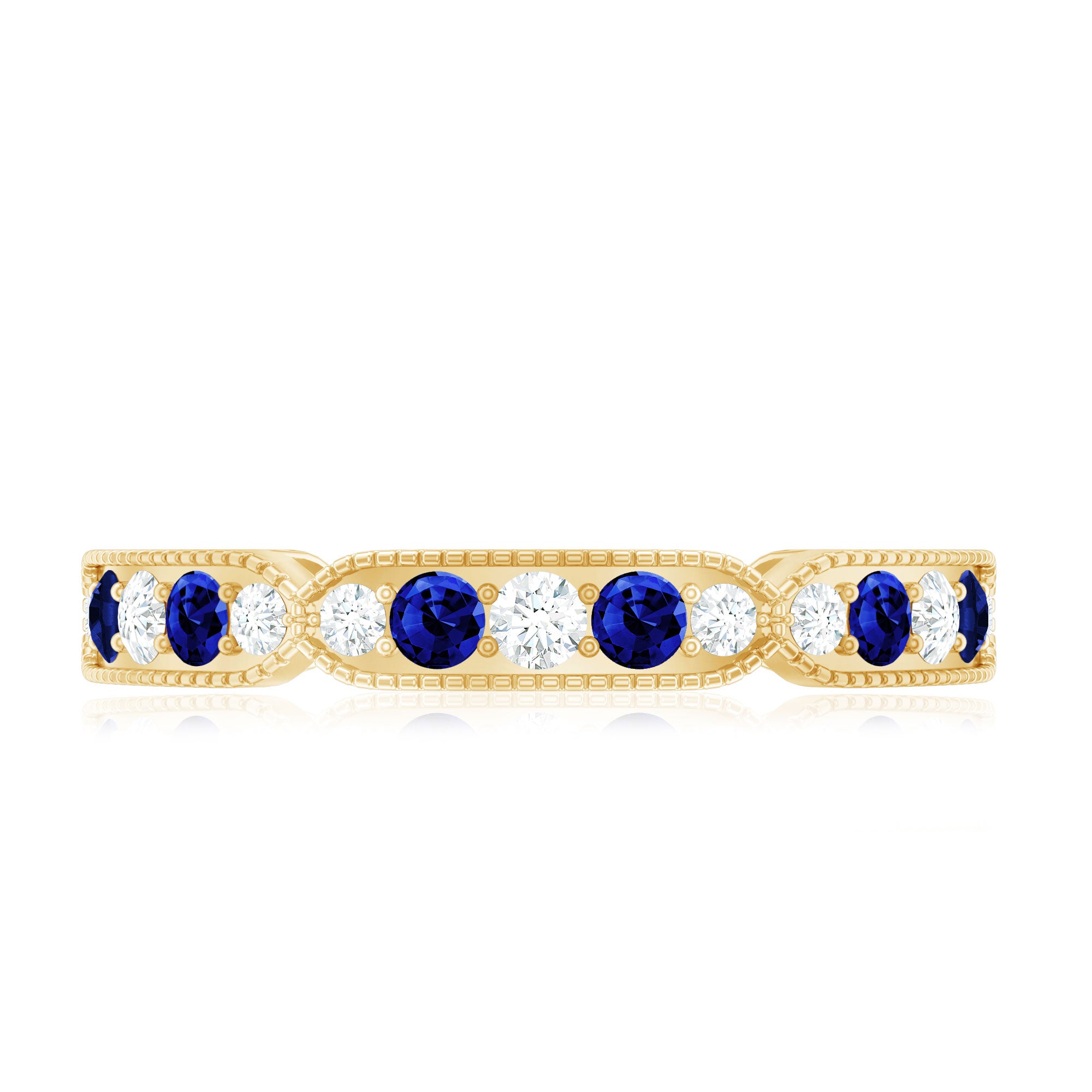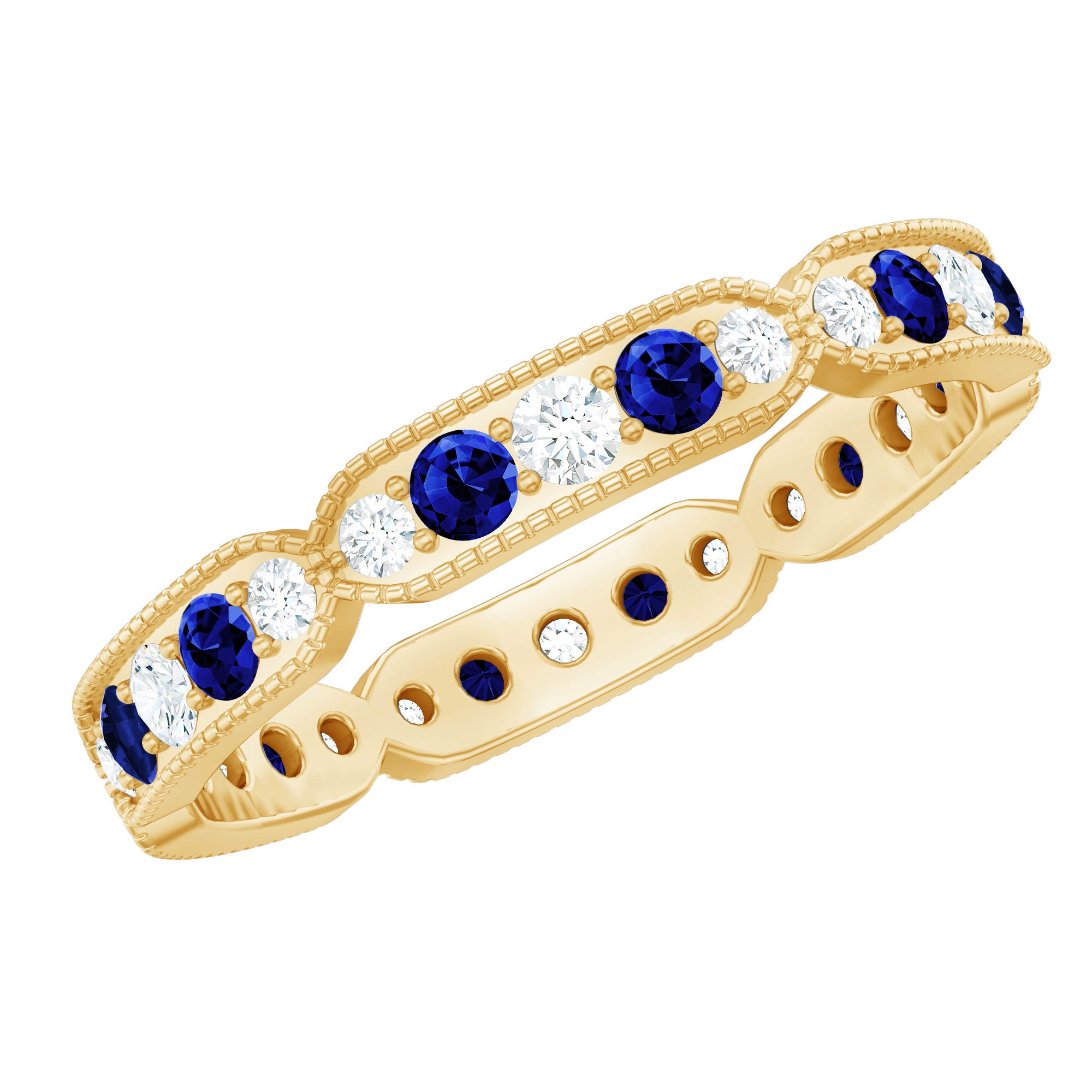 Make a bold fashion statement with this stunning eternity ring. Alternating Round Shape created blue sapphire and Diamond are set in a unique pattern with milgrain details, all set in a gold metal band. This ring is sure to turn heads and add a touch of elegance to any outfit.