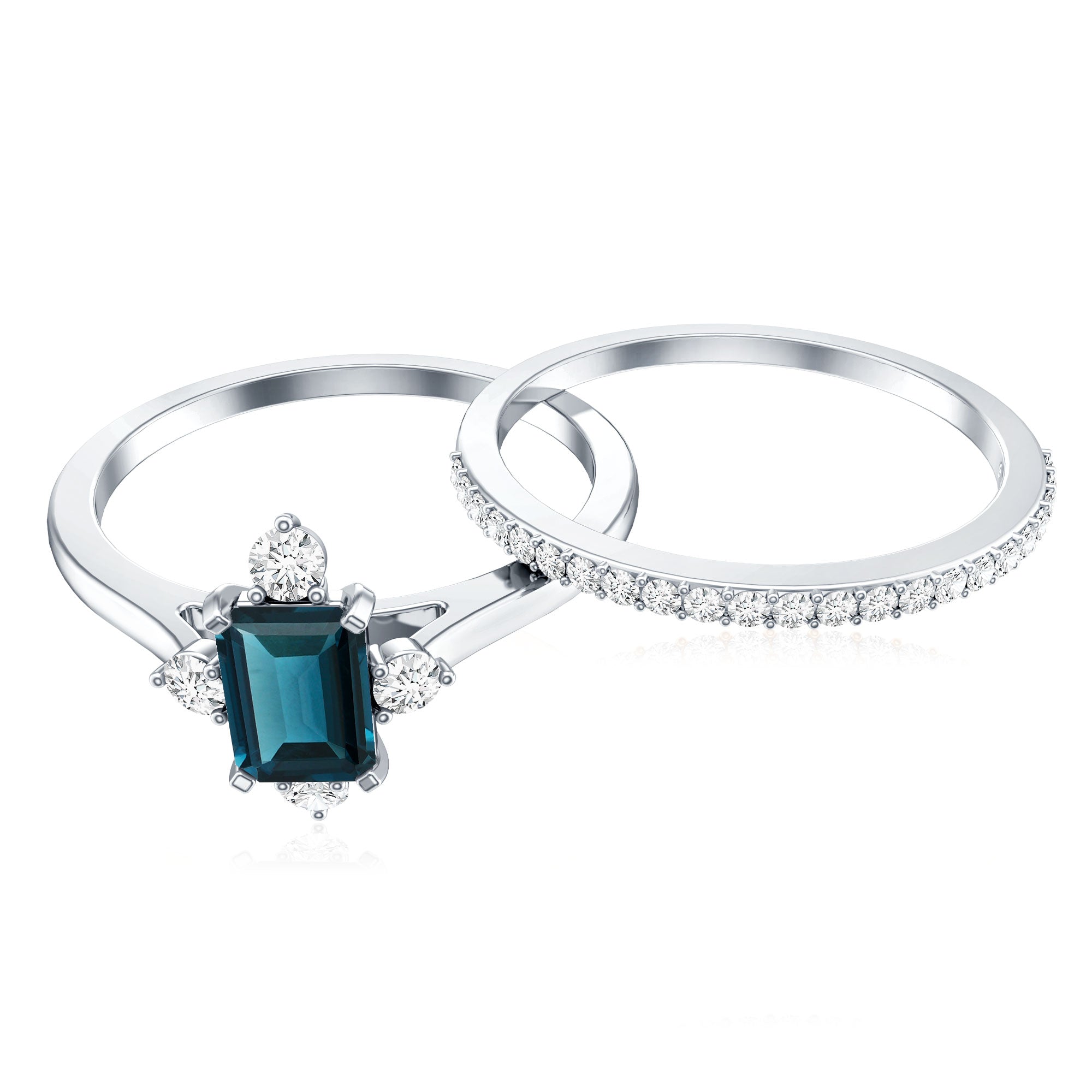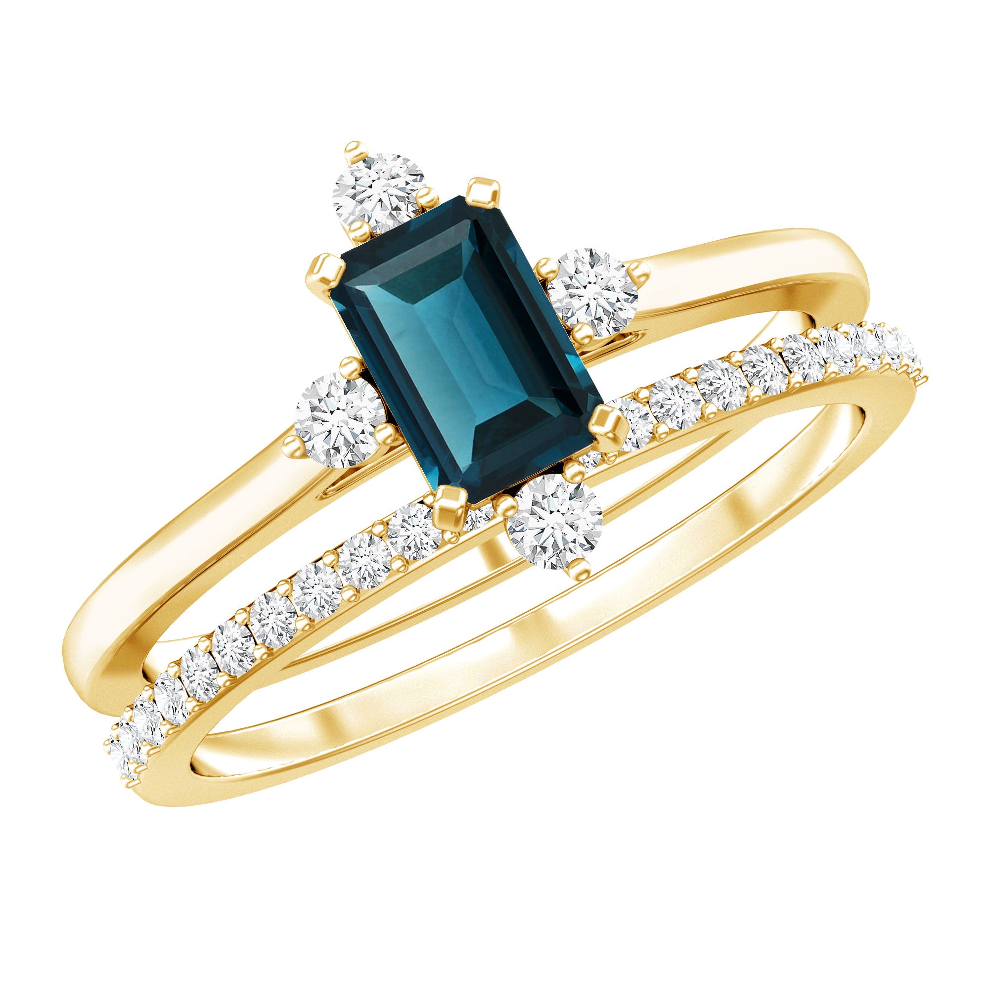 Mark a meaningful chapter in your love story with this beautifully designed Blue Topaz Wedding Ring Set, crafted to reflect elegance, strength, and connection. At the heart of the engagement ring is a 4X6 MM emerald cut London Blue Topaz, held securely in a prong setting. The engagement ring is accented with sparkling round diamonds, offering a delicate contrast that enhances the center stone. Paired with this is a matching wedding band, designed to align perfectly and sit beside the engagement ring. The band features a row of round diamonds, adding extra brilliance and tying both pieces together in harmony. Whether worn as a Bridal Wedding Ring Set or separately, each ring carries its own charm and elegance. The sleek, stackable design ensures everyday comfort while maintaining a refined, graceful look. Crafted with AAA quality london blue topaz and HI-SI quality diamonds, the stones are hand-selected for their brilliance and quality. Available in US sizes 3 to 13, the London Blue Topaz Ring Set is made to fit comfortably and last through every moment. This piece comes packaged in an elegant jewelry box and includes a certificate of authenticity for added confidence. Timeless and modern all at once, this Engagement Ring with Wedding Band Set is a beautiful reminder of the bond you share and the future you are building together.
