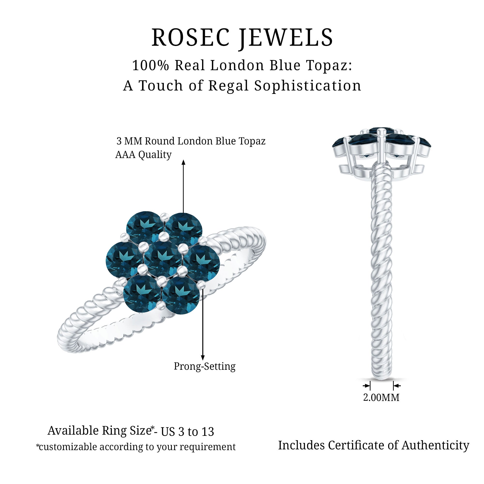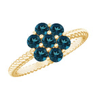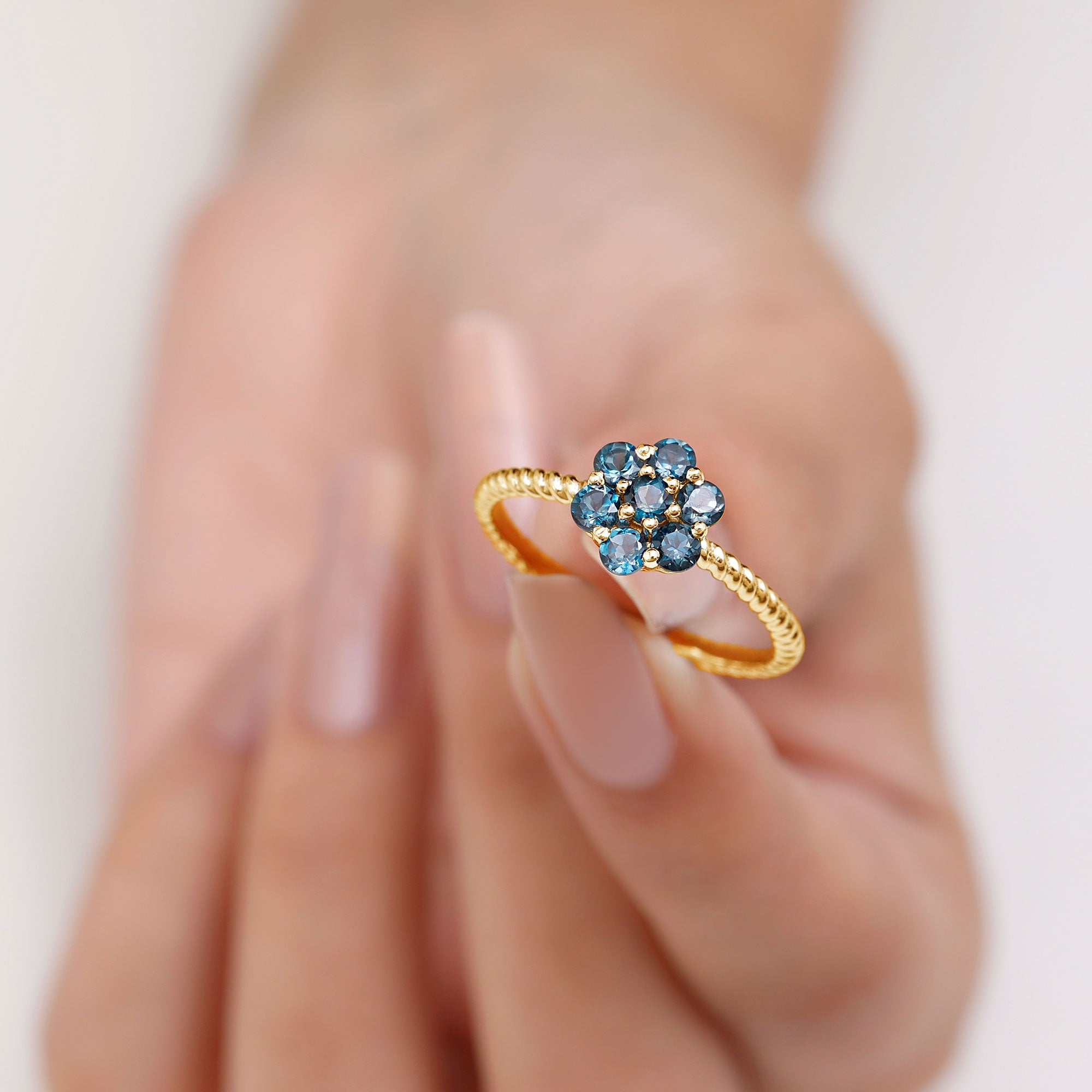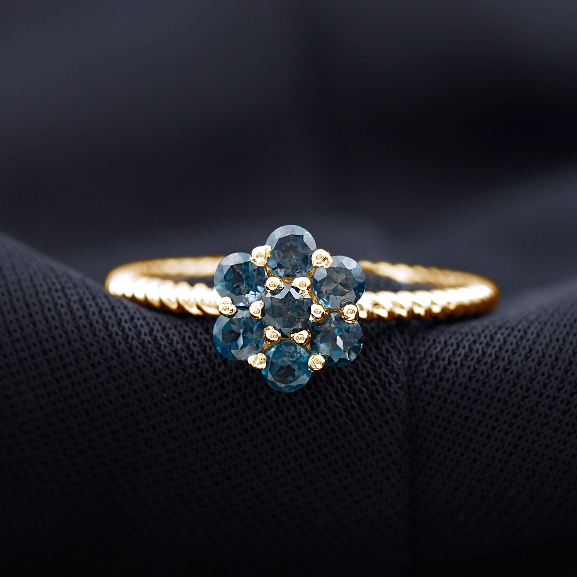 Allow your affection to flourish with this exquisitely designed Flower Engagement Ring, a captivating piece inspired by the beauty of nature and filled with genuine sparkle. At the heart of the design lies a delicate arrangement of round-shaped london blue topaz, organized in a floral motif that represents new beginnings and the blossoming of love. Each stone boasts AAA quality, providing a brilliant sparkle that illuminates the entire Floral Ring. Enhancing its allure is the twisted rope style band, which adds a hint of vintage sophistication and unique texture. This subtle feature imparts a handcrafted essence to the London Blue Topaz Engagement Ring, distinguishing it from conventional designs. The cluster style also offers a larger, more striking appearance while ensuring the ring remains lightweight and comfortable for daily wear. Meticulously crafted for those who appreciate beauty and significance, this Blue Topaz Flower Ring is an exquisite option for proposals, anniversaries, or even as a special gift for oneself. It is available in a variety of metal colors and purity options and is presented in an elegant jewelry box, ready for gifting or personal enjoyment. Romantic, elegant, and refreshingly unique, this Womens Engagement Ring is designed for the individual who believes in love that deepens over time, much like a flourishing garden.