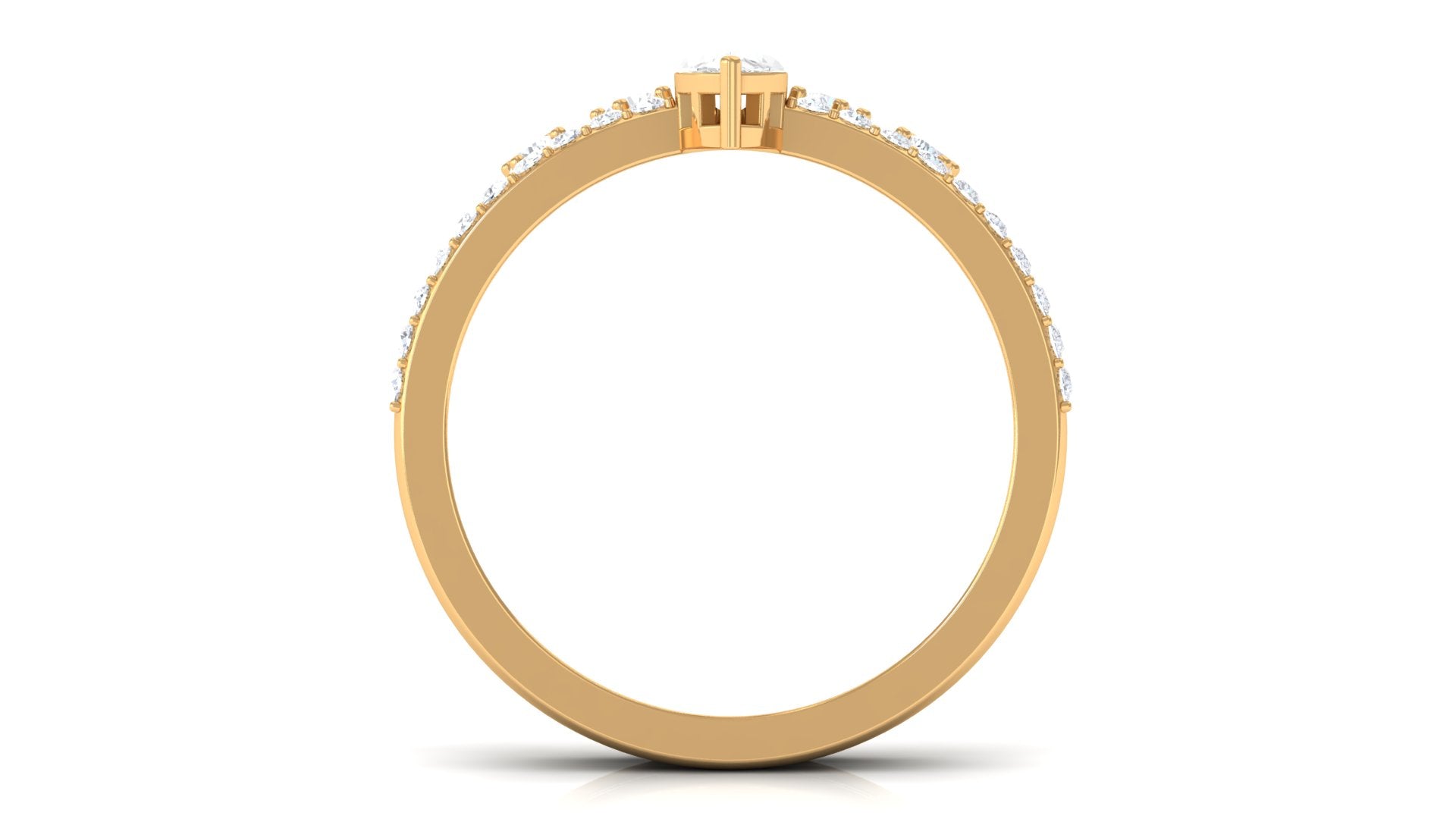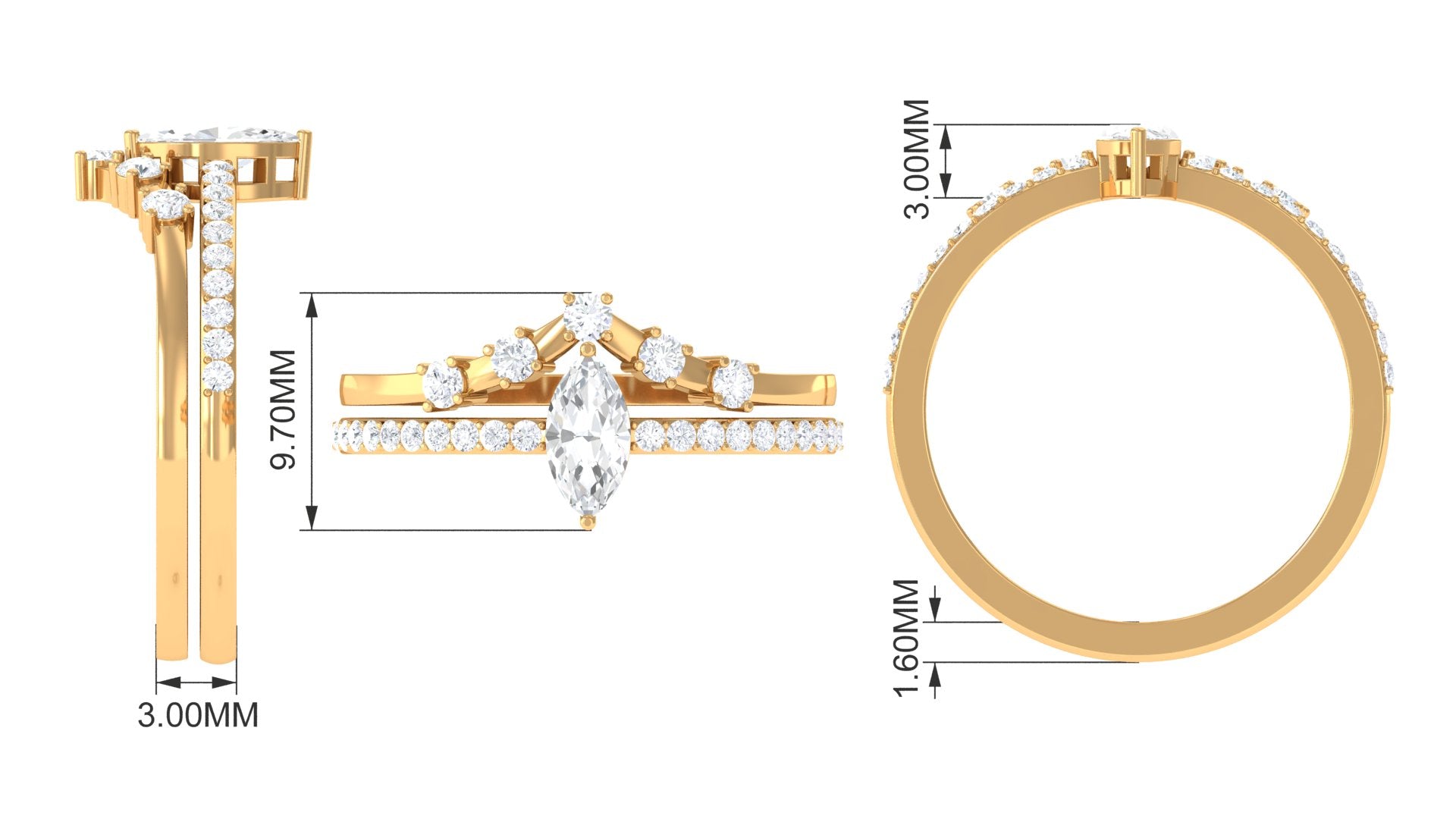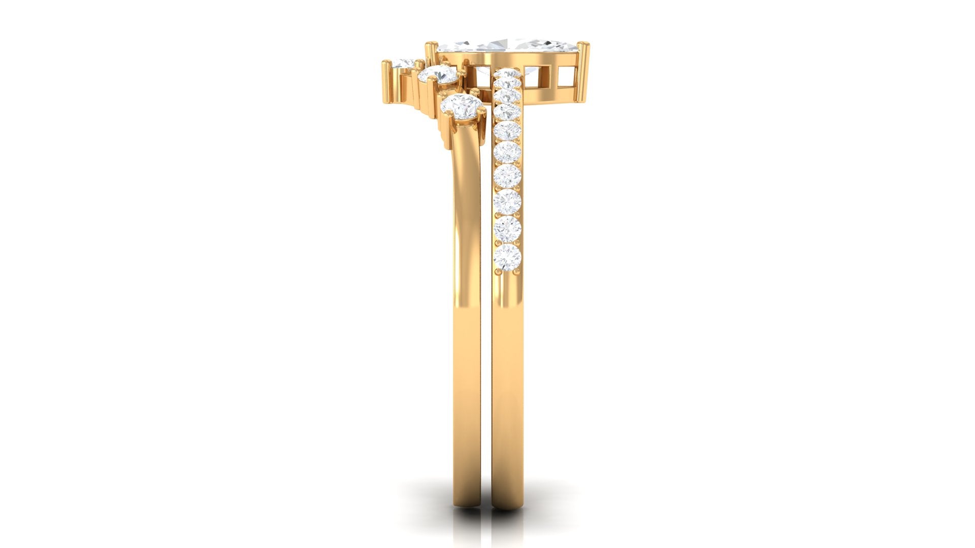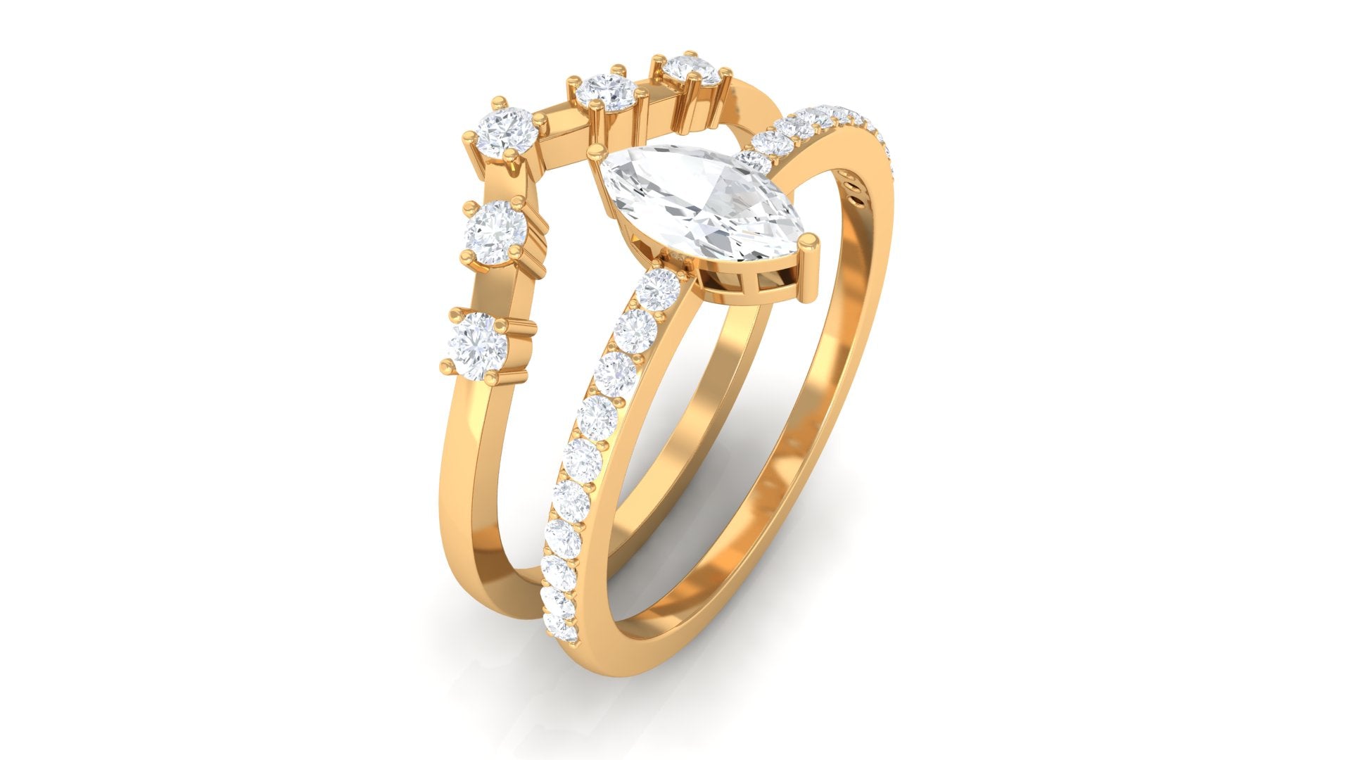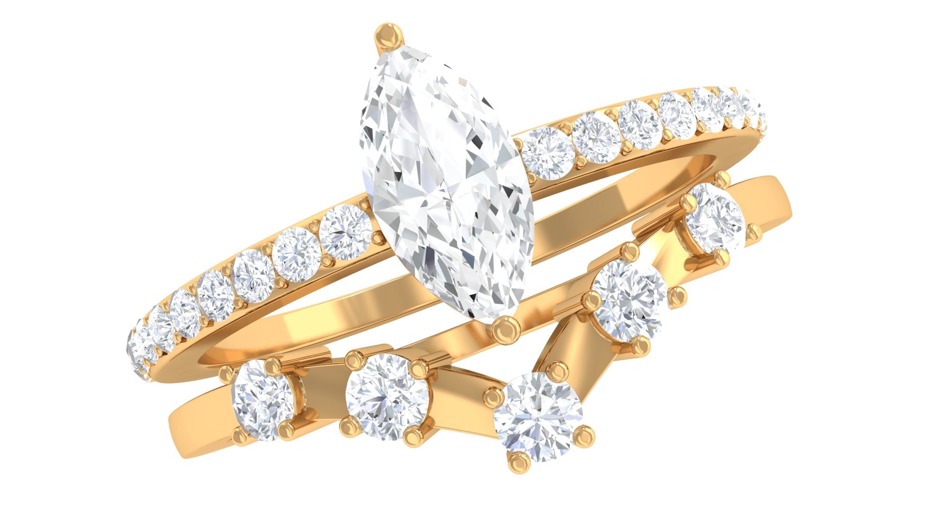 Marquise Cut Zircon is glistening in the center of this zircon encrusted band and another band of this ring set is embellished with round zircon, held in prong setting in a chevron band. This Zircon Bridal Ring Set is crafted in Gold for luxurious appeal.