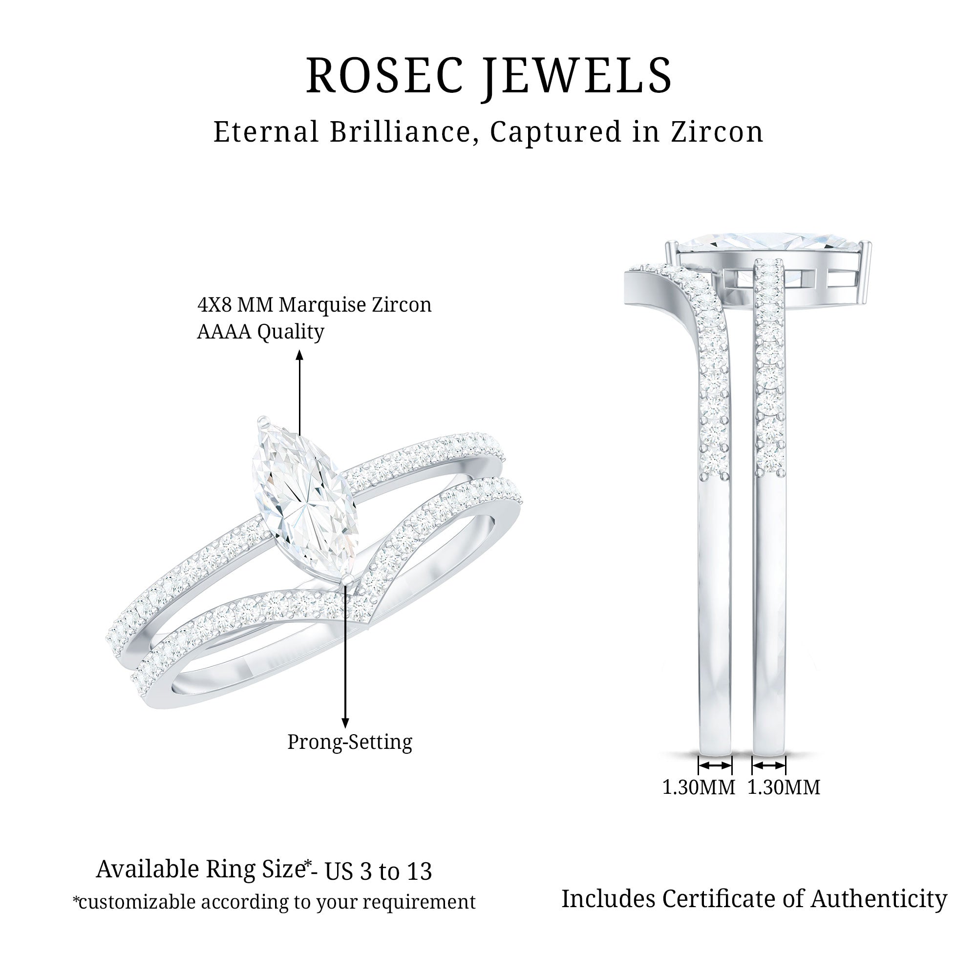 Bridal Ring Set is embellished with Marquise Cut Zircon, held in 2 Prong Setting beautifully and other zircon are arranged as side stones. The other chevron band is accentuated with zircon as well. This Cubic Zirconia Ring Set is an alluring piece of fine jewelry. Get it for your lady and win her heart.