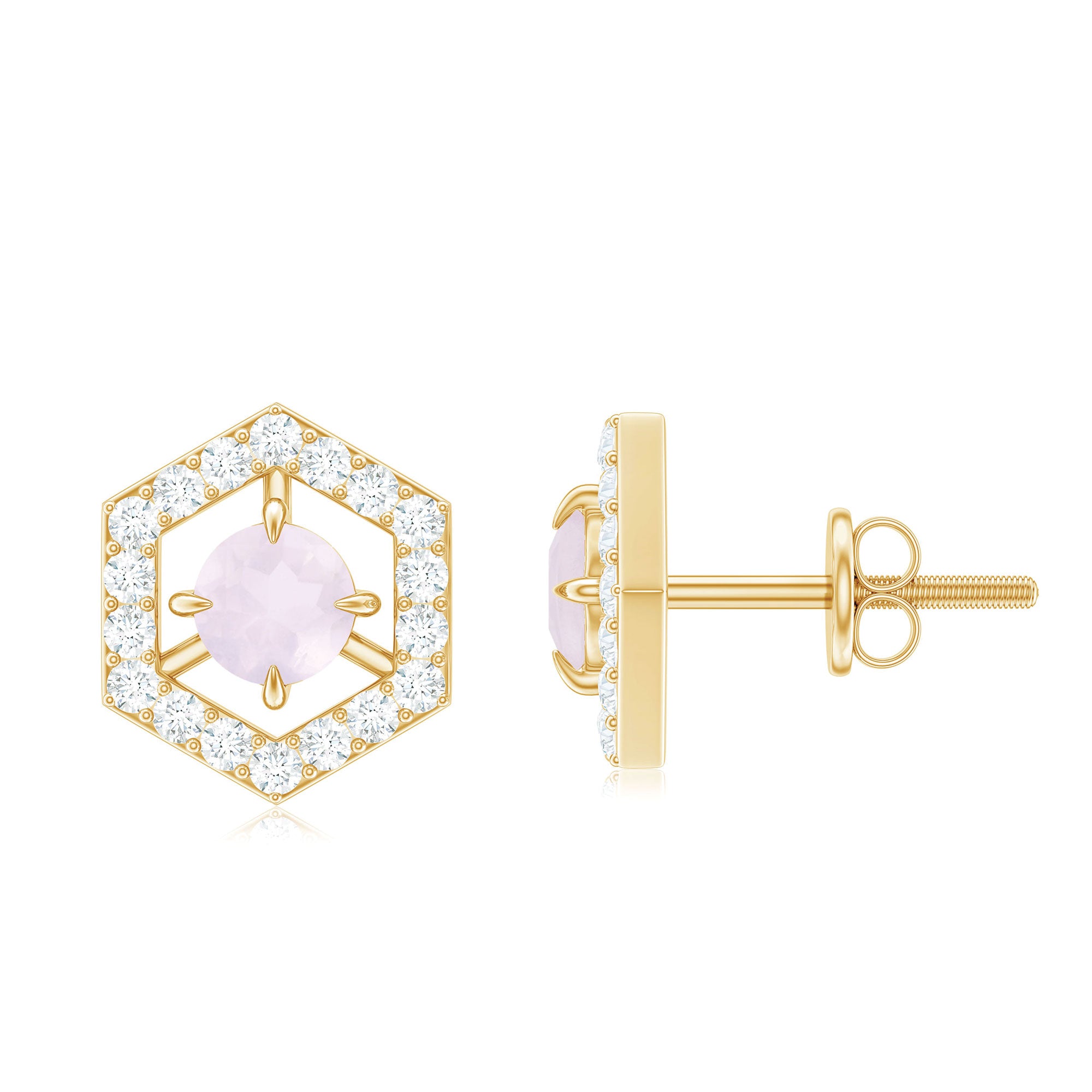 Feel unique with these Geometric Stud Earrings, adorned with Round Shape Rose Quartz Gemstone set as a center stone with Diamond Accent. These Minimal Stud Earrings are crafted in Solid Gold