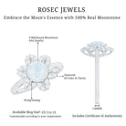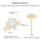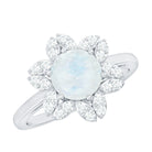 Ask for her hand with this enchanting Flower Engagement Ring. Fashioned in Gold, this brilliant style features a Round Moonstone center stone bordered with a Flower-Shaped frame of smaller accent Diamond.