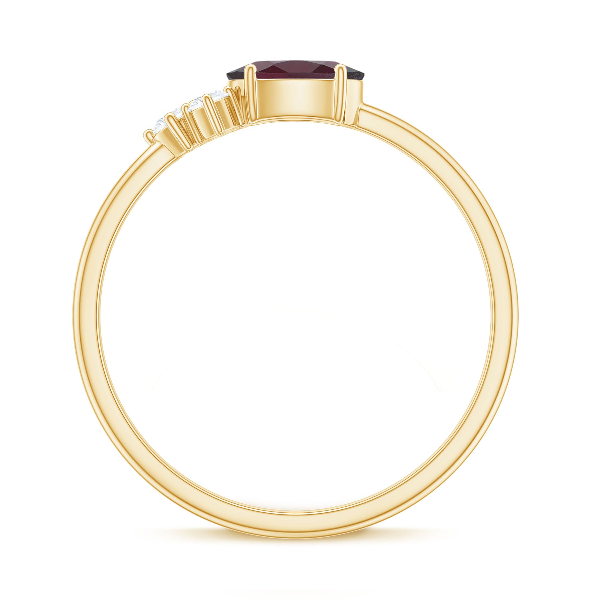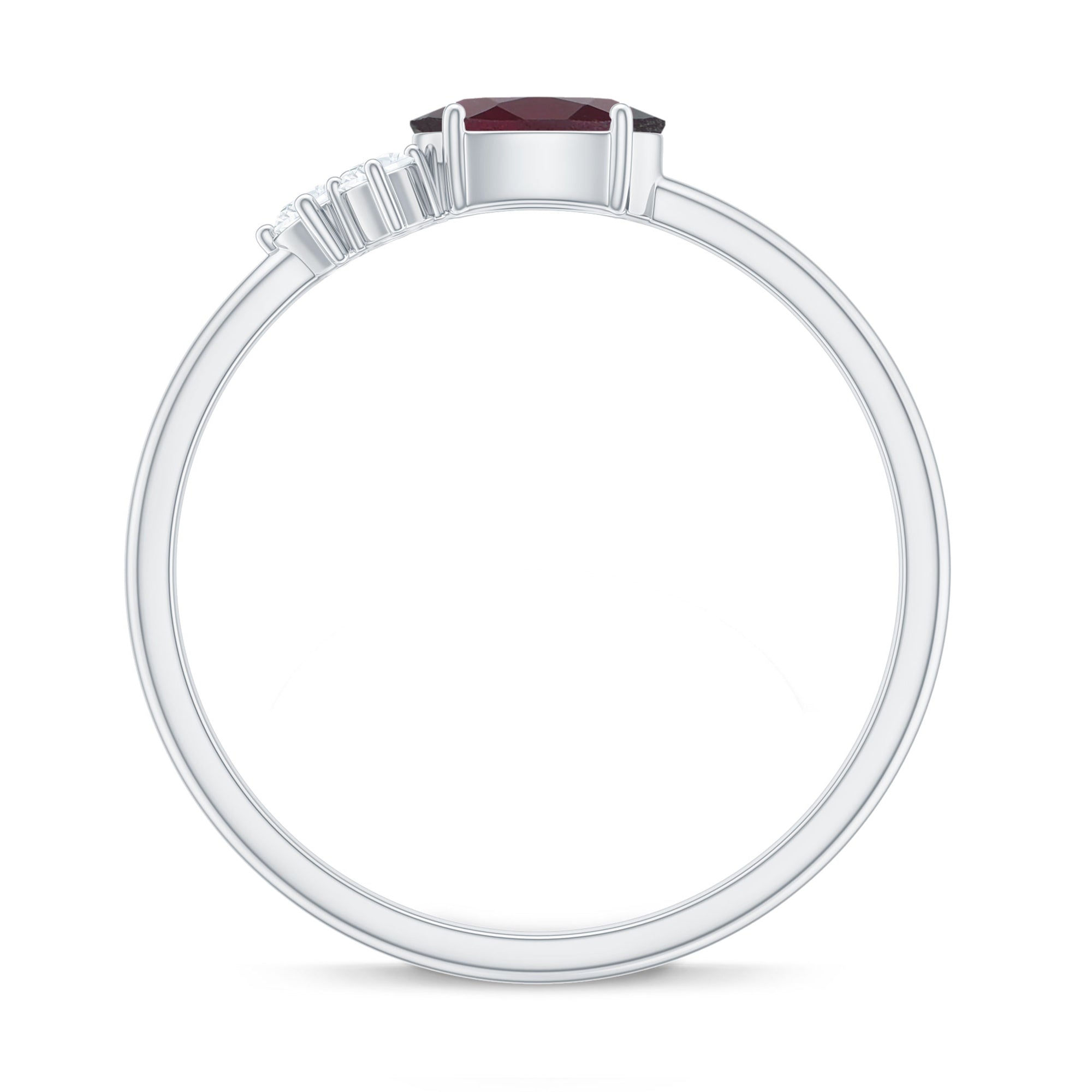 Make her feel special this Valentines Day with a promise ring featuring an oval Rhodolite solitaire in a prong setting, accented by a trio of round Diamond.