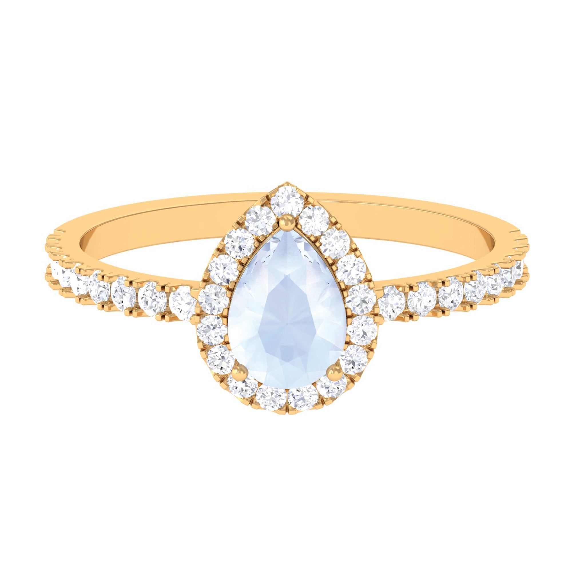 Embark the new journey of your life with this beautiful Engagement Ring adorned with Pear Cut Moonstone Solitaire with a Halo of petite Round Shape Diamonds with Side Stones. This Simple Engagement Ring is crafted with Solid Gold to make for a luxe choice for your special day.
