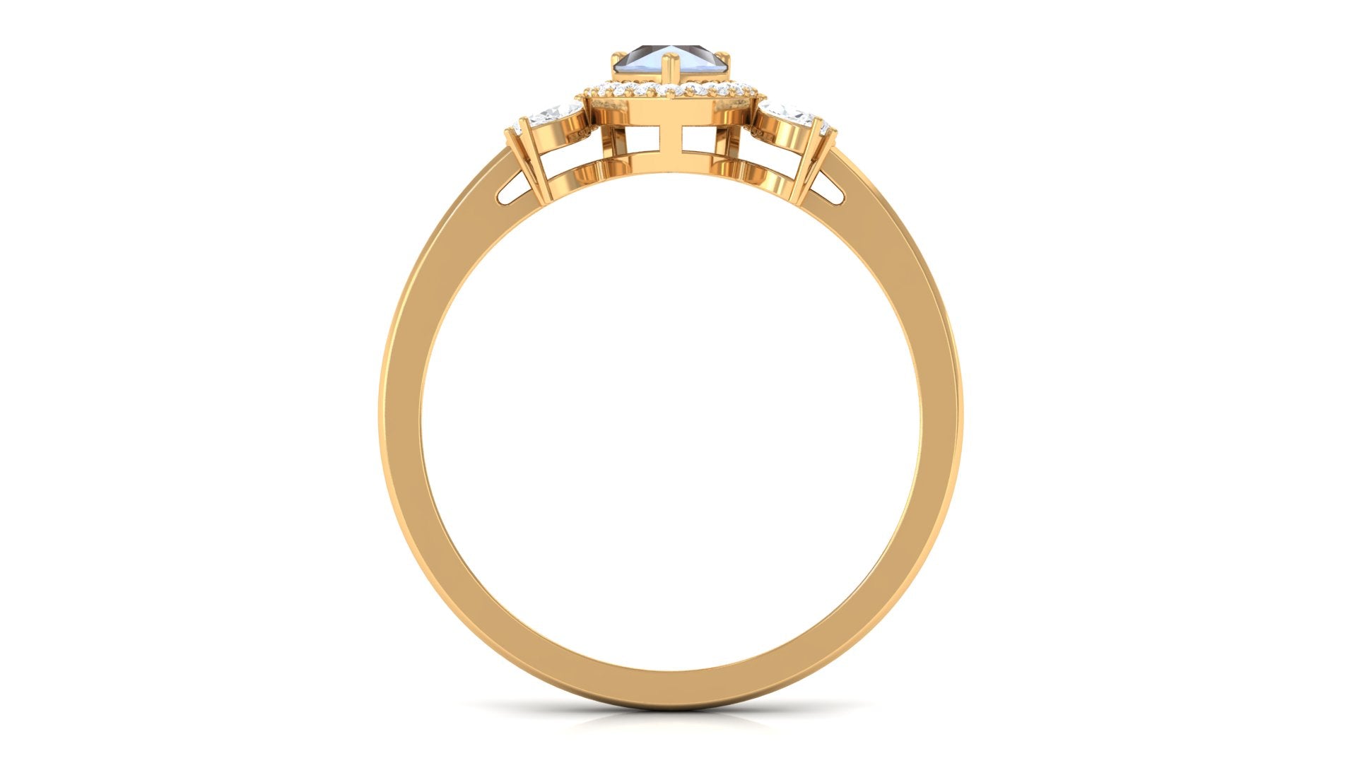 This beautiful engagement ring features a stunning pear shaped Moonstone center stone that is sure to captivate the eye. The Moonstone is complemented by sparkling round Diamond halo and pear and marquise shape Diamond trio on either side, adding extra brilliance and fire to the design. This elegant and feminine design is perfect for those seeking a unique and romantic piece of jewelry.