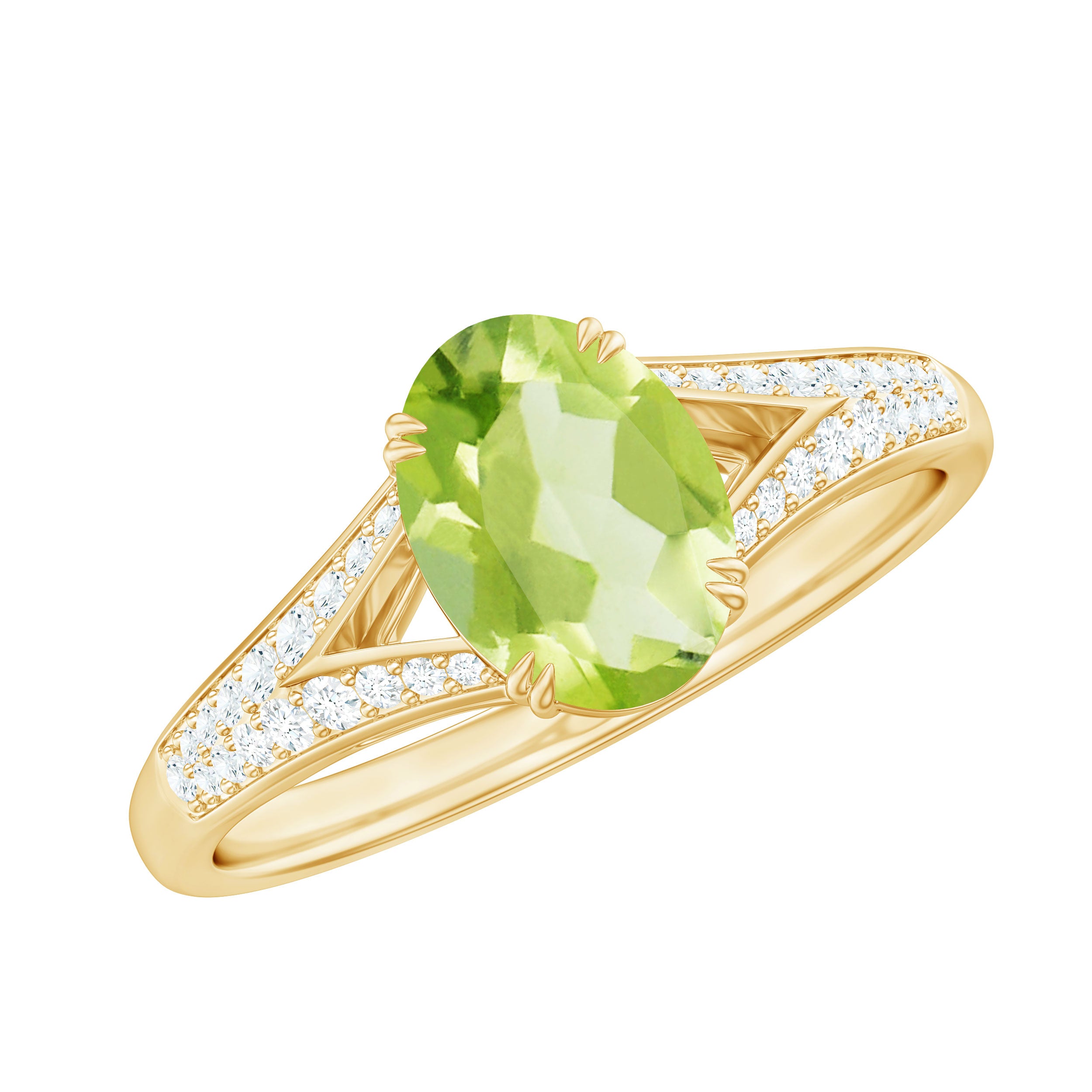 Let her know how much you adore her by surprising her with this alluring Solitaire Engagement Ring adorned with Oval Cut Peridot in Double Claw Prong Setting while the shimmering Diamond Stones are studded over the mesmerizing Split Shank. This Peridot and Diamond Ring will be a perfect choice for your lady love. She will adore this Peridot Engagement Ring her whole life as it symbolizes your eternal love for her.