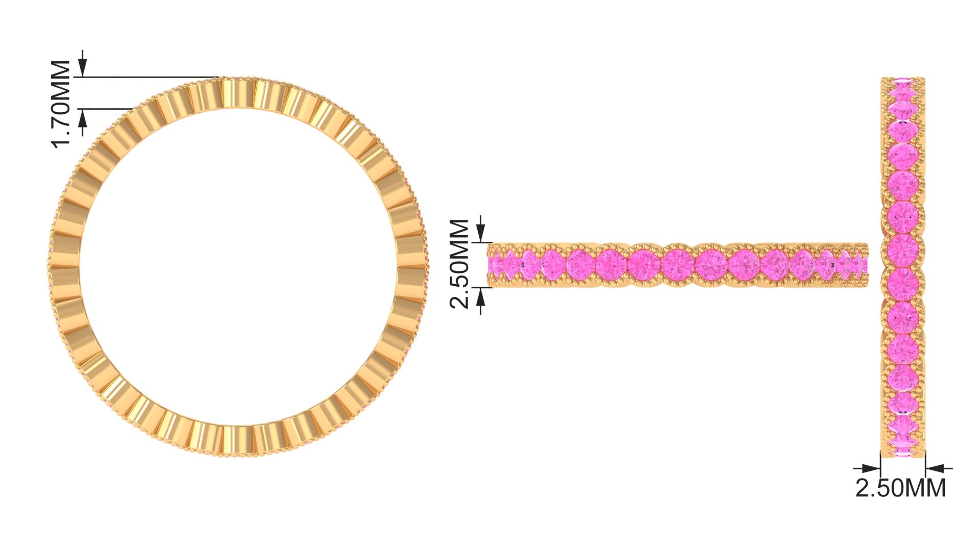 This Full Eternity Band with Milgrain Details is embellished with Round Shape Pink Sapphire Gemstones are set on the full band in Half Bezel Setting, crafted in a Solid Gold.