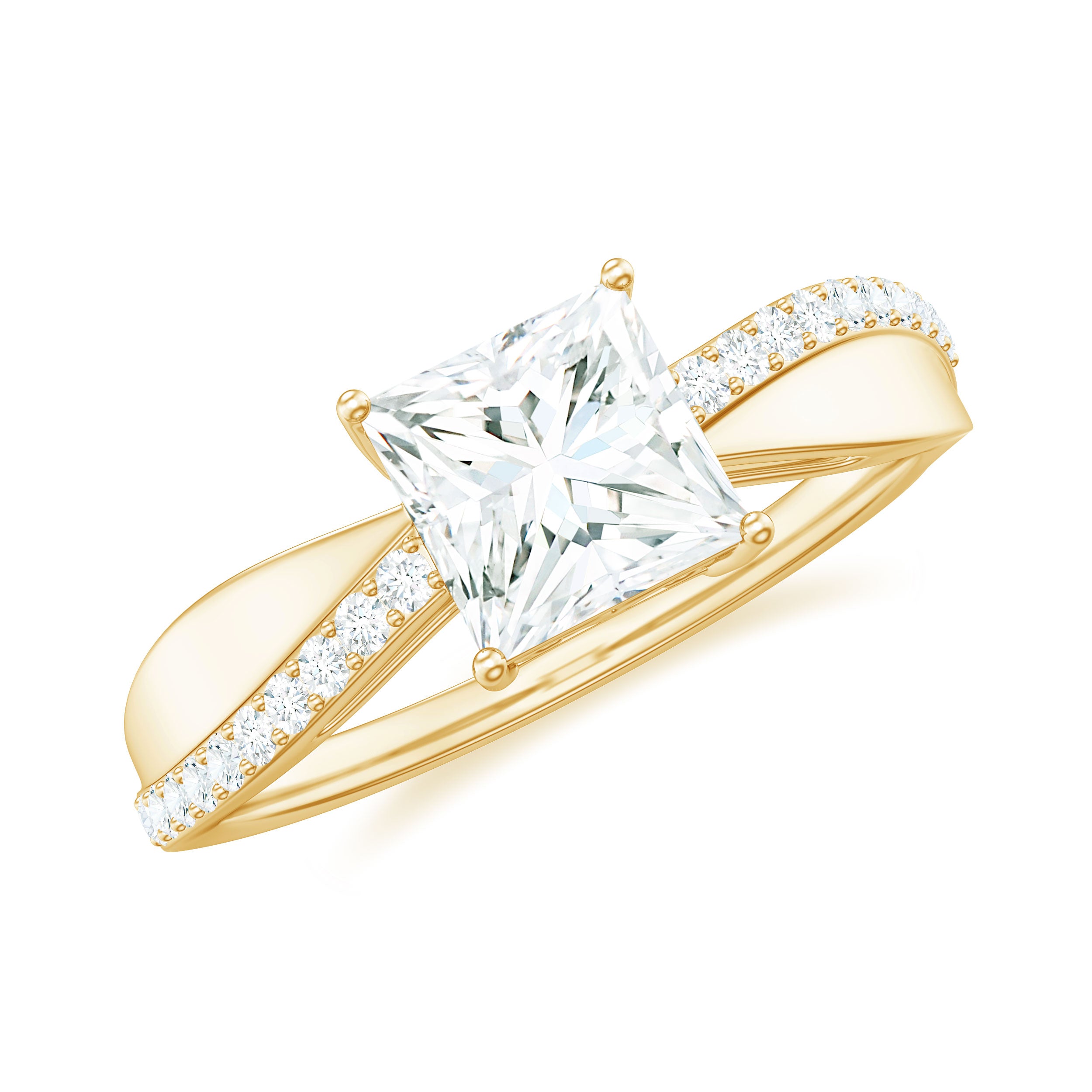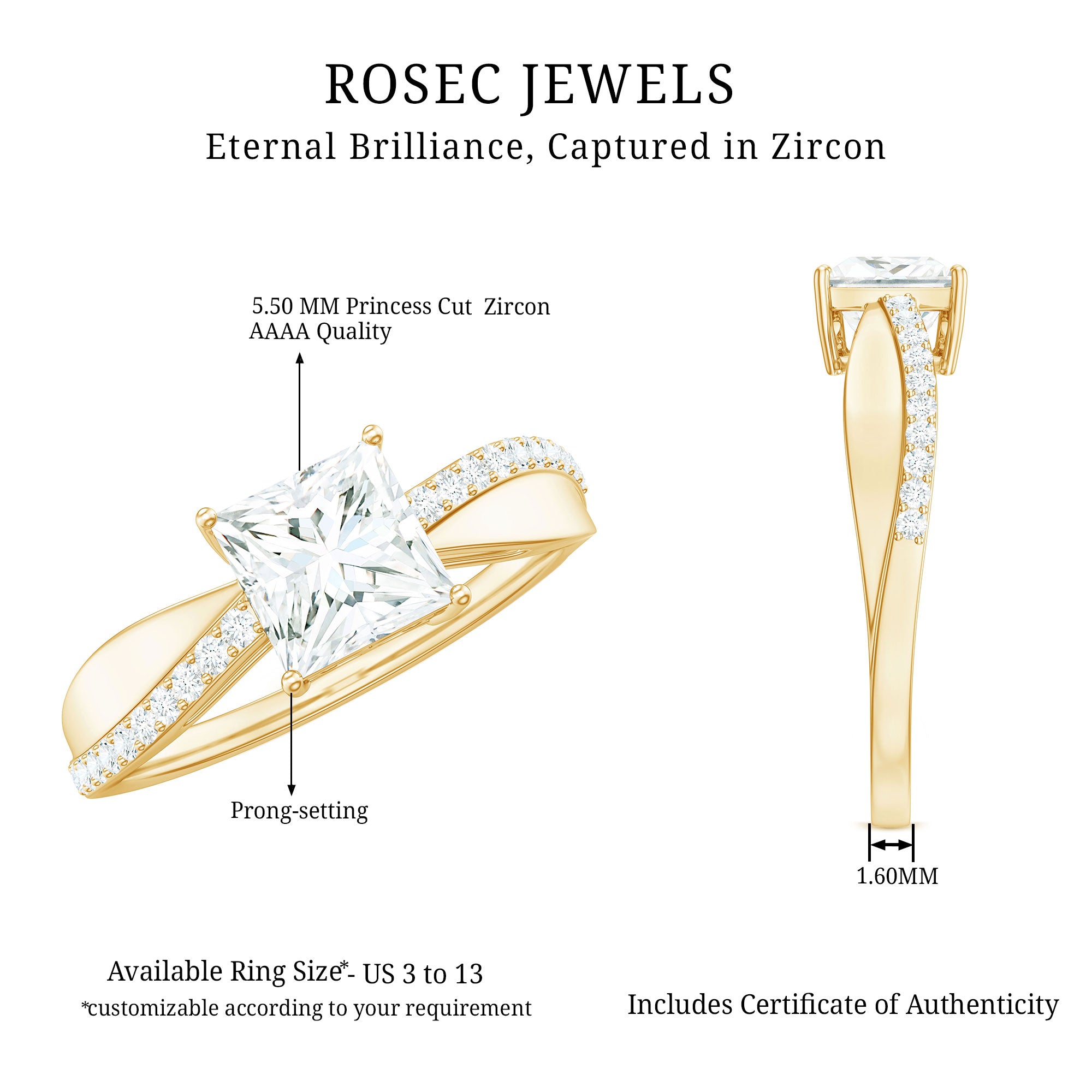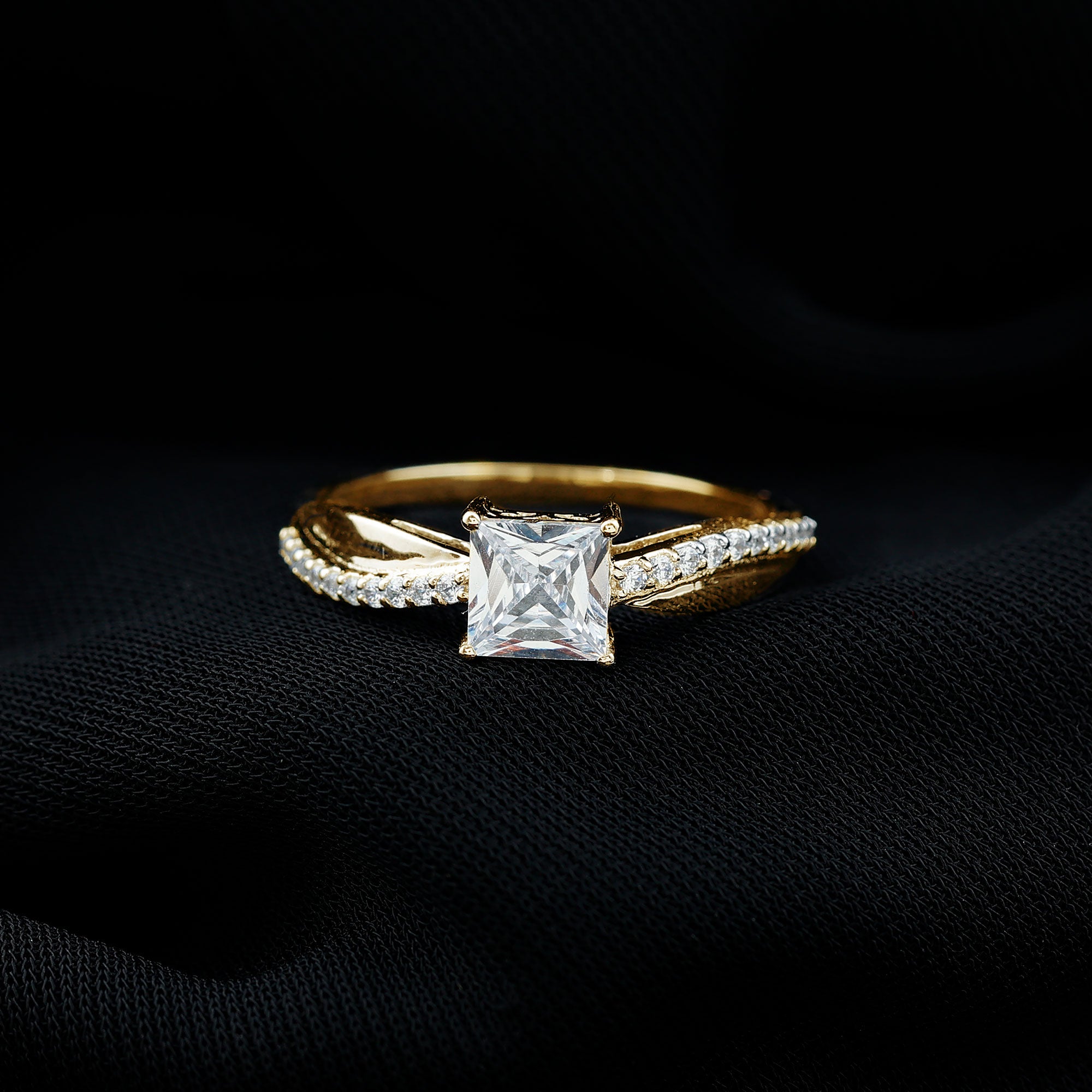 Feel uplifted everyday with this Solitaire Zircon Ring. This beautiful Gold Ring is adorned with Princess Cut Cubic Zircon in the Center in 4 Prong Setting with Round Cut zircon on the shank in twisted design. Its classic and sparkling appearance makes it a first choice among working and young women.