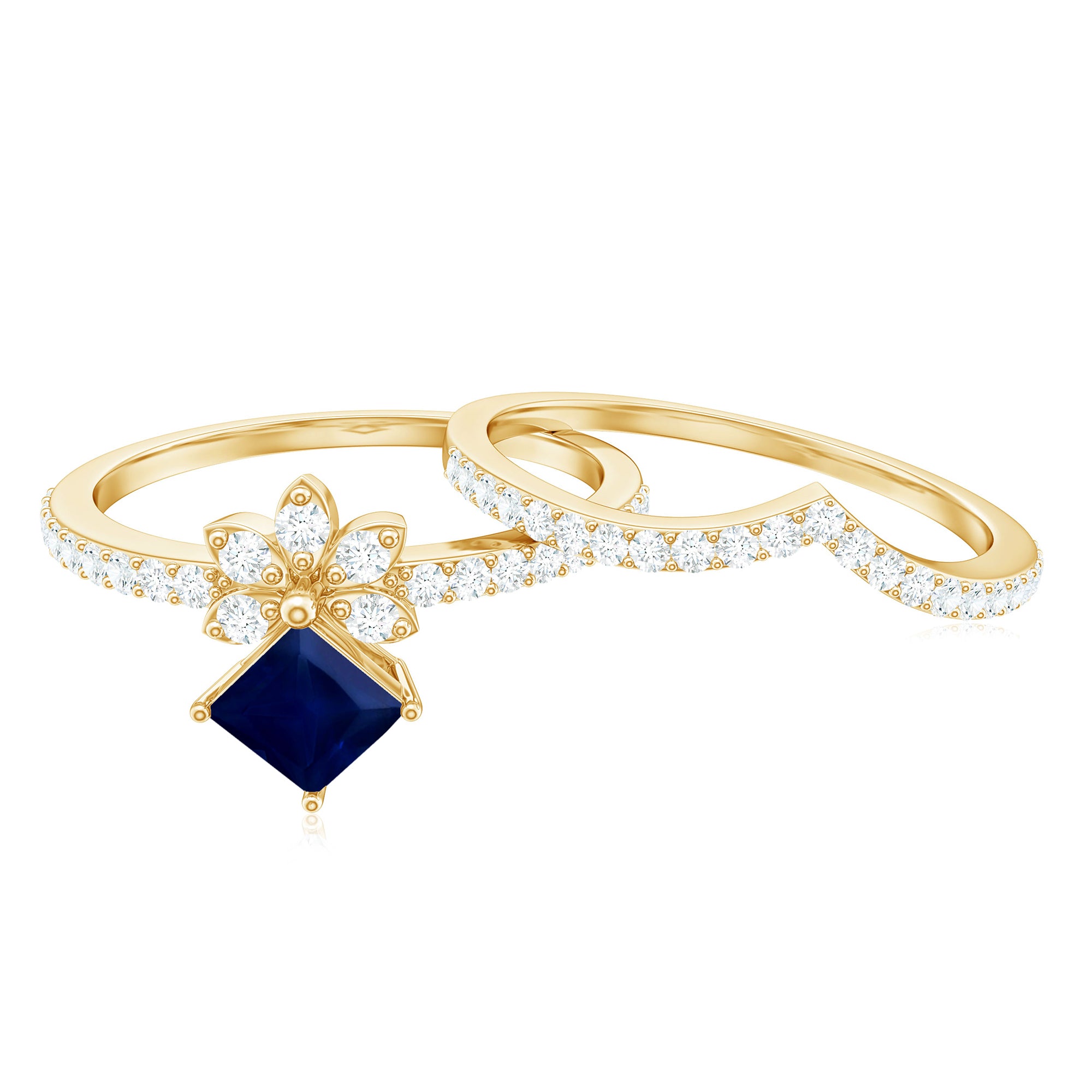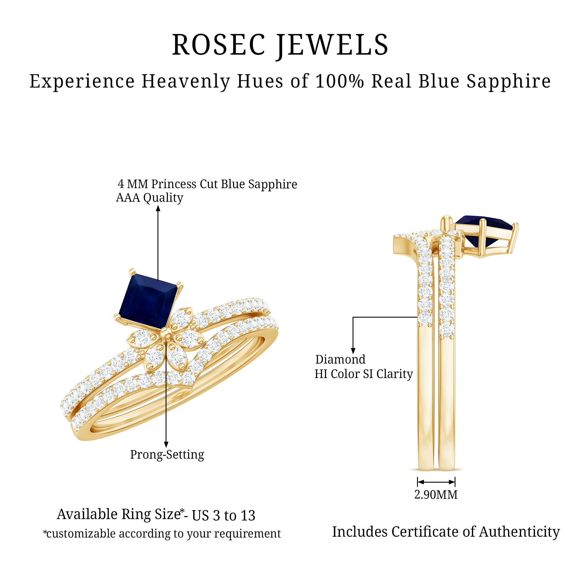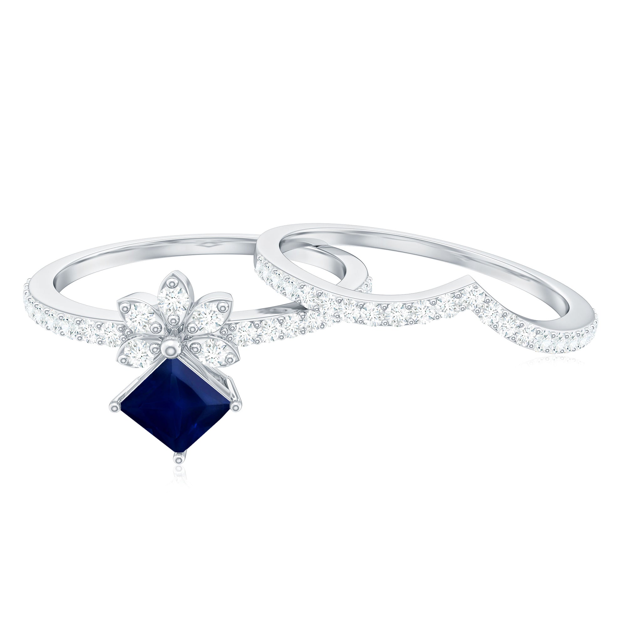 Princess Cut Solitaire Blue Sapphire and Diamond Designer Ring Set