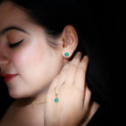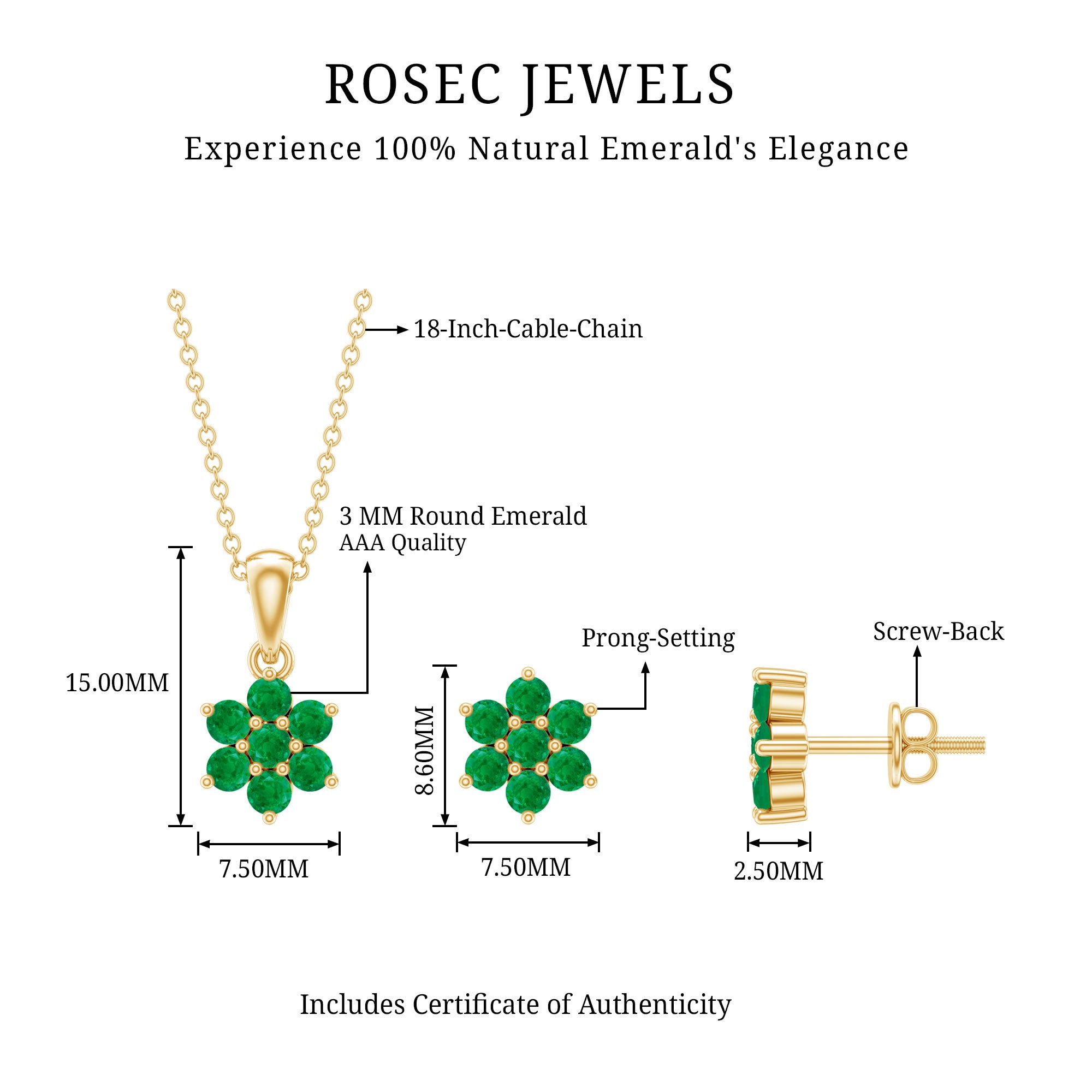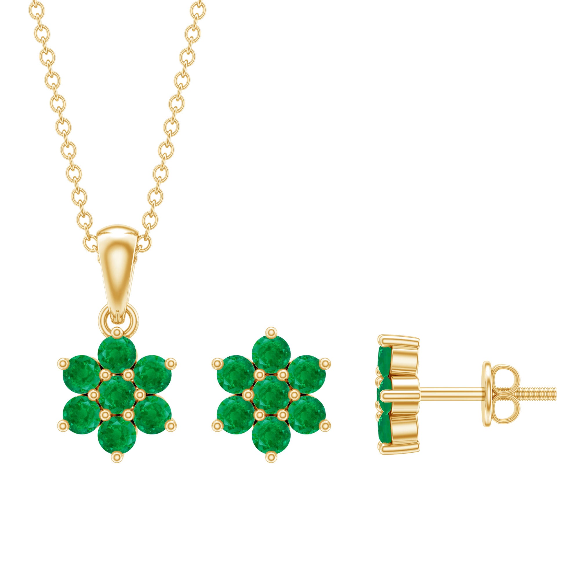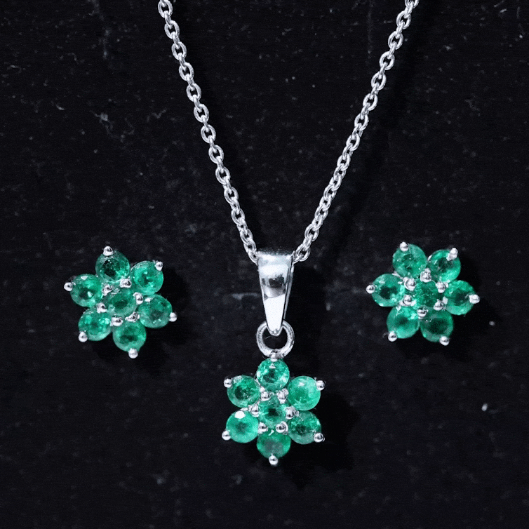 Gracefully created, this Floral Jewelry Set is adorned with Round Cut Emerald in Prong Setting to complement your outfit. It gives a luxurious appeal to this Pendant and Earring Set that a woman can wear on any occasion.