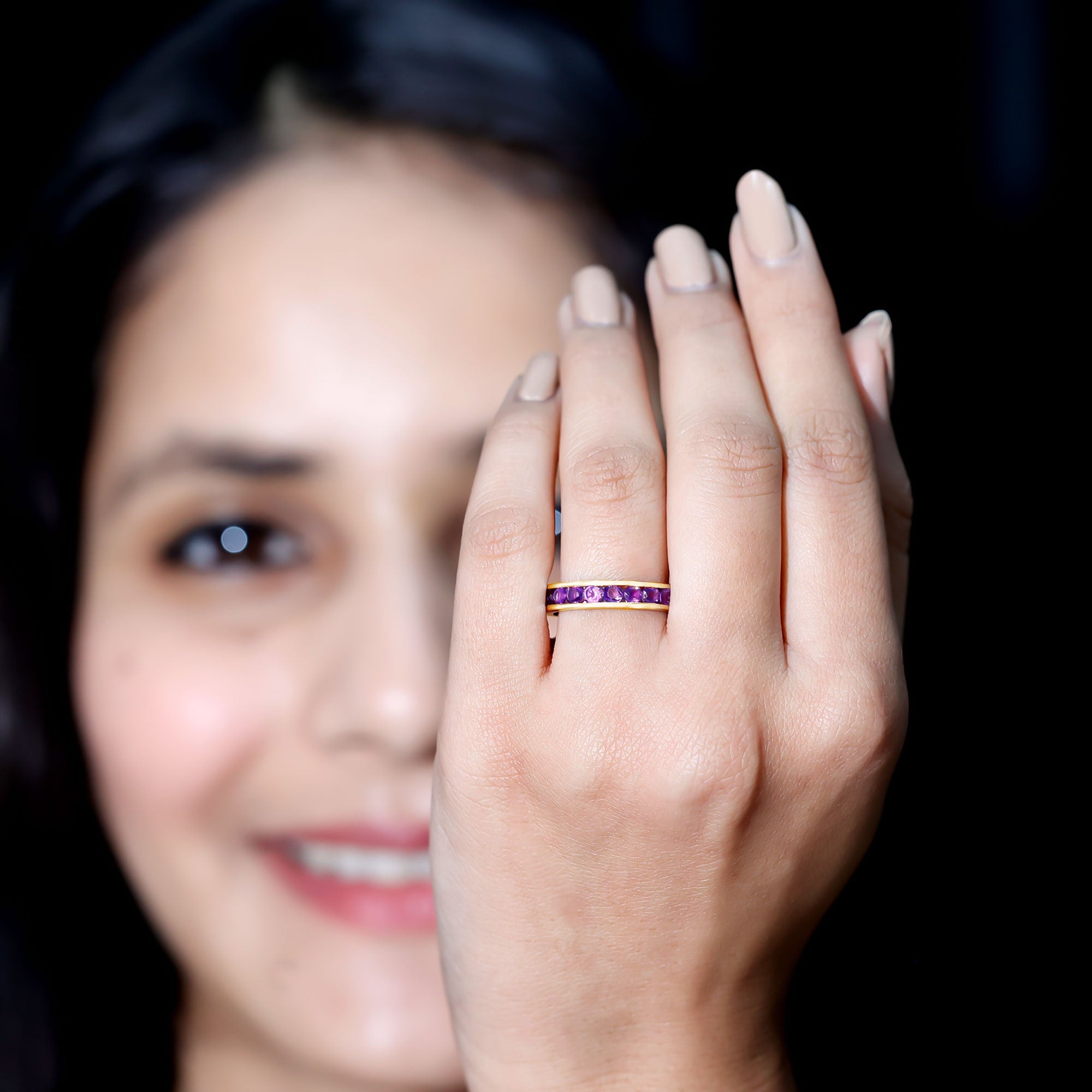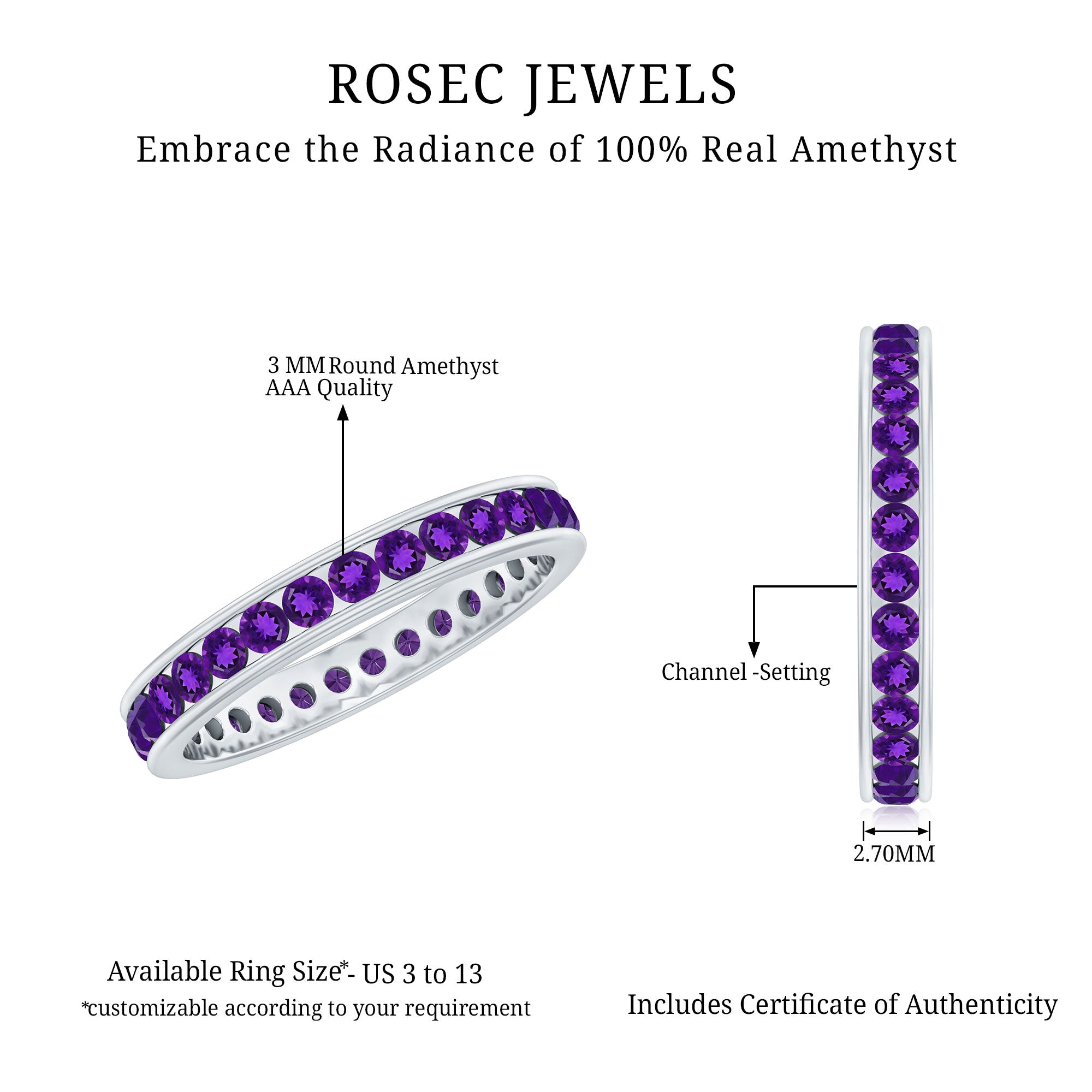 This Outstanding and Classic Full Eternity Band is embellished with Brilliant round shape Amethyst and is beautifully engraved in the channel setting on the band ring.