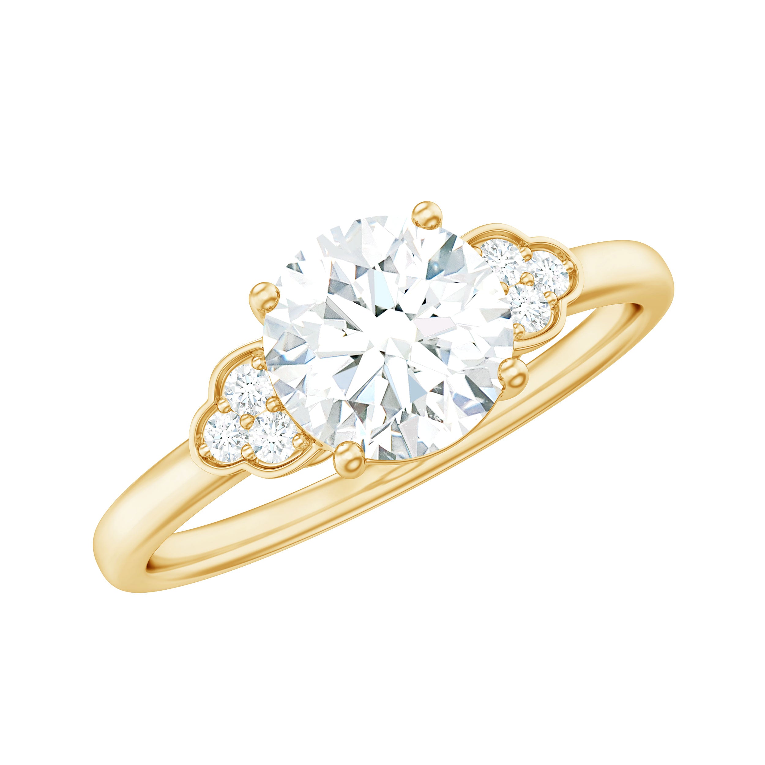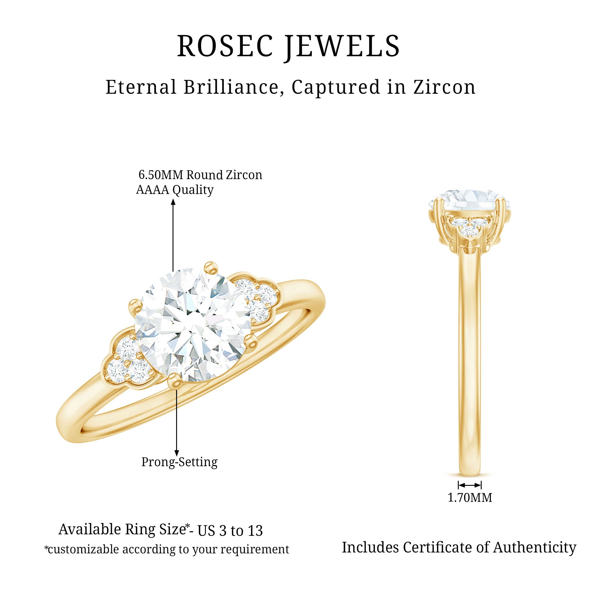 This classic engagement ring features a round zircon as its centerpiece, accented by a trio of shimmering zircon stones on each side. The zircon stones add extra sparkle and shine to the ring, creating a beautiful and elegant design. The ring is crafted with gold metal to ensure longevity and durability, making it a cherished piece for years to come. This engagement ring is perfect for a bride-to-be who appreciates classic style with a modern twist.