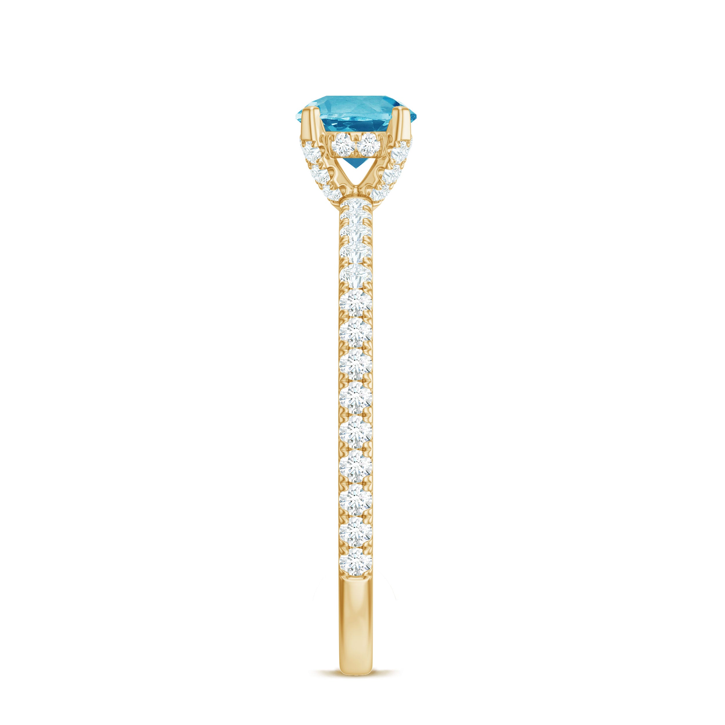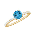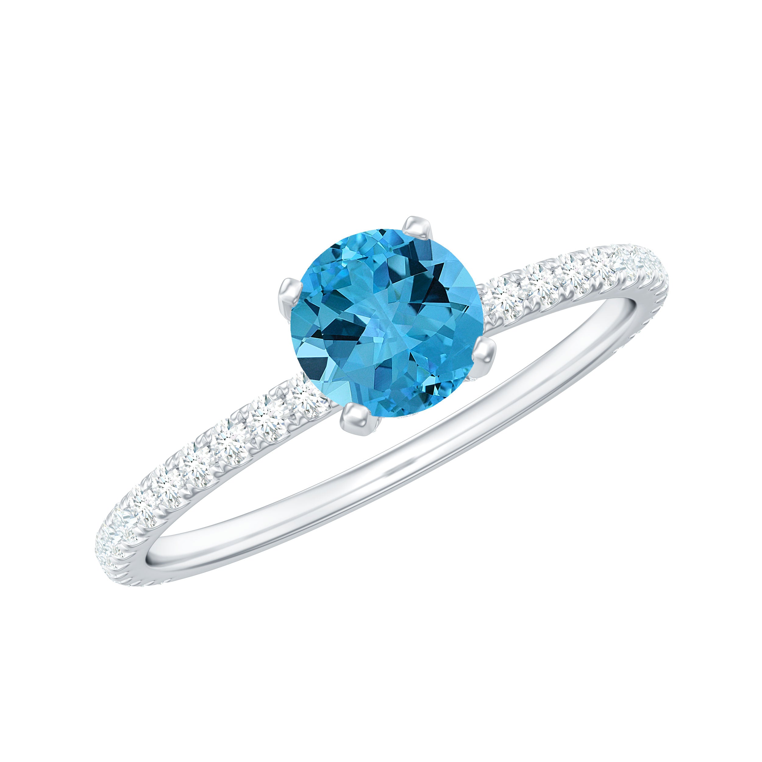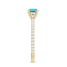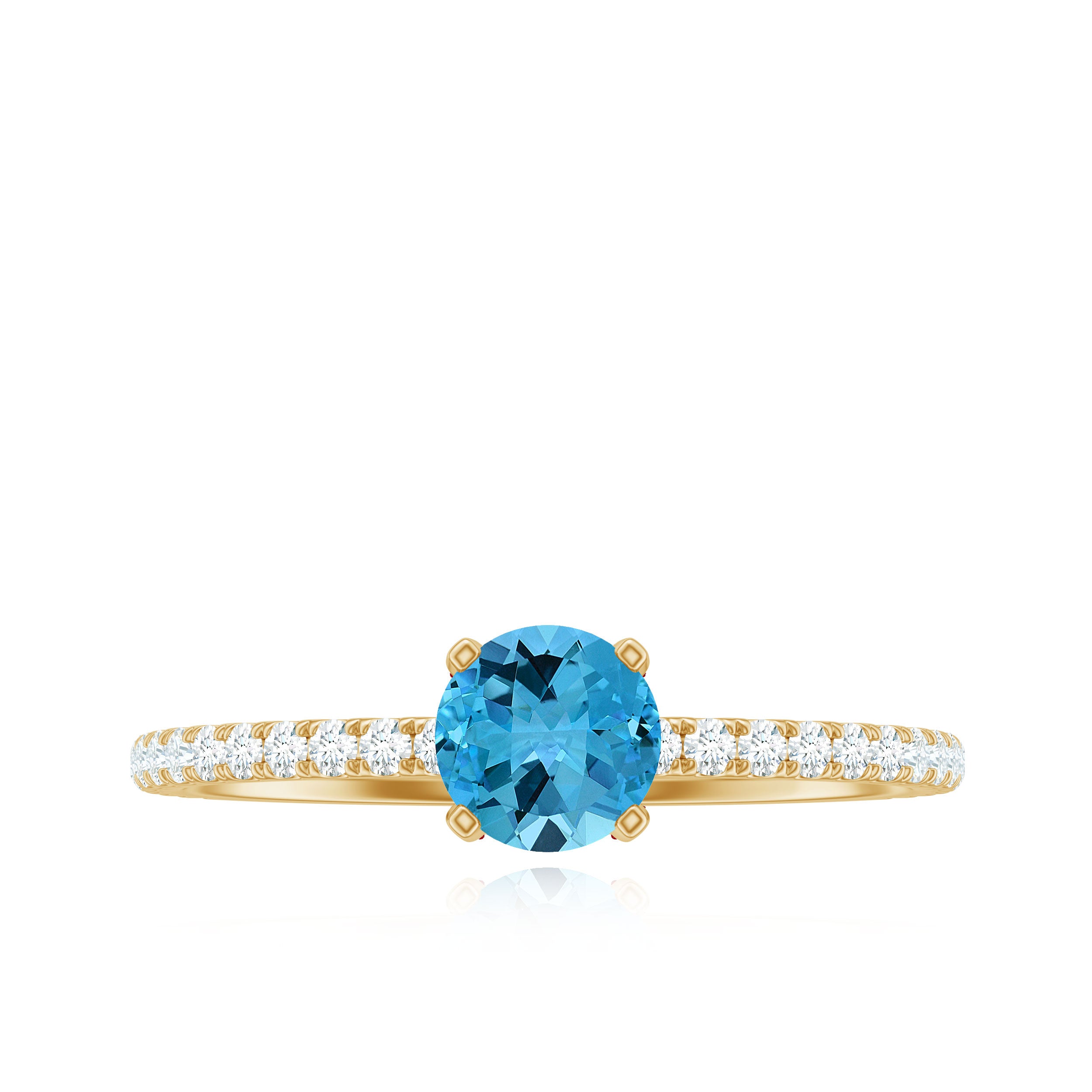 This Gold Ring consists of Round Shape Swiss Blue Topaz as Solitaire embellished in Prong Setting with Round Shape Diamond stones as Side Stones embellished in Pave Setting for Women.