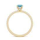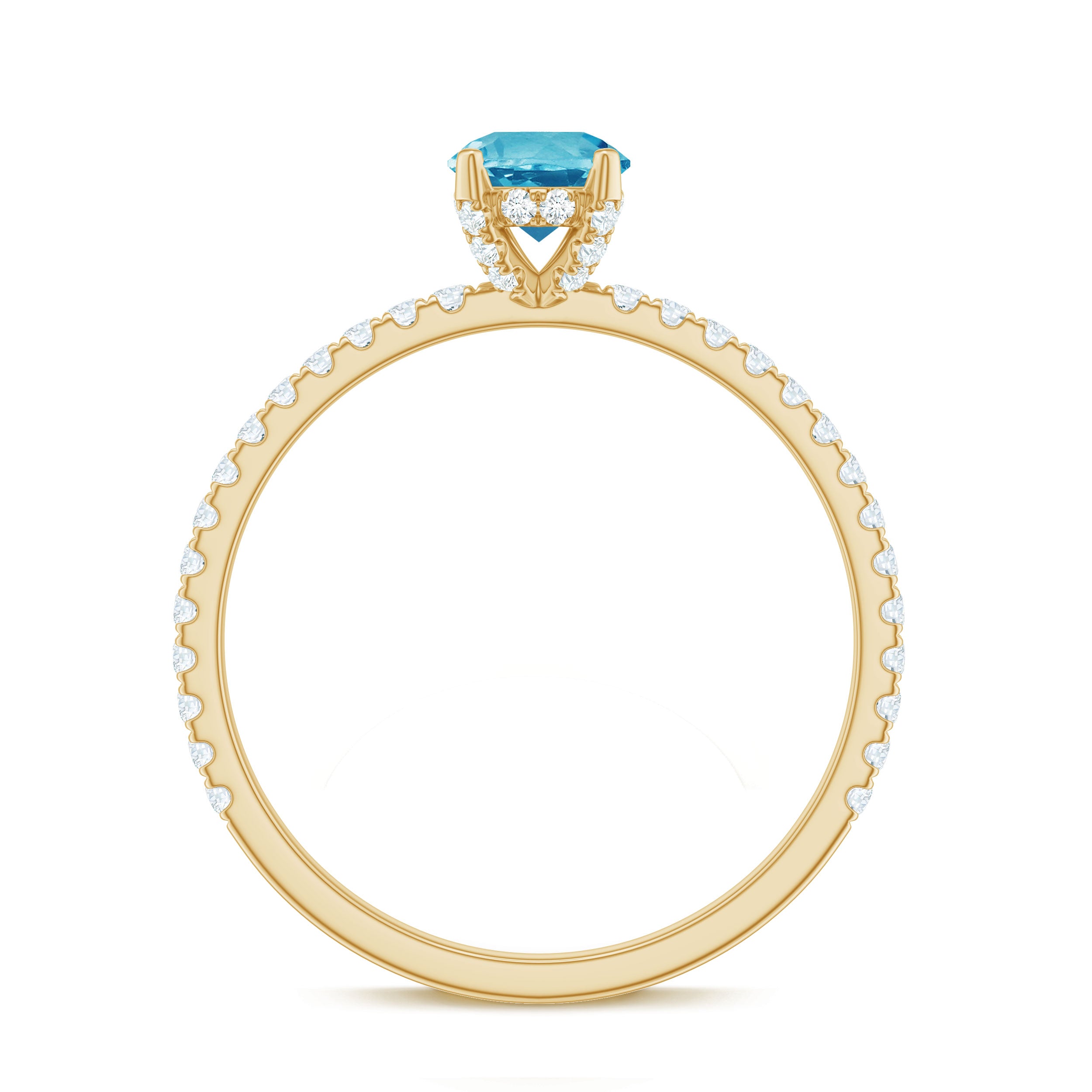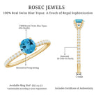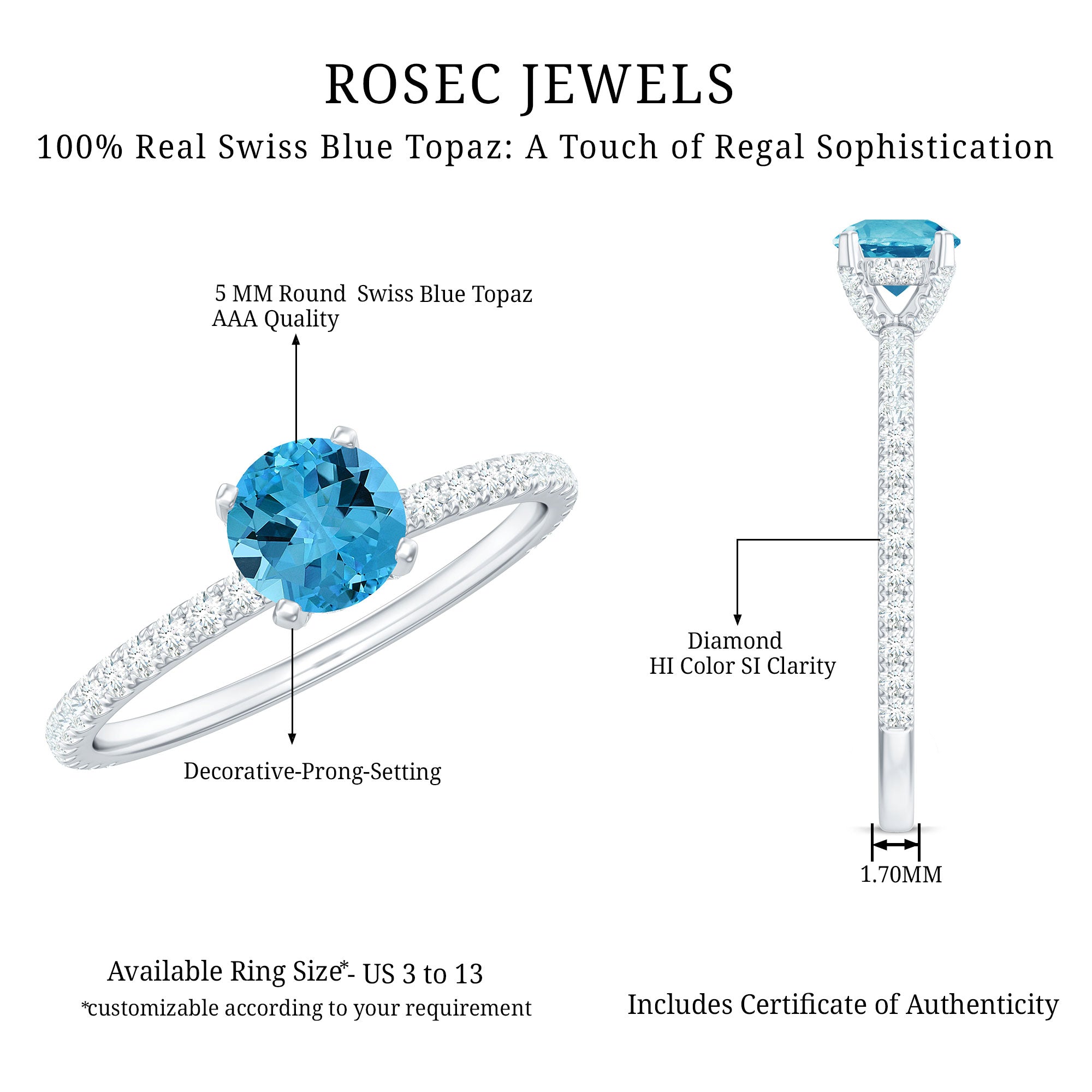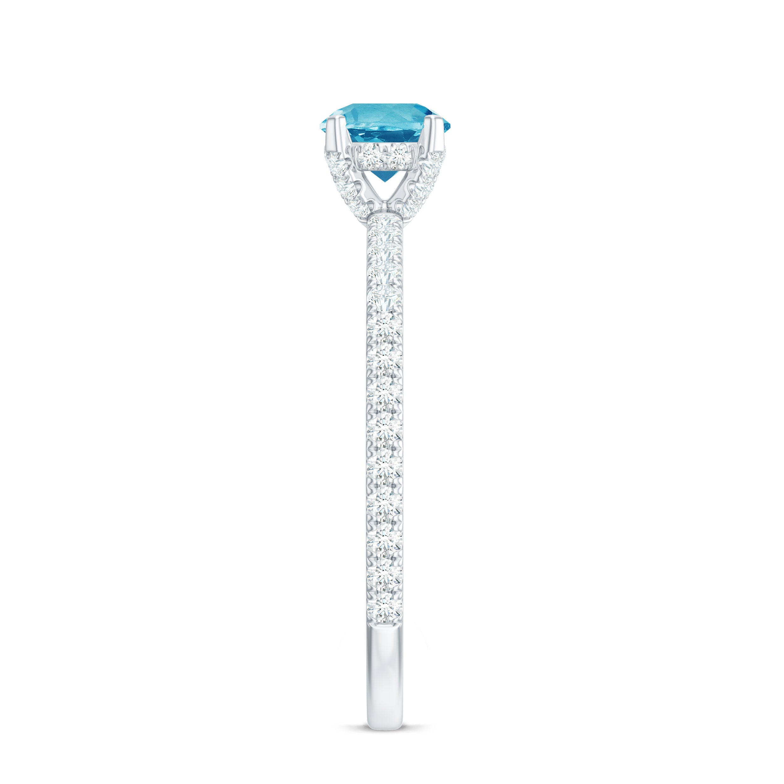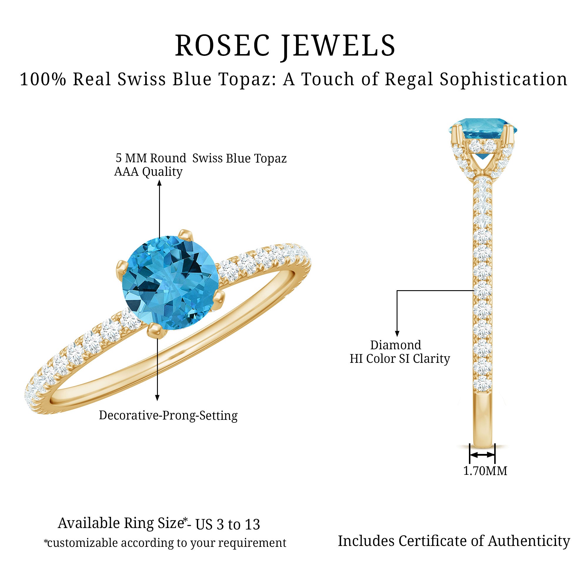 This Gold Ring consists of Round Shape Swiss Blue Topaz as Solitaire embellished in Prong Setting with Round Shape Diamond stones as Side Stones embellished in Pave Setting for Women.
