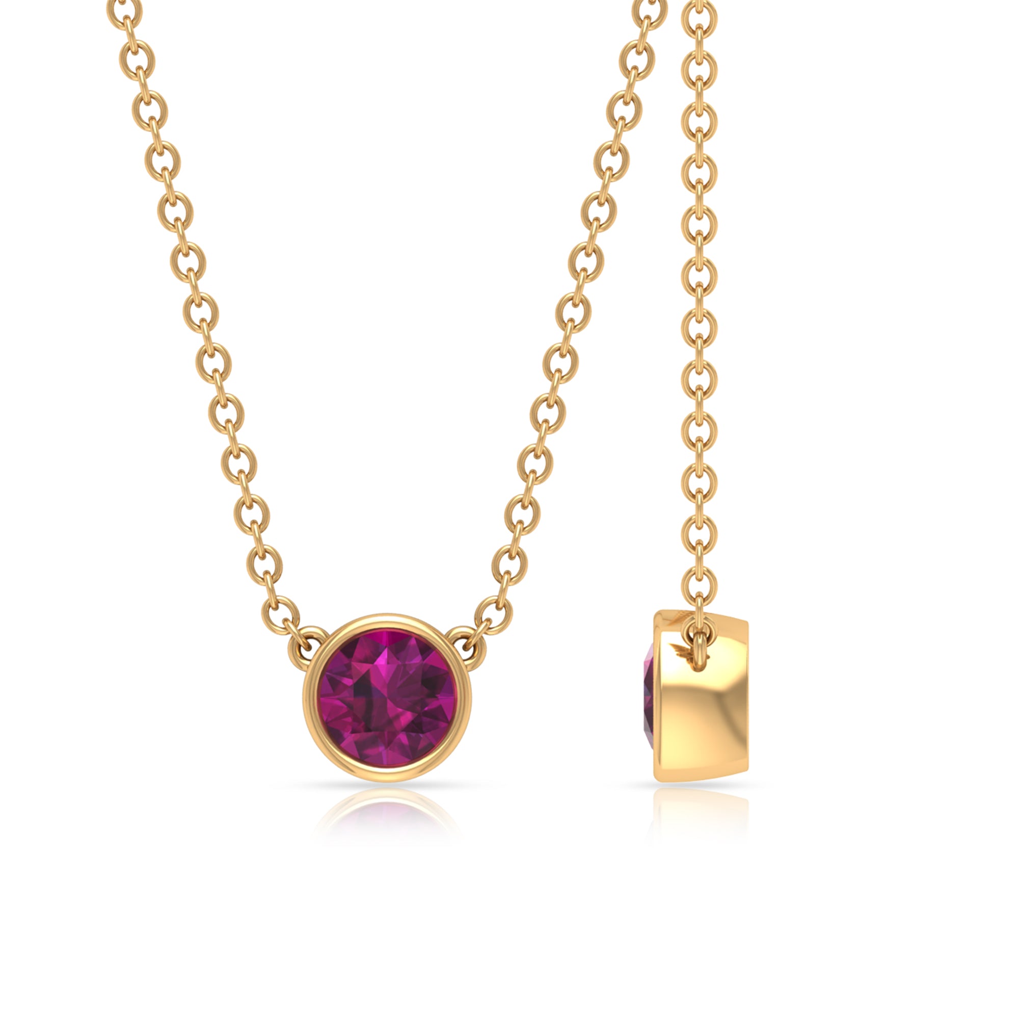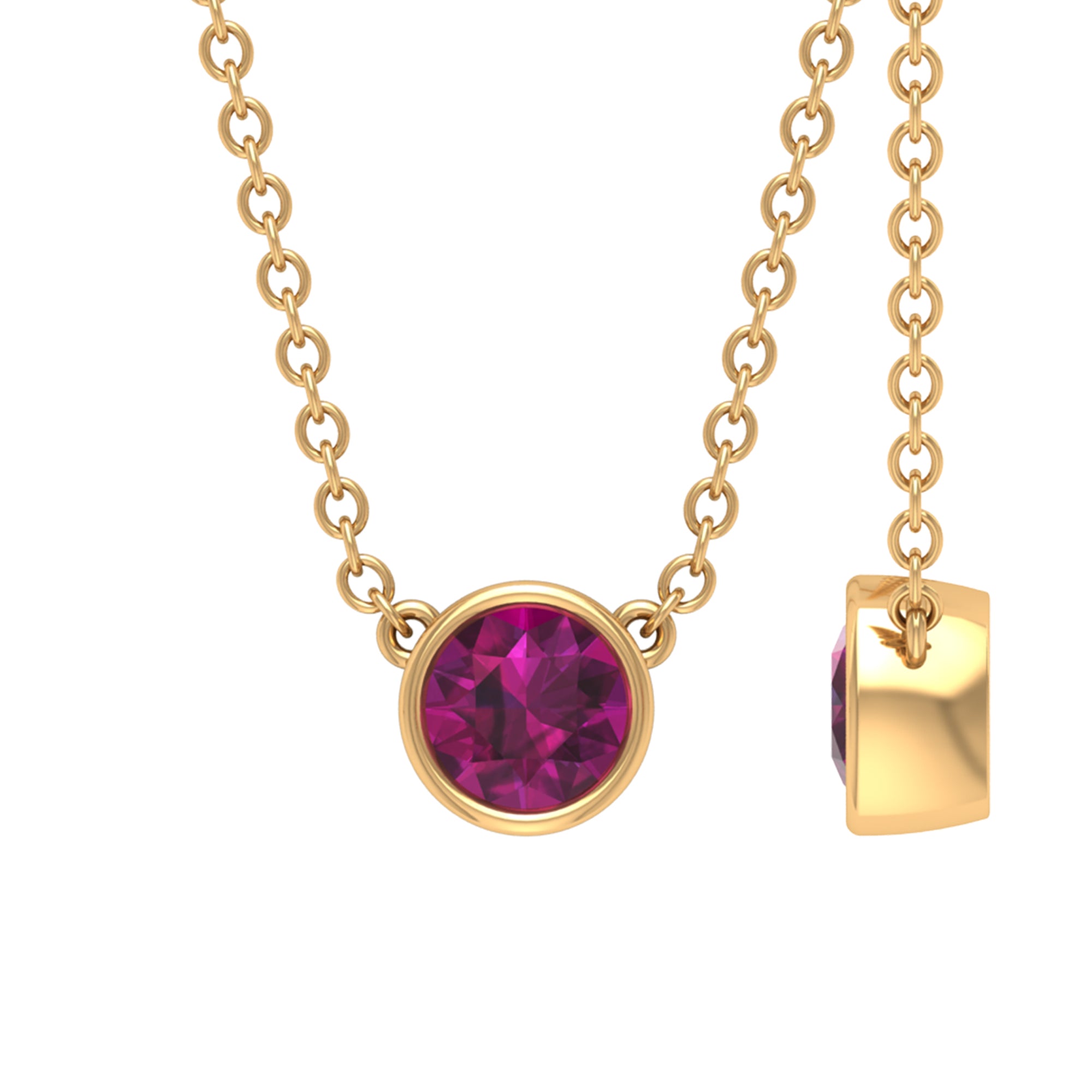 Enhance the significance of your special occasion with this exquisite Solitaire Necklace featuring a Round-Shaped Rhodolite in a Bezel Setting. The Rhodolite necklace boasts a minimalist design and is expertly crafted in solid gold.