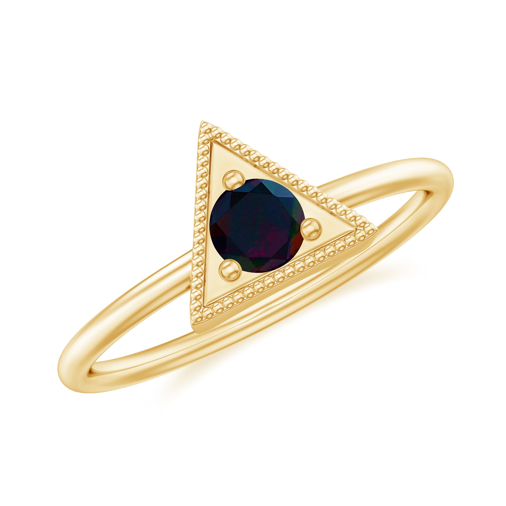This exquisite Black Opal Ring is sure to become a cherished piece of jewelry. It represents love and devotion, featuring a 4 MM Round Cut Black Opal held securely in a prong setting. The promise ring is beautifully designed with delicate gold beading and a sleek triangular geometric shape, offering a sophisticated and effortless style. This minimal ring is crafted with natural Black Opal, and it would make a wonderful addition to your jewelry collection.