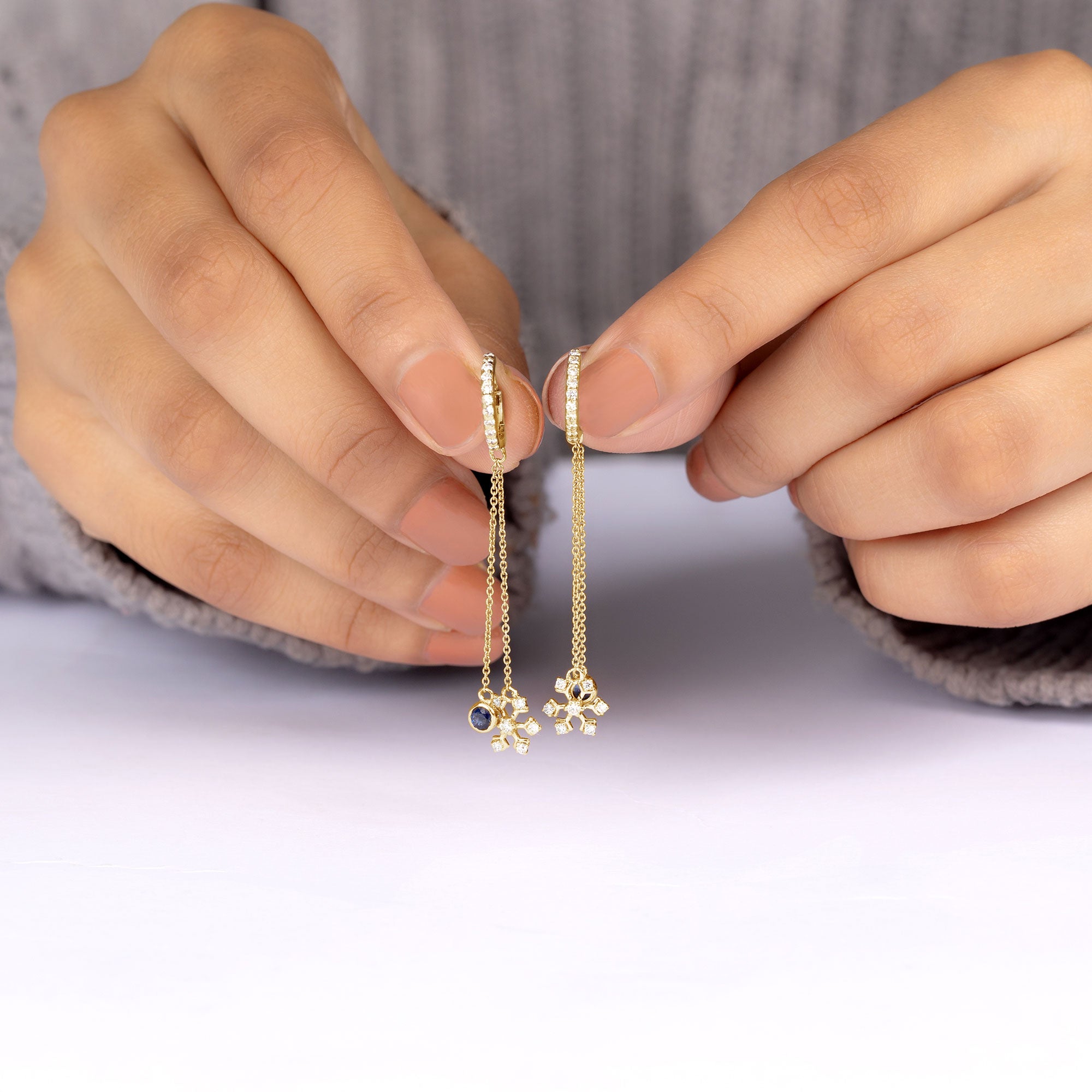 These elegant Snowflake Dangle Earrings feature a round Blue Sapphire gemstone set in a bezel setting, hanging from one chain, while another chain holds a snowflake encrusted with round Diamond stones. The earrings are crafted from solid gold and make for a stunning addition to any jewelry collection.