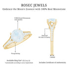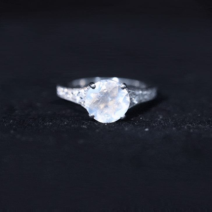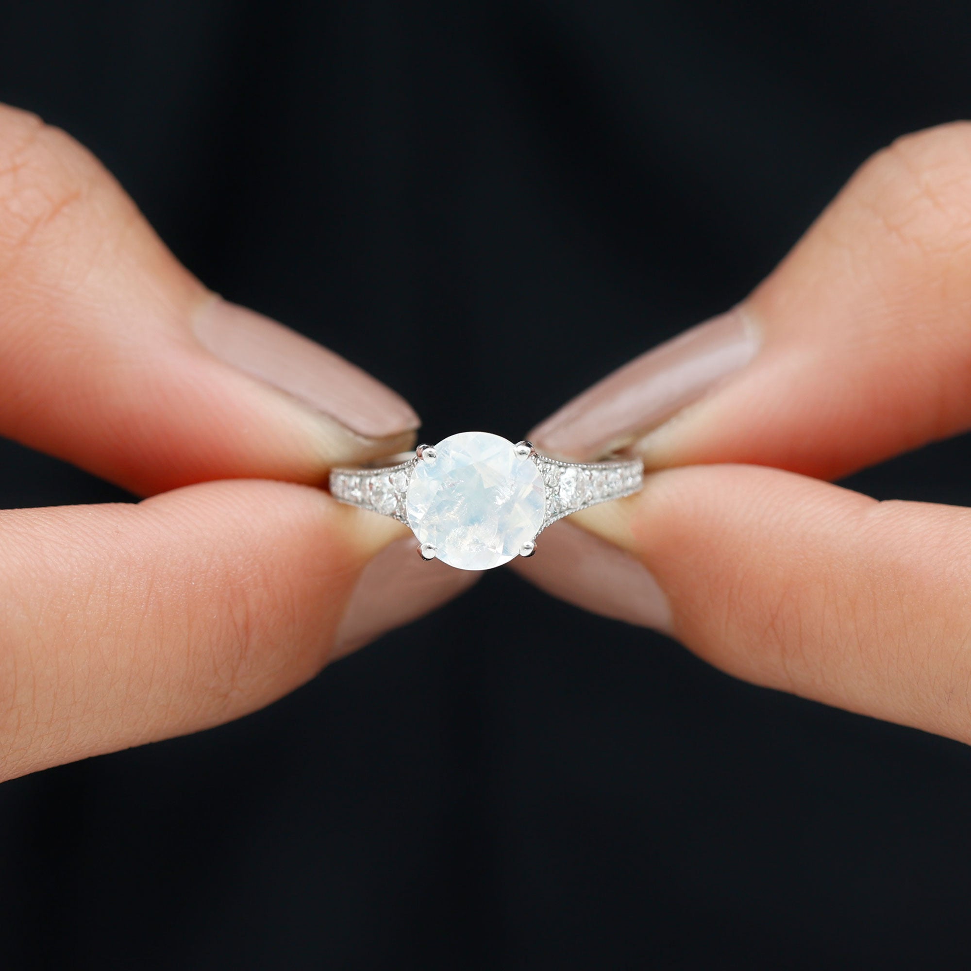Light and elegance come together beautifully in this Moonstone Engagement Ring. Features an 8 MM round cut moonstone held in secure prong setting, showing gentle flashes of color that shift with every movement. The band features a thoughtful designer style that adds a modern touch to the ring’s classic shape. Round diamonds line each side of the band, bringing a bright sparkle that complements the center stone. A tiny hidden diamond placed beneath the moonstone adds a charming surprise detail, making the design even more special. Every part of this Moonstone and Diamond Ring is crafted to offer beauty, durability, and comfort. The smooth band fits easily for daily wear, while the overall design keeps the Designer Engagement Ring feeling meaningful enough for life’s most important moments. Available in US sizes 3 to 13 and presented in an elegant jewelry box, this Moonstone Ring for Women is ready for proposals, anniversaries, or heartfelt gifting. Its timeless style, glowing centerpiece, and thoughtful details make it a piece to cherish for years, telling your story in a way that feels personal and unforgettable.