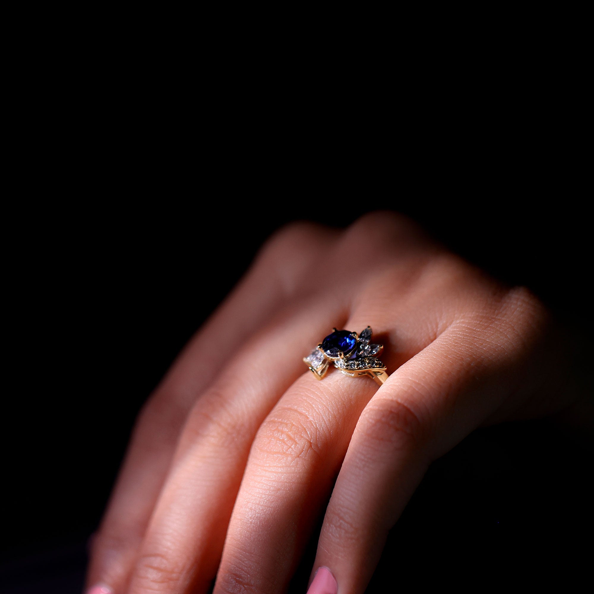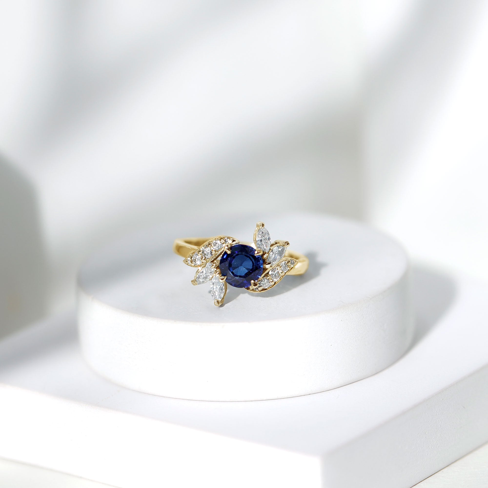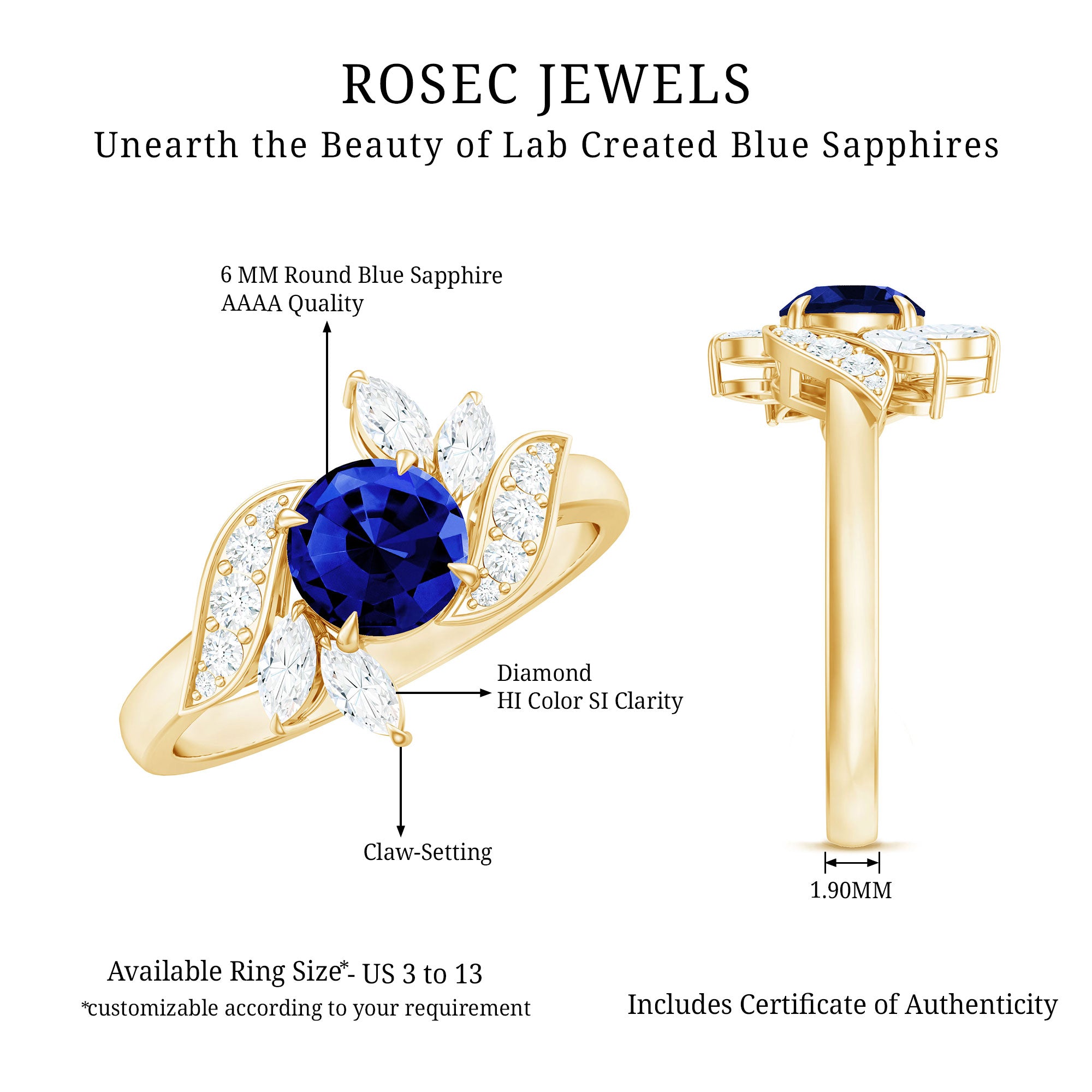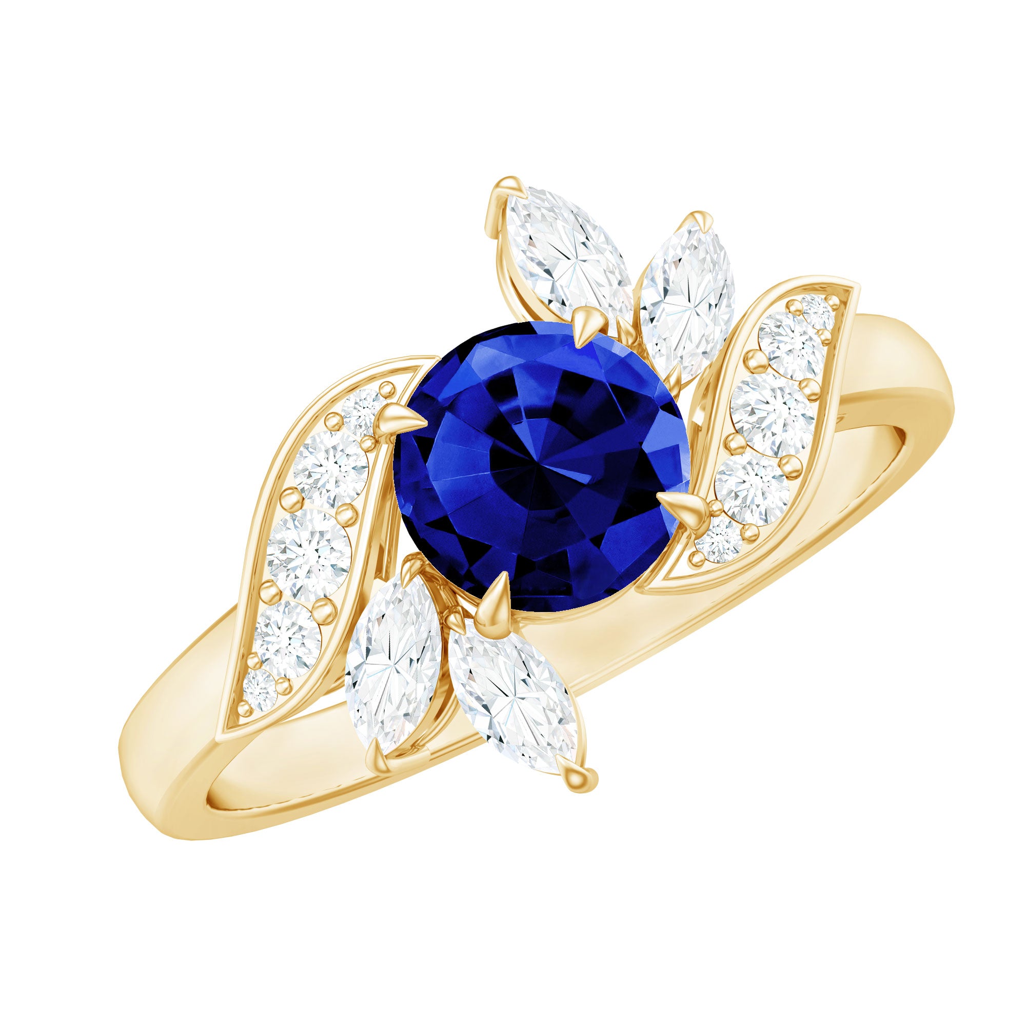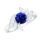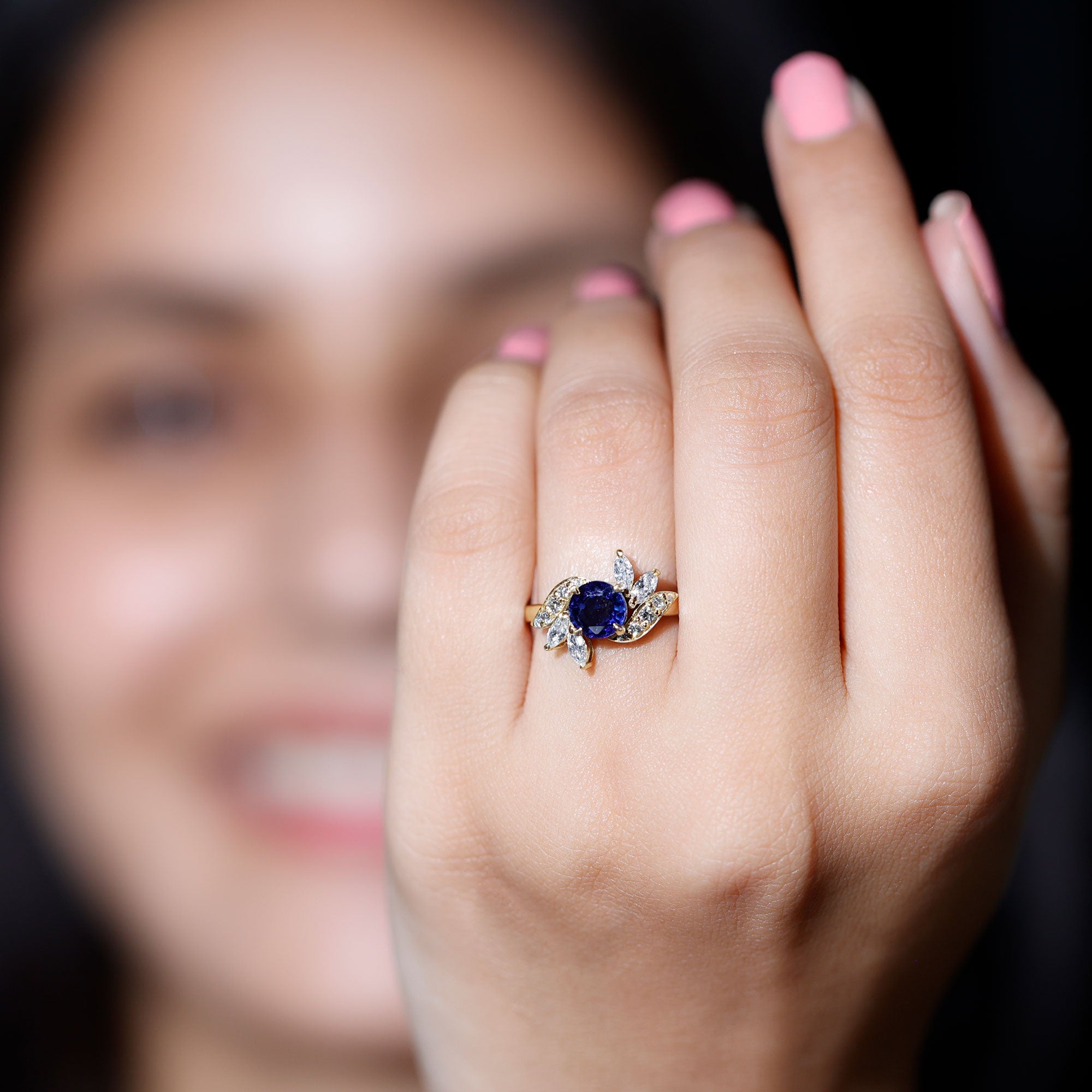 Adorn your fingers with this beautiful Gold Leaf Ring, featuring 6 MM Round Shape Created Blue Sapphire in Claw Setting and accented with Round and Marquise Cut Diamond. Its intricate leaf design in gold adds to the charm and elegance of this ring.