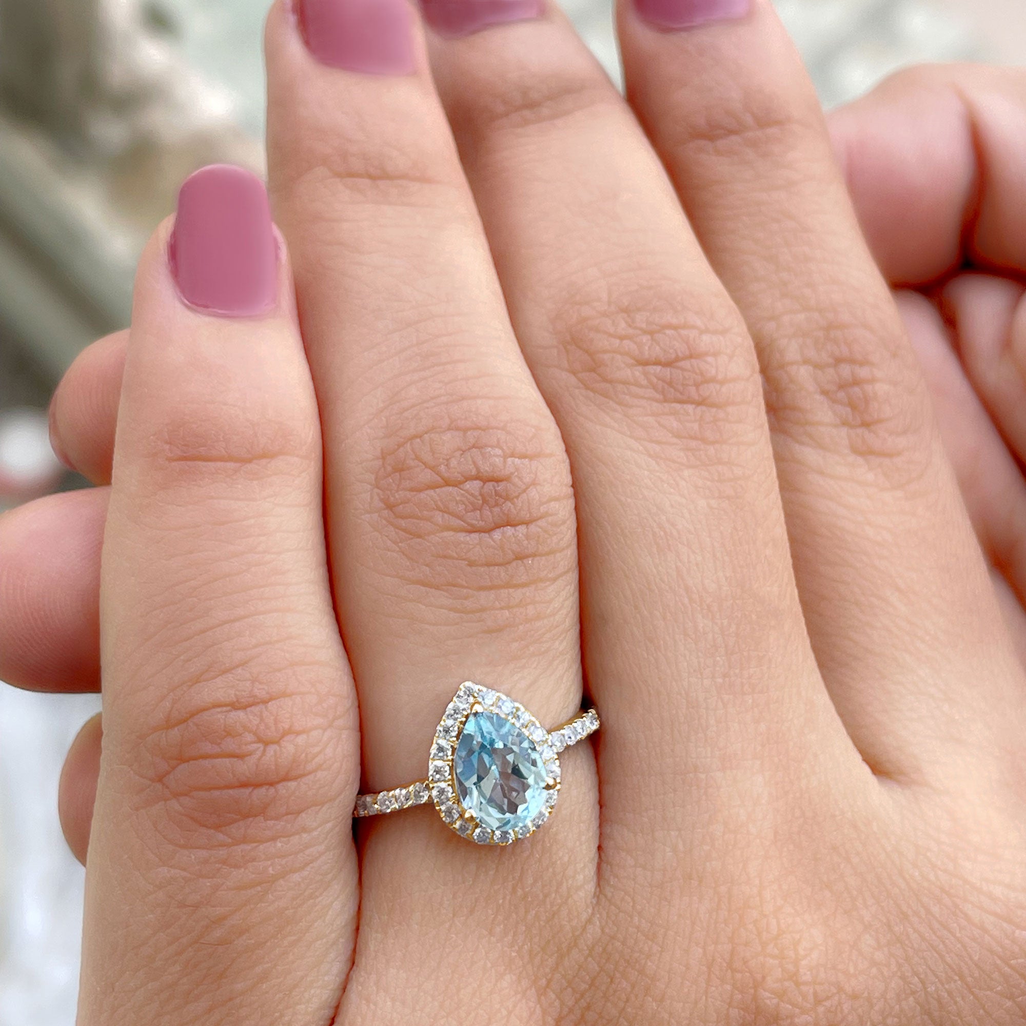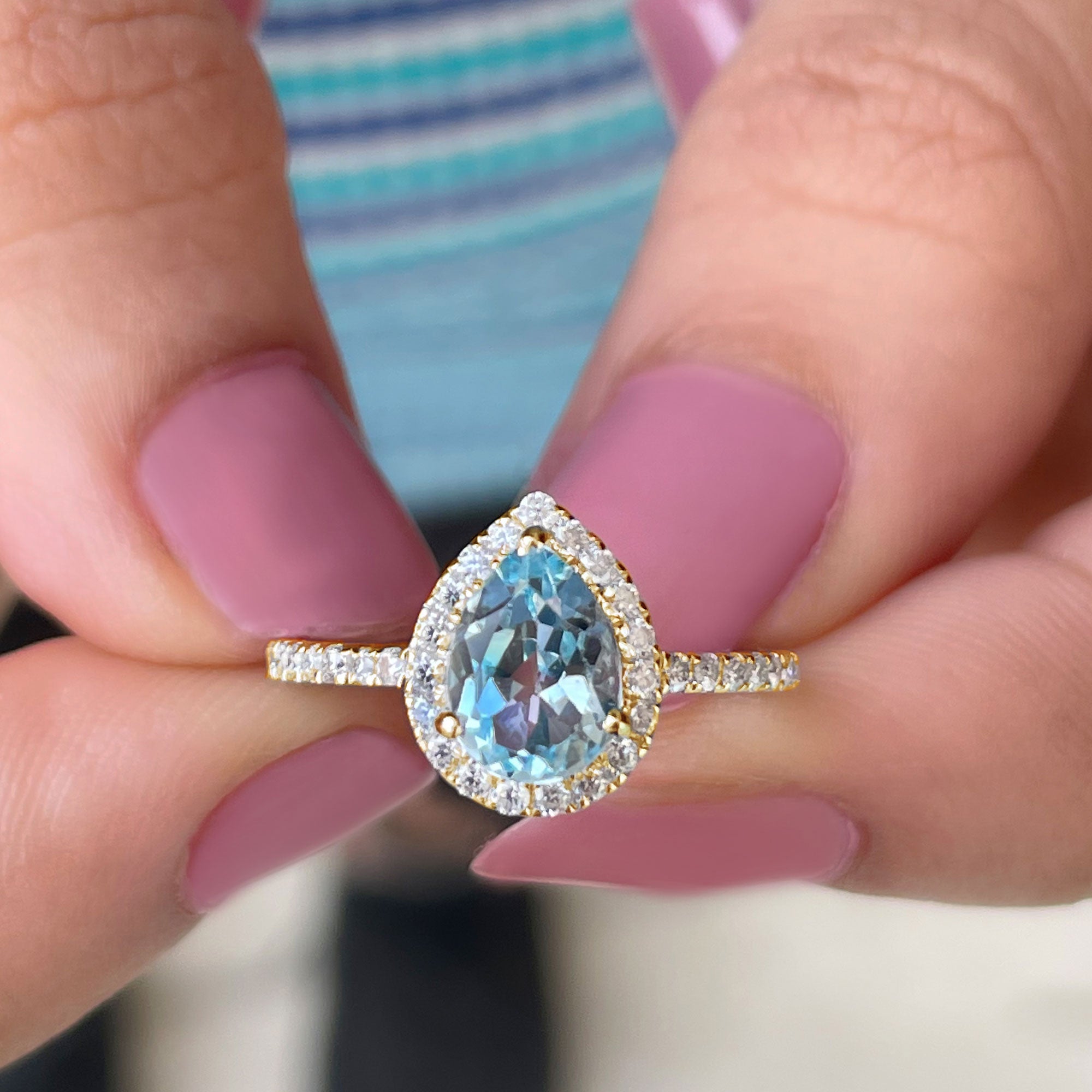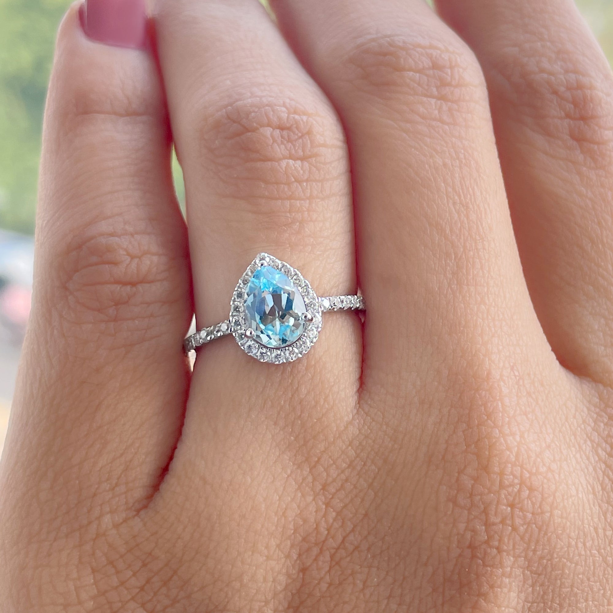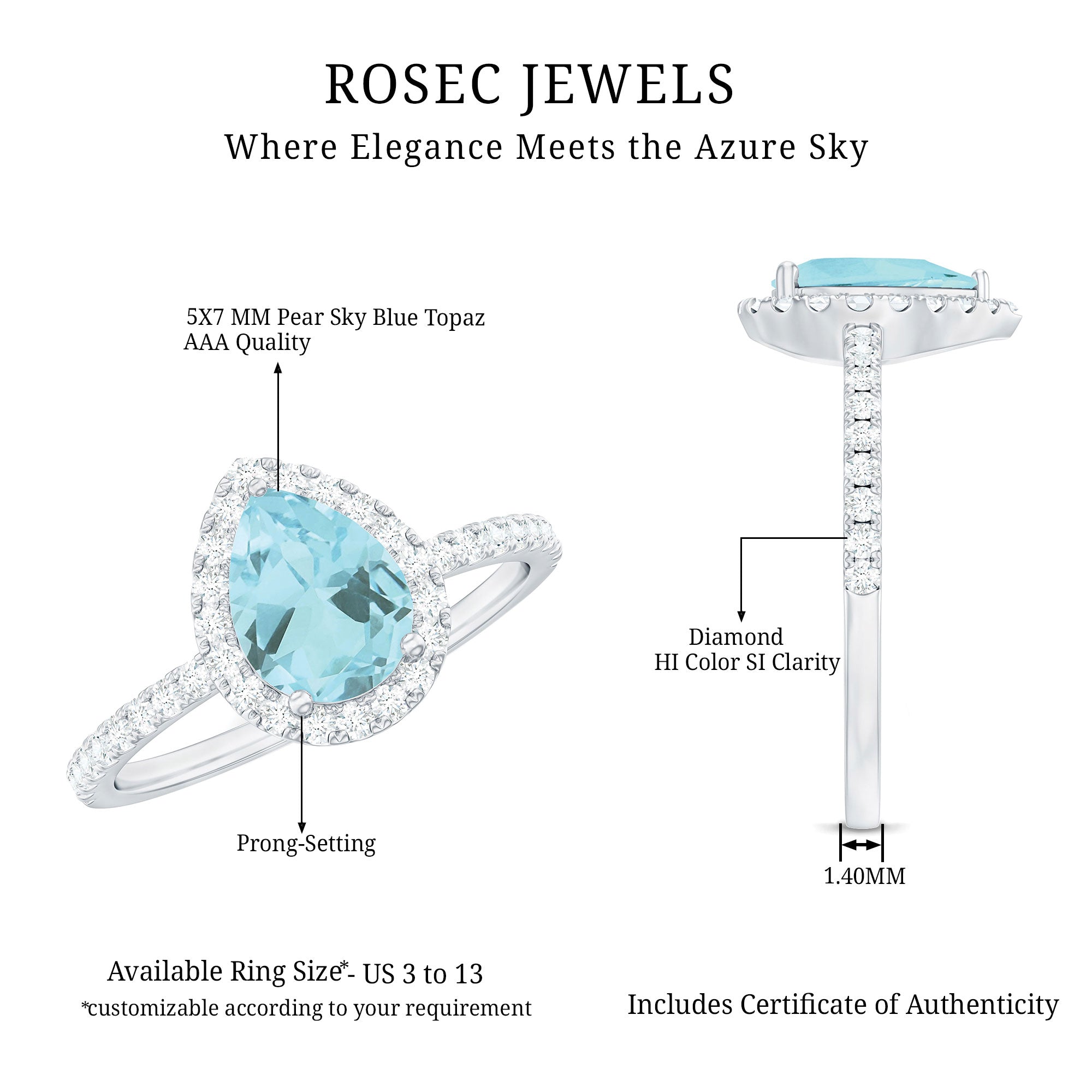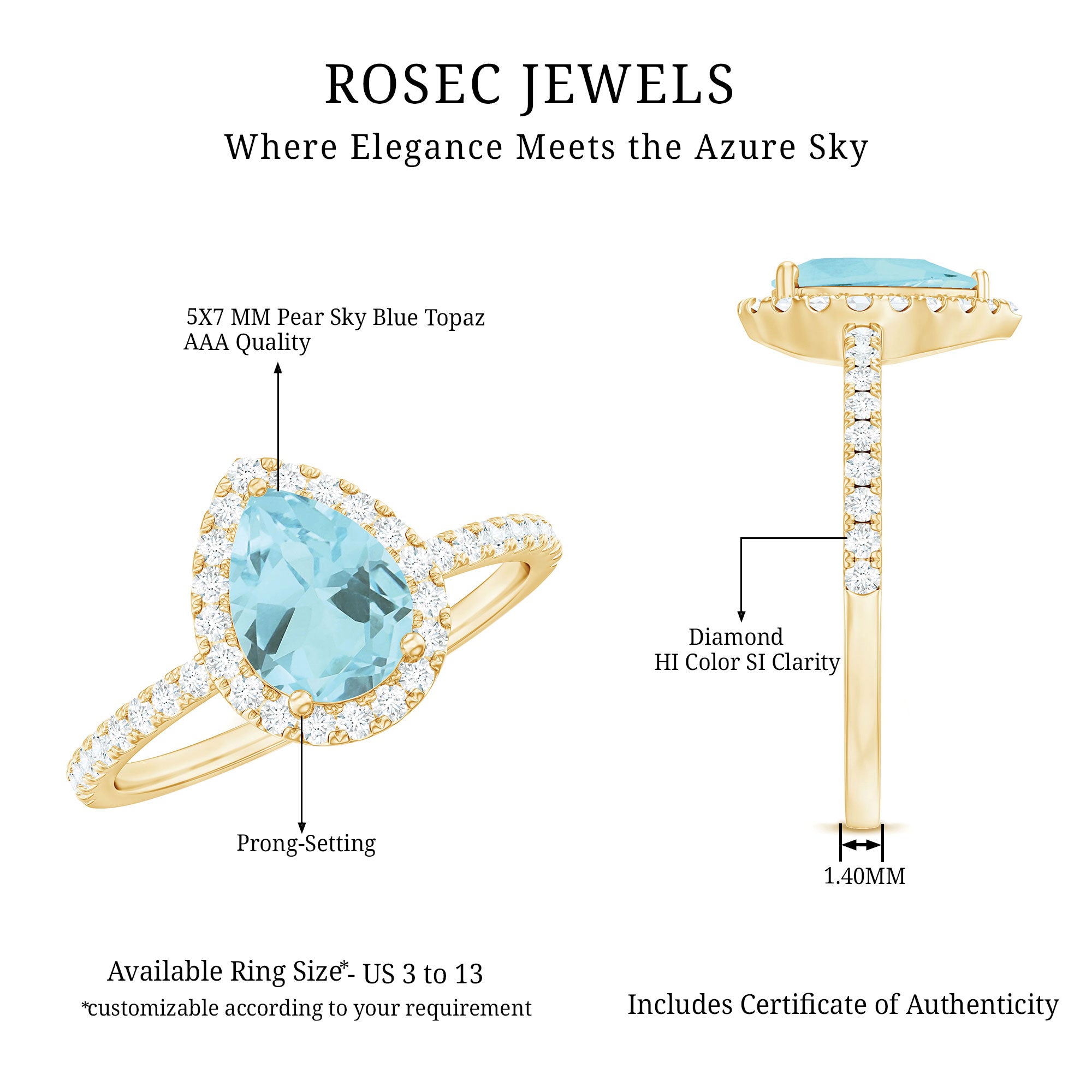 This elegant Sky Blue Topaz Ring is a breathtaking piece that captures the essence of love with its serene hues. At its center lies a dazzling 5X7 MM Pear Shaped Sky Blue Topaz in Prong Setting which is beautifully enhanced by a shimmering halo of Diamond that add an enchanting sparkle with every movement. This Topaz Engagement Ring cradles your love story with grace and sophistication. As a timeless treasure this Topaz Diamond Ring embodies your unique commitment, making every glance a reminder of your special moments. Be it a commitment or a December birthday, it marks the forever begins.