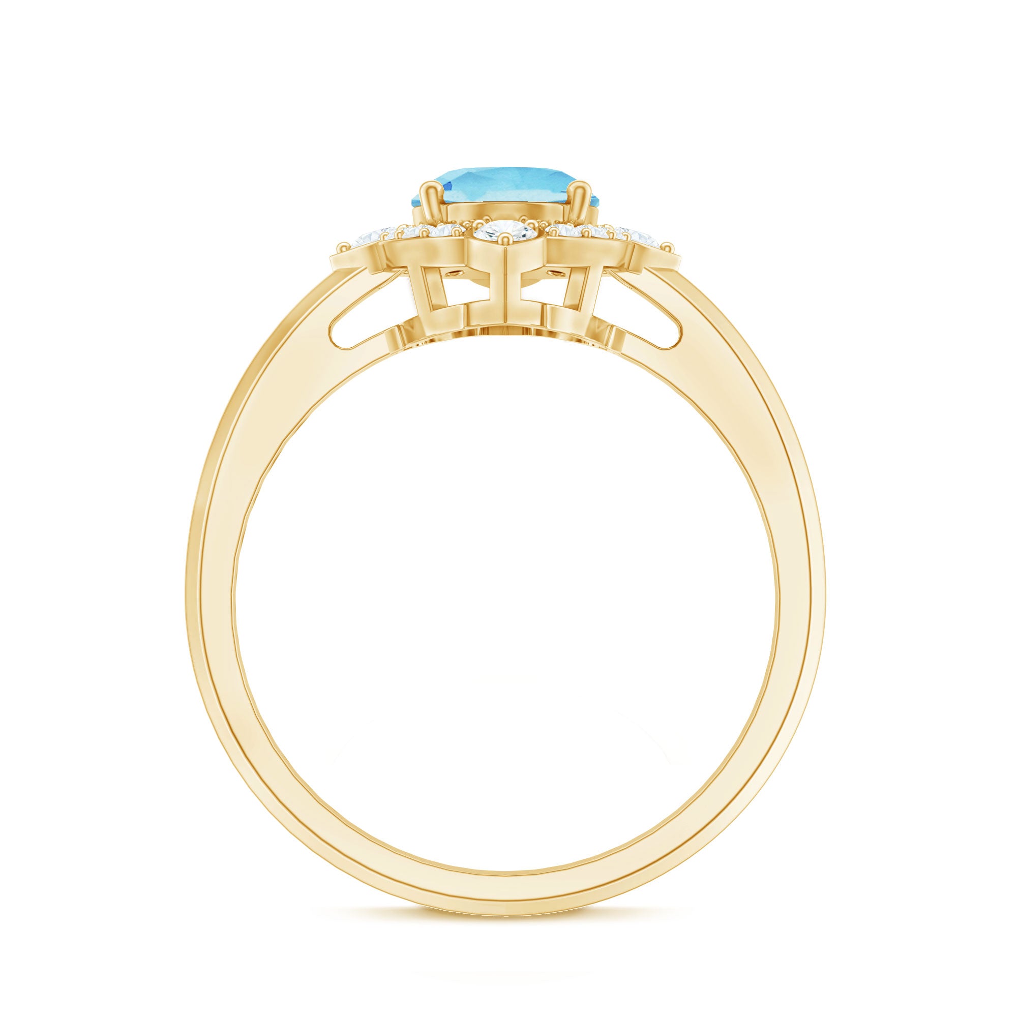Profess your love with this Art Deco Engagement Ring is adorned with Oval Shape Aquamarine set as a solitaire in a prong setting with Round Shape Diamond Accent. This Gold Art Deco Ring is mounted in Solid Gold.