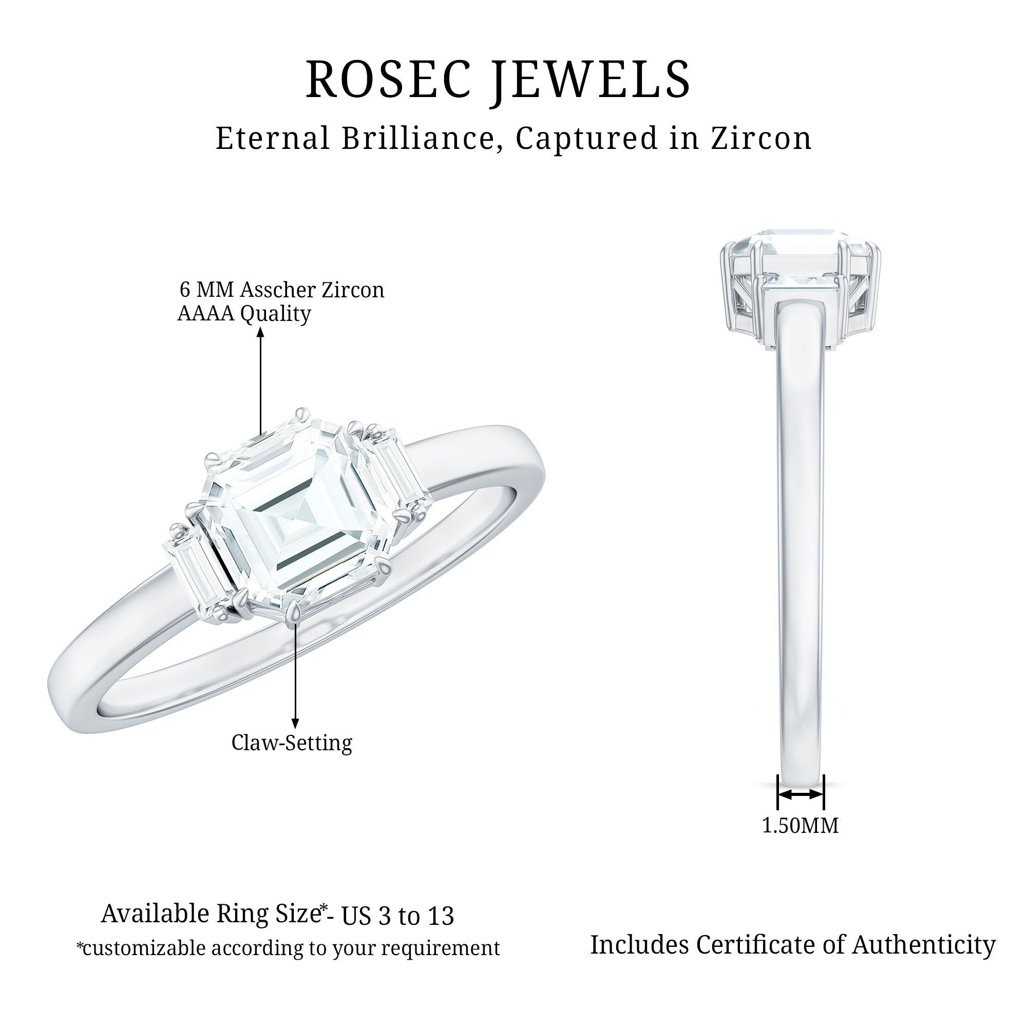 This Classic Cubic Zirconia Engagement Ring combines charm with sophistication. Crafted in high quality metal, this ring features an Asscher cut Zircon set as solitaire in claw setting with baguette cut side stone. Whether it is a promise to the one you love, or a promise to remember a special moment or adventure in your own life, this Solitaire Engagement Ring is sure to bring a bit of sparkle to your forever style.