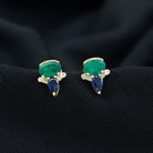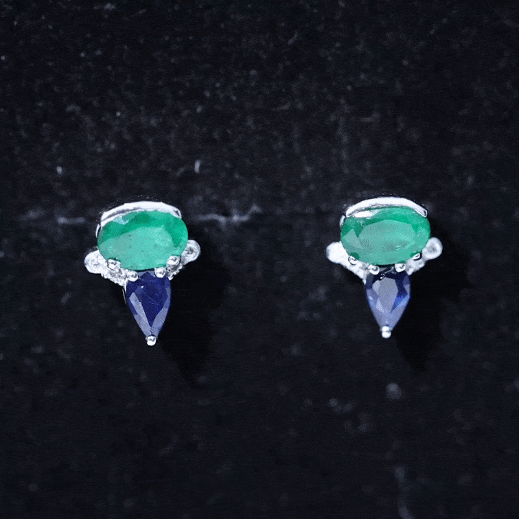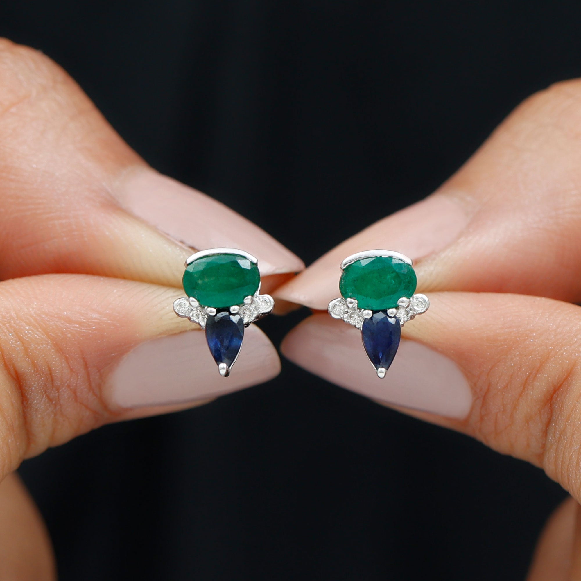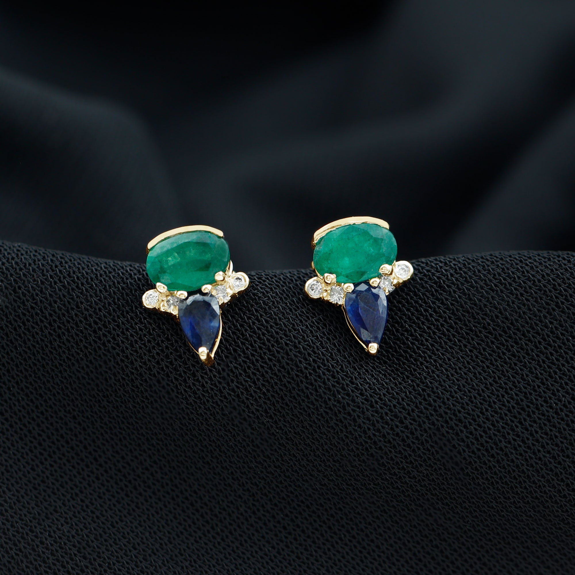 This beautiful Gemstone Stud Earring is the gorgeous studs encased with Oval Shape Emeralds, Pear Shape Blue Sapphire and Round Diamond stones. This Wedding Earring crafted in Solid Gold will go with every outfit.