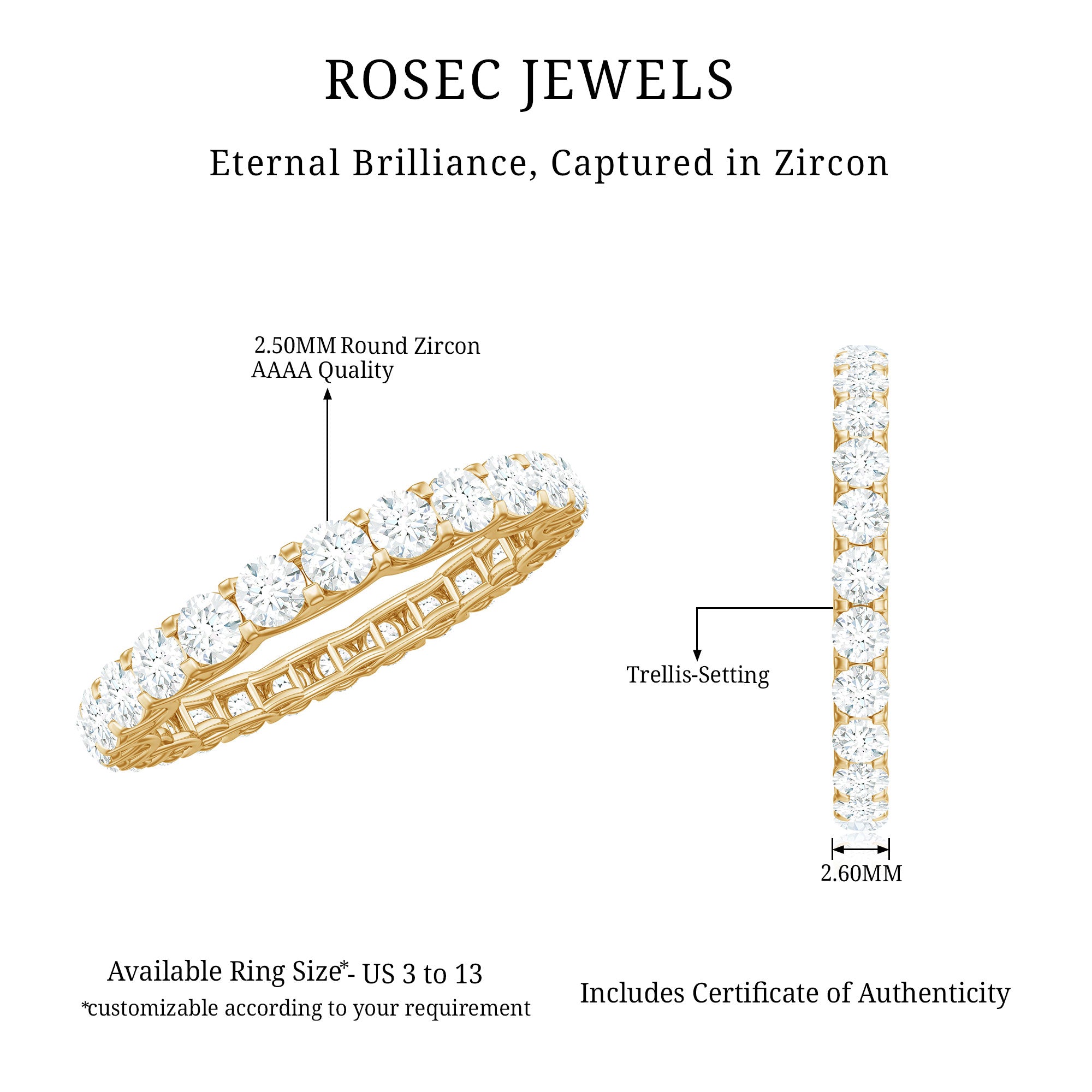 Look graceful with this pleasing Full Eternity Ring which is adorned with Round Cut Zircon are set in Trellis Setting. This CZ Full Eternity Ring is crafted with Gold to make a luxurious appeal on any of occasion.