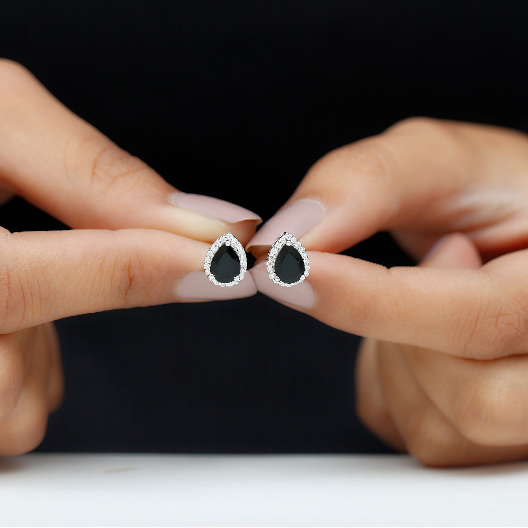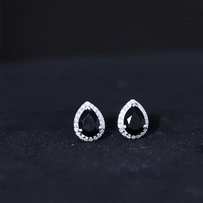 This Beautiful Teardrop Stud Earrings is embellished with Pear Cut Black Onyx as Solitaire and Moissanite set in Halo Setting. This Solitaire Stud Earring is Composed of Solid Gold.