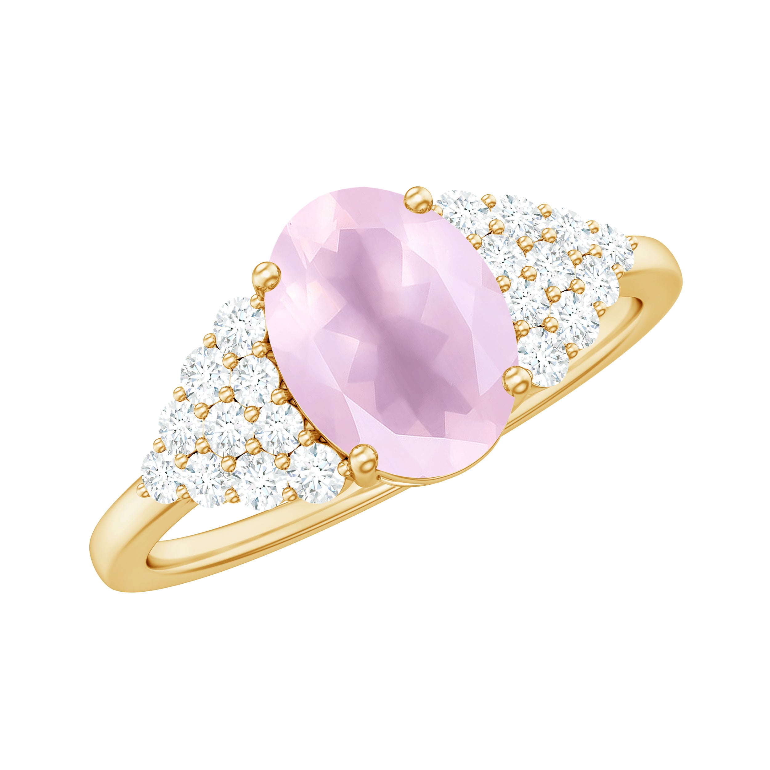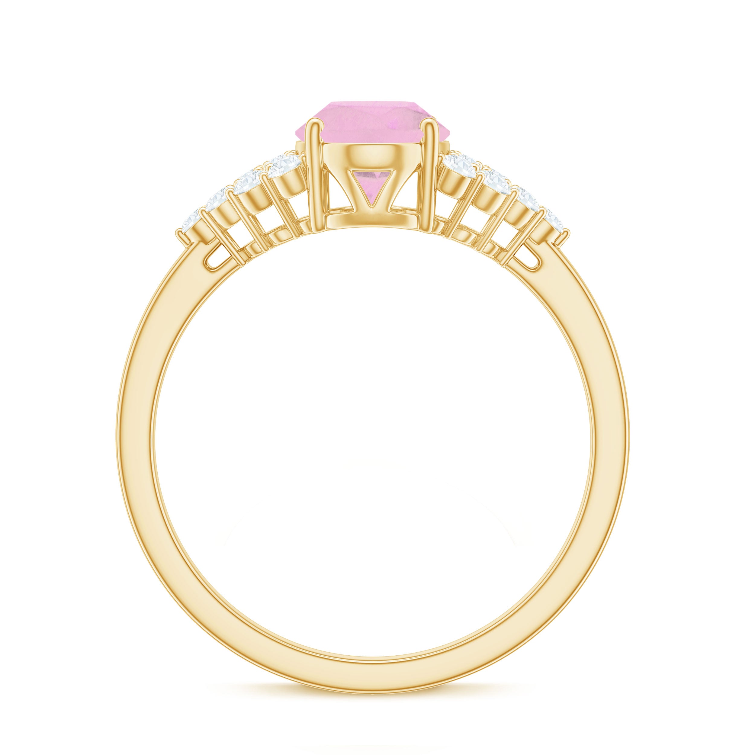Elevate your look by wearing this elegant Solitaire Ring embellished with Oval Cut Rose Quartz in Prong Setting with Diamond Accent. This Rose Quartz Solitaire Ring is crafted with Gold for a luxurious look. This Rose Quartz Ring will bring intense shine and allure to your look.
