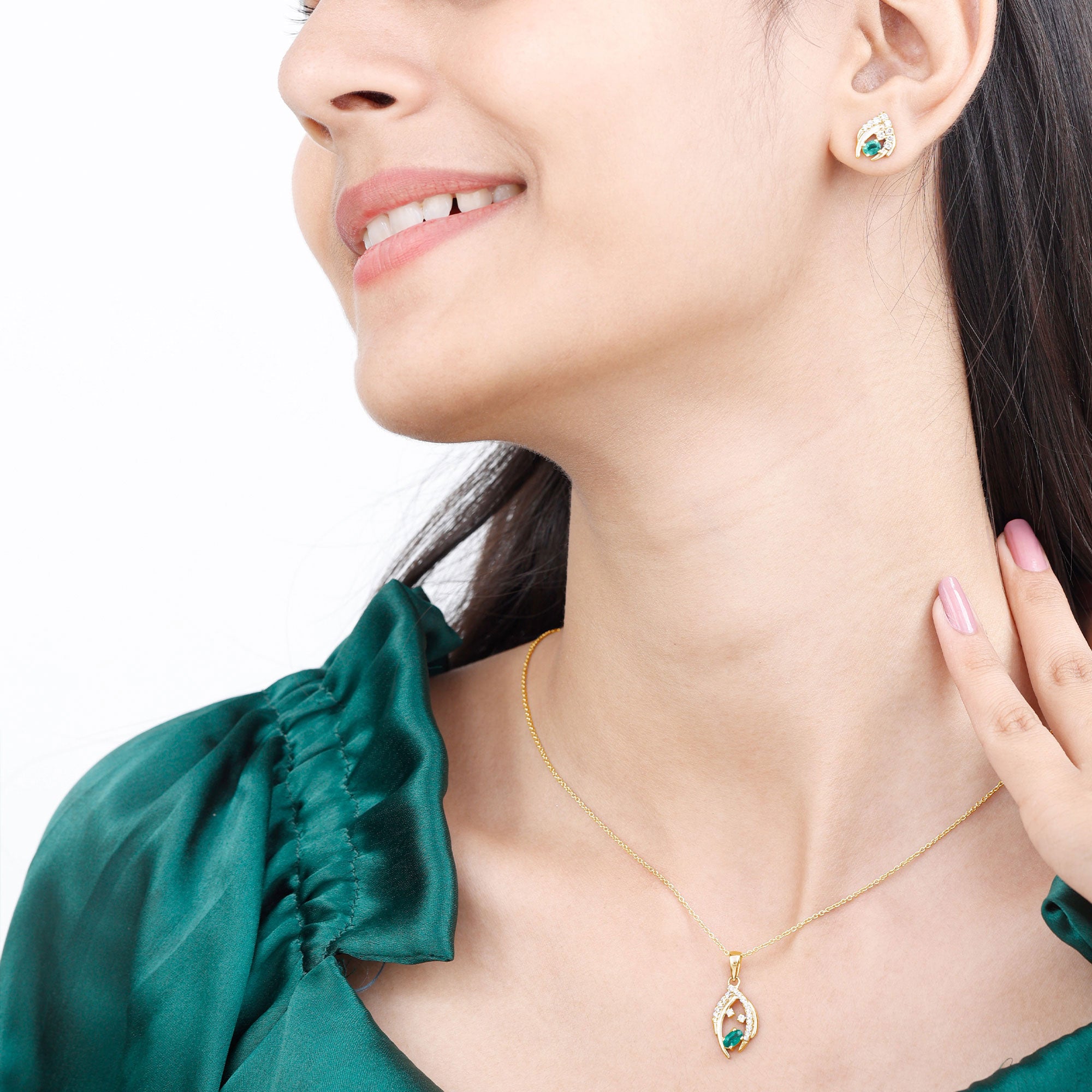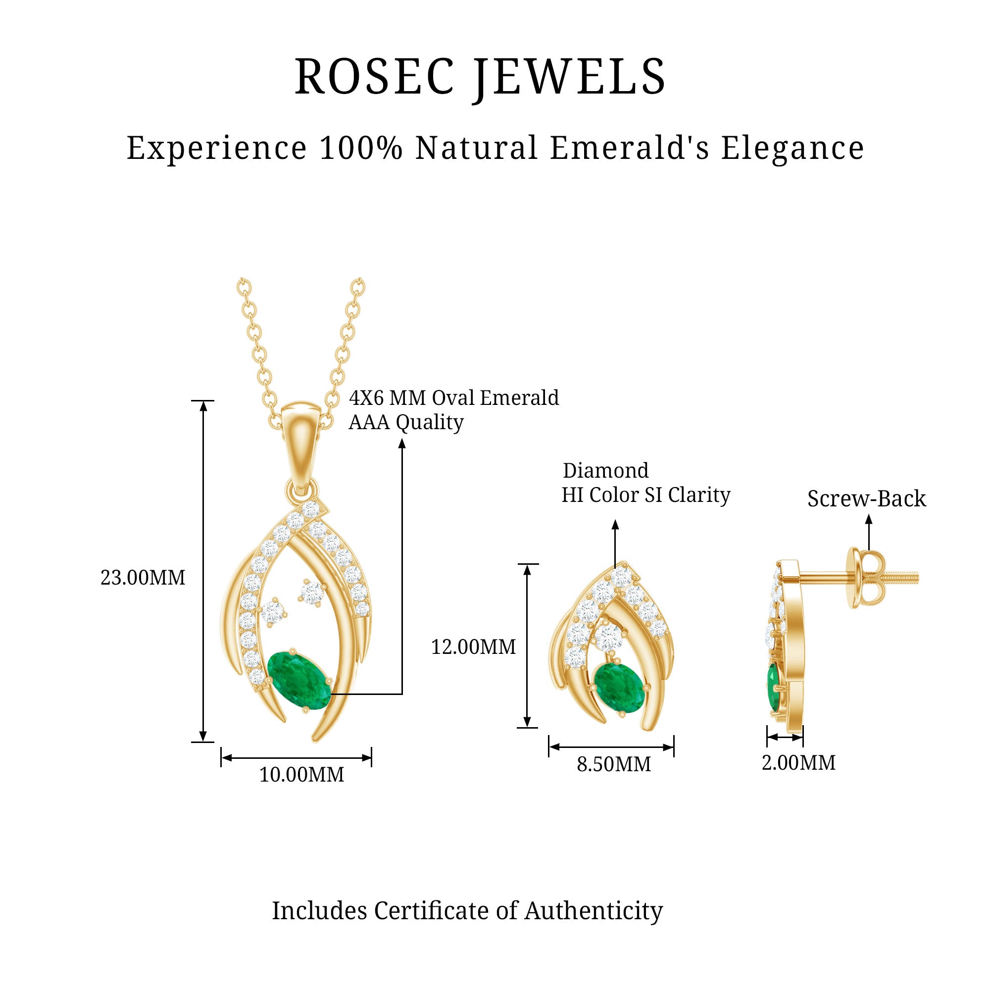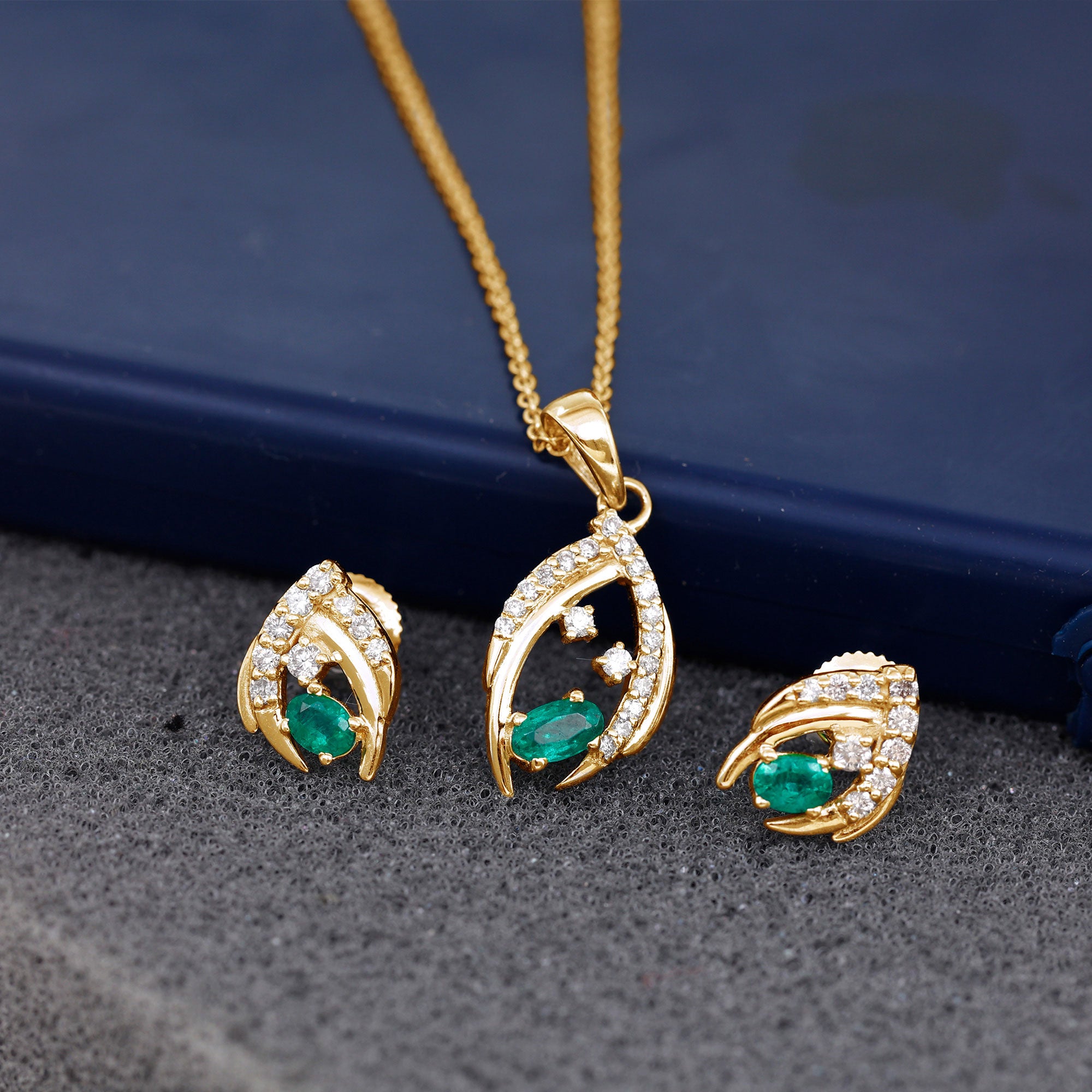 This Simple Jewelry Set is embellished with Oval Shape Emerald tilted in Center of Uniquely Designed Solid Gold with Round Shape Diamond gemstones in Prong Setting. Get this Pendant Earring Set for Lovely Lady of your Life.