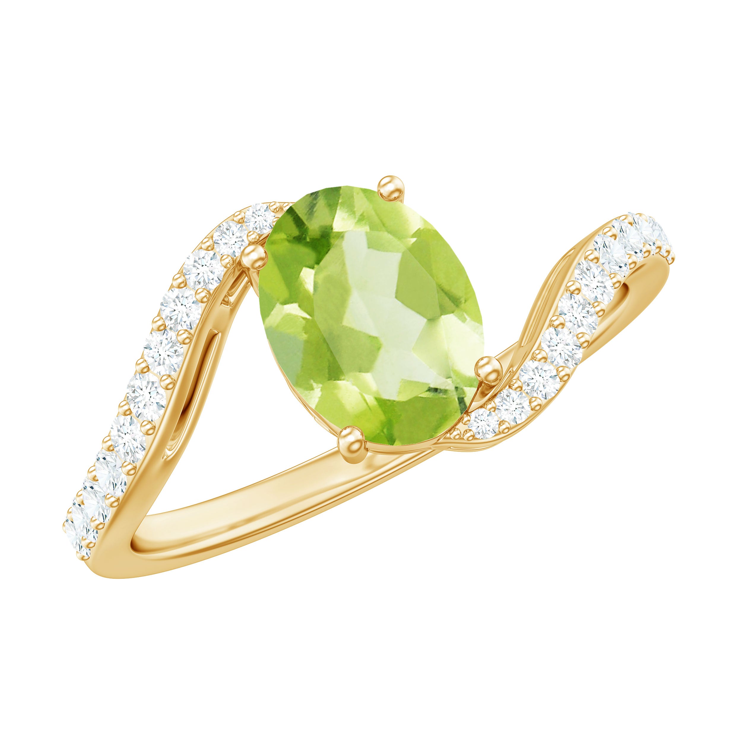 Bring out your alluring look by wearing this elegant Peridot Solitaire Ring embellished with Oval Cut Peridot in Prong Setting and Diamond Accent. This Peridot and Diamond Ring is crafted with Gold to give you a stand out look from others. Surprise your love with this elegant Peridot Stone Ring, something she would never try to keep away from herself.