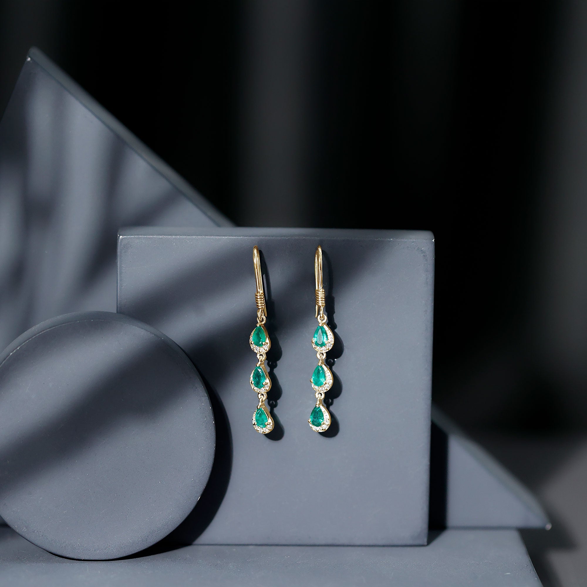 Add a pop of green to your everyday look with these Certified Emerald Dangle Earrings. The beautiful pear-cut emeralds dangle with Diamond accents, making them a fascinating addition to your jewelry collection. These solid gold earrings are here to enhance your radiance and warmth. Wear your greens all day, every day with these must-have earrings from Rosec Jewels.