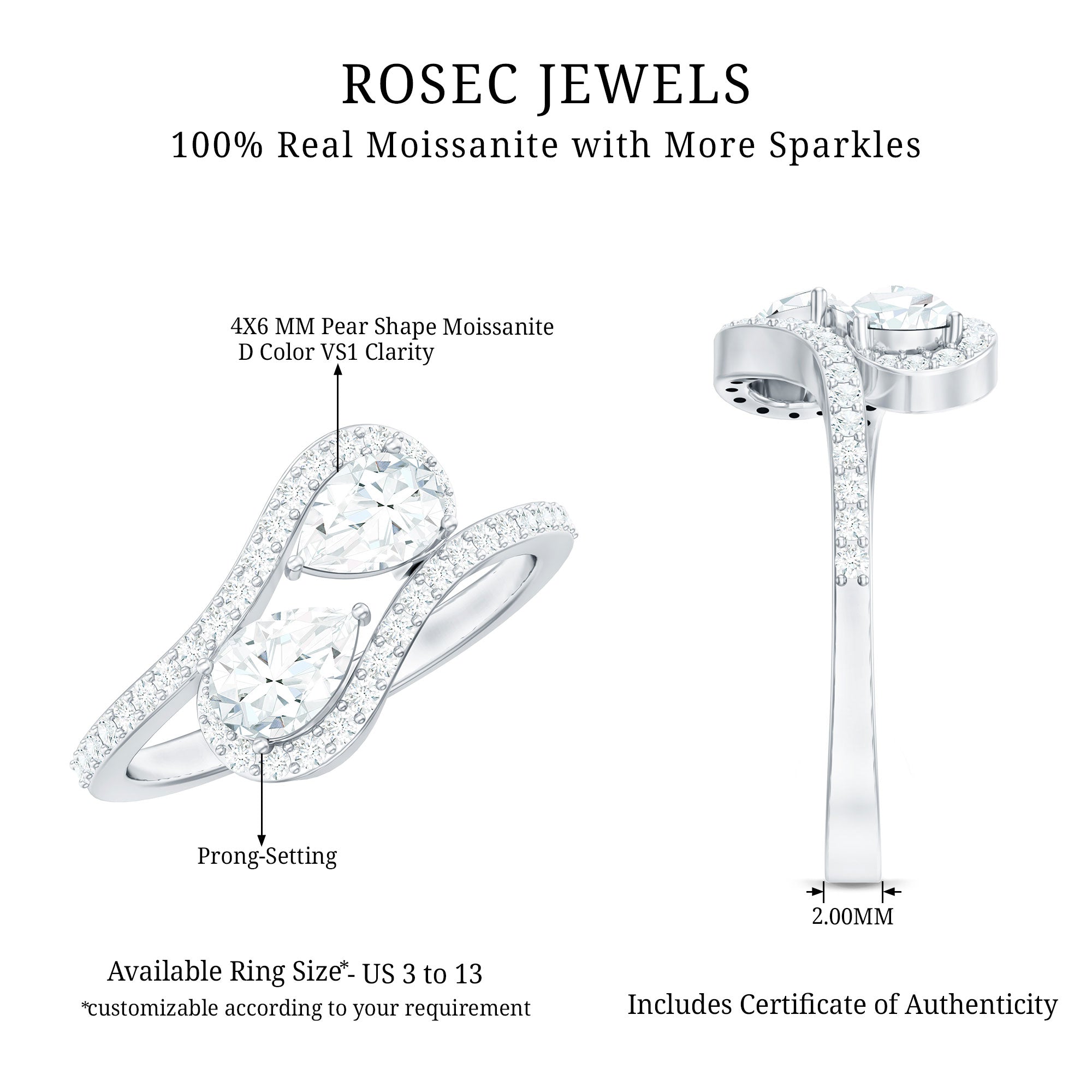 Rosec Jewels Two Stone Engagement Ring celebrates the special bond between two hearts. Featuring two dazzling 4X6 MM pear shaped moissanite stones in secure prong setting, this Toi Et Moi Ring puts a modern twist on the classic You and Me Ring design. The unique bypass band gently wraps around the stones, creating an elegant and flowing shape that symbolizes two lives coming together. Delicate moissanite accent along the band add extra sparkle and charm, making this piece feel bold yet romantic. Each moissanite stone is of D color and VS1 clarity, offering stunning brilliance and clarity that rivals diamonds. This design tells your love story, two unique souls joined as one. Perfect for proposals, anniversaries, or simply celebrating a deep connection, this handcrafted Moissanite Engagement Ring is made for brides who want something meaningful, stylish, and timeless. Available in US ring sizes 3 to 13, this Bypass Ring ensures a comfortable and perfect fit. It arrives beautifully packaged in a chic jewelry box, ready for gifting or that big moment. Celebrate your journey with this radiant Two Stone Moissanite Ring, a symbol of love.