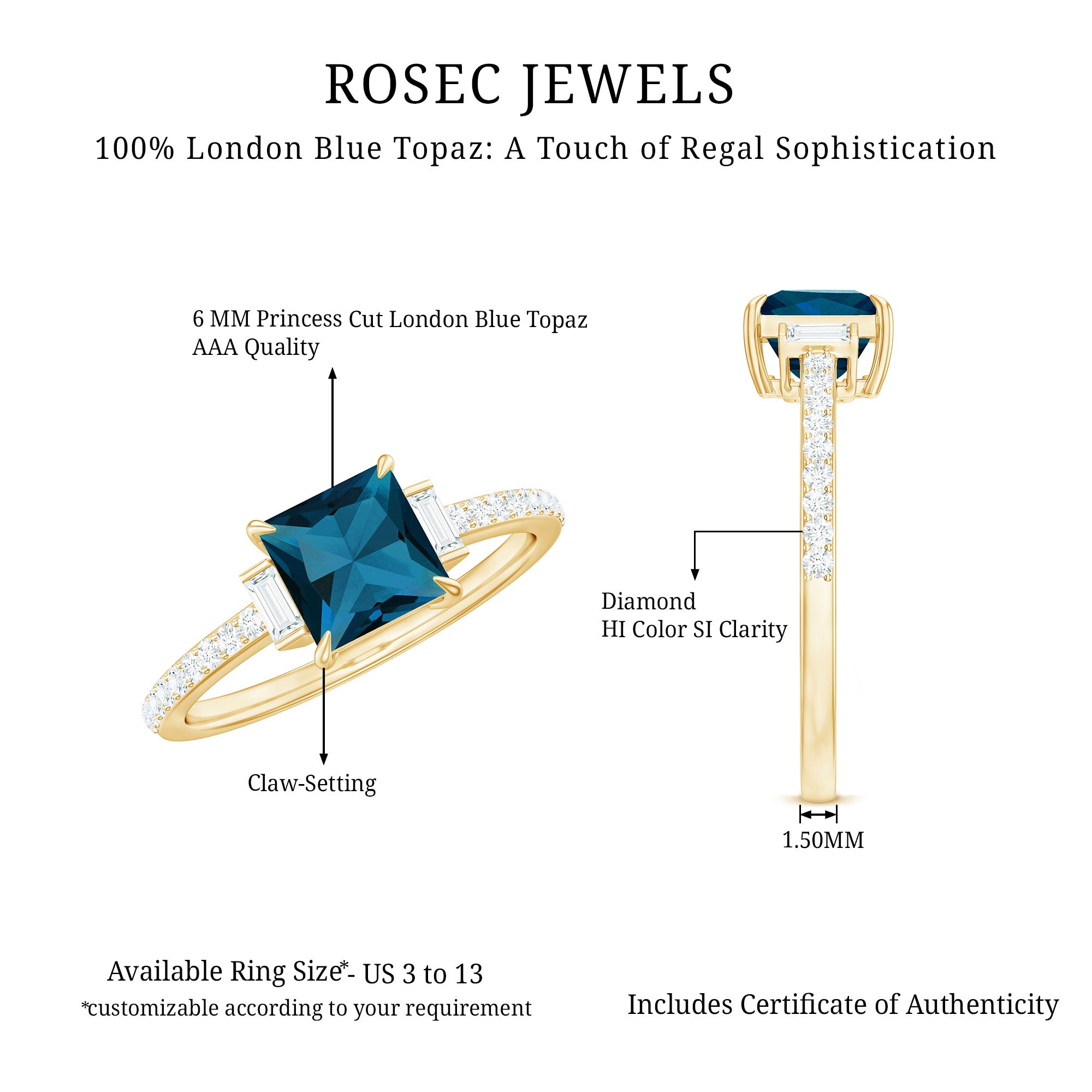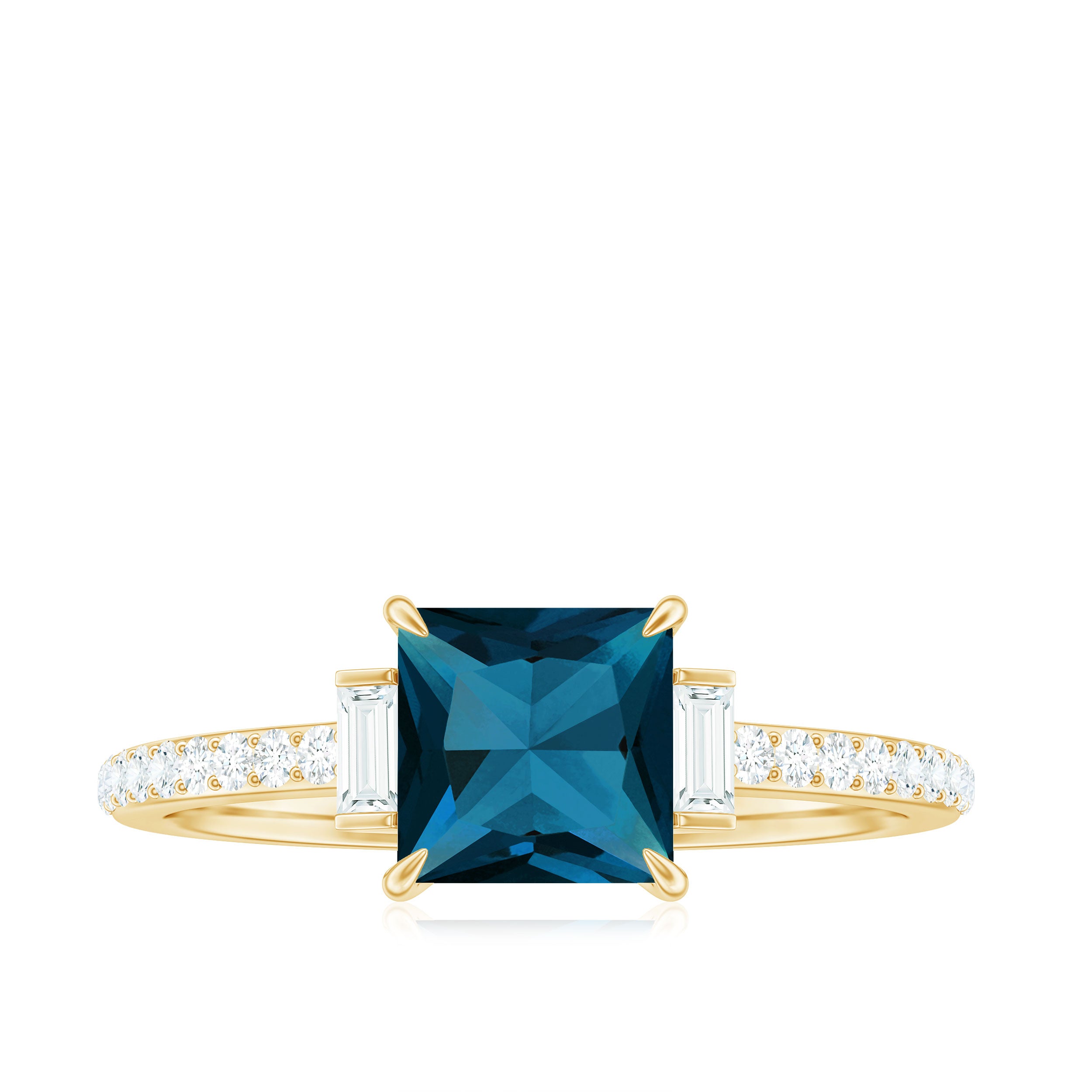 Capture attention and win affection with this exquisite London Blue Topaz Engagement Ring that is truly exceptional. At its heart lies a striking 6 MM princess cut London blue topaz, securely held in a claw setting. Shimmering round and baguette diamonds that provide the ideal touch of brilliance, allowing the entire Princess Cut Engagement Ring to radiate elegance and allure. The London Blue Topaz boasts AAA quality, recognized for its clarity and vibrant hue, while the diamonds are of HI-SI quality, bright, clear, and full of sparkle. The combination of deep blue and sparkling white creates a stunning contrast that feels both contemporary and timeless. Every aspect of this Blue Topaz and Diamond Engagement Ring has been meticulously crafted to stand out while maintaining a sense of grace. It is an excellent choice for someone who appreciates bold style infused with classic charm. The design is striking, making it suitable for everyday wear or those particularly special occasions. You can personalize it to your liking with a range of size options and metal purities available, ensuring that finding the perfect fit and finish is effortless. Additionally, for added assurance in your purchase, this Princess Cut Blue Topaz Ring is accompanied by a certificate of gemstone authenticity. It is a significant piece with remarkable detail, designed to be cherished and admired for many years ahead.