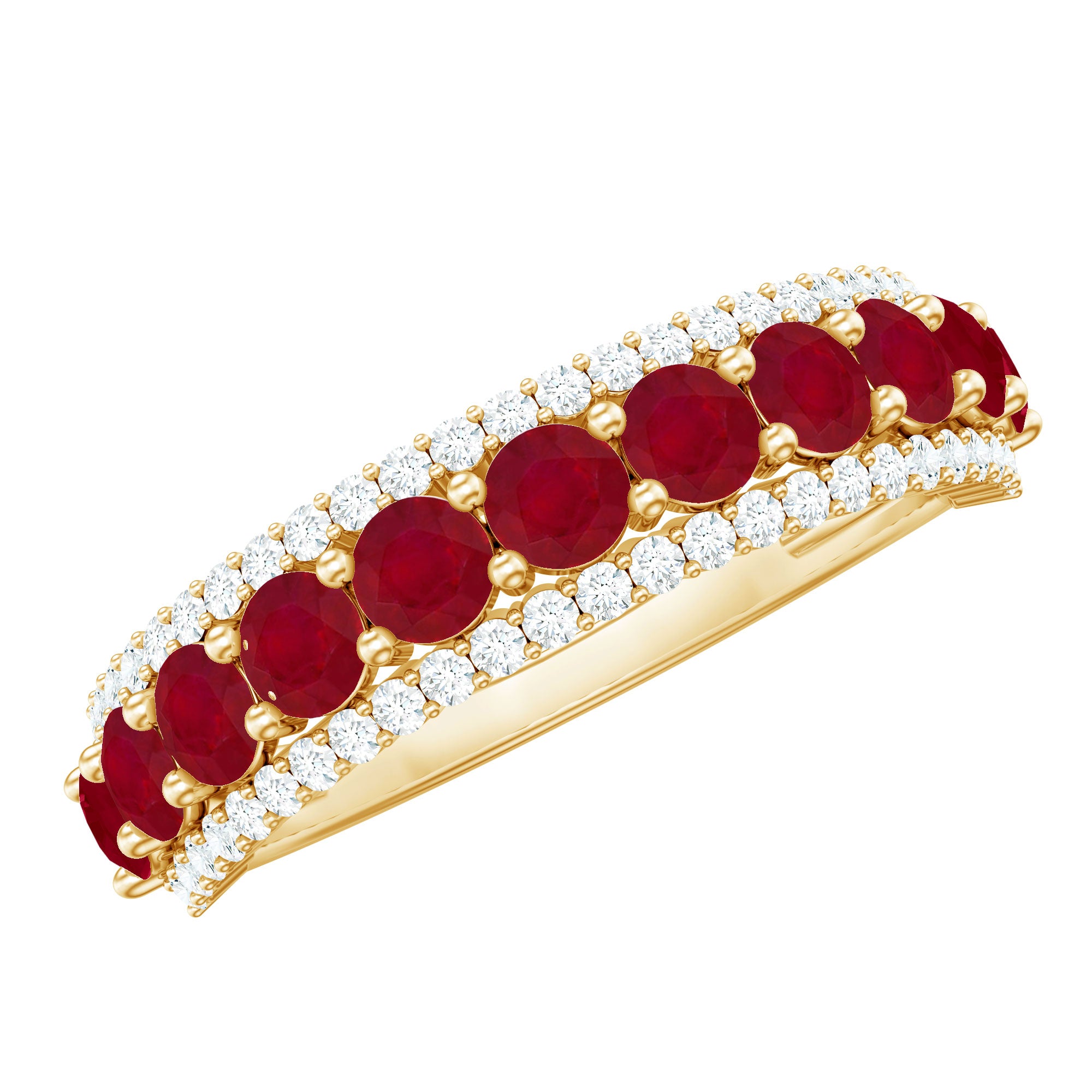 Choose something special for your beloved with this Semi Eternity Ring. Round Shape Ruby adorn this Anniversary Ring in Prong Setting with petite Diamond stones over Solid Gold build to make for a gorgeous choice for your beloved.