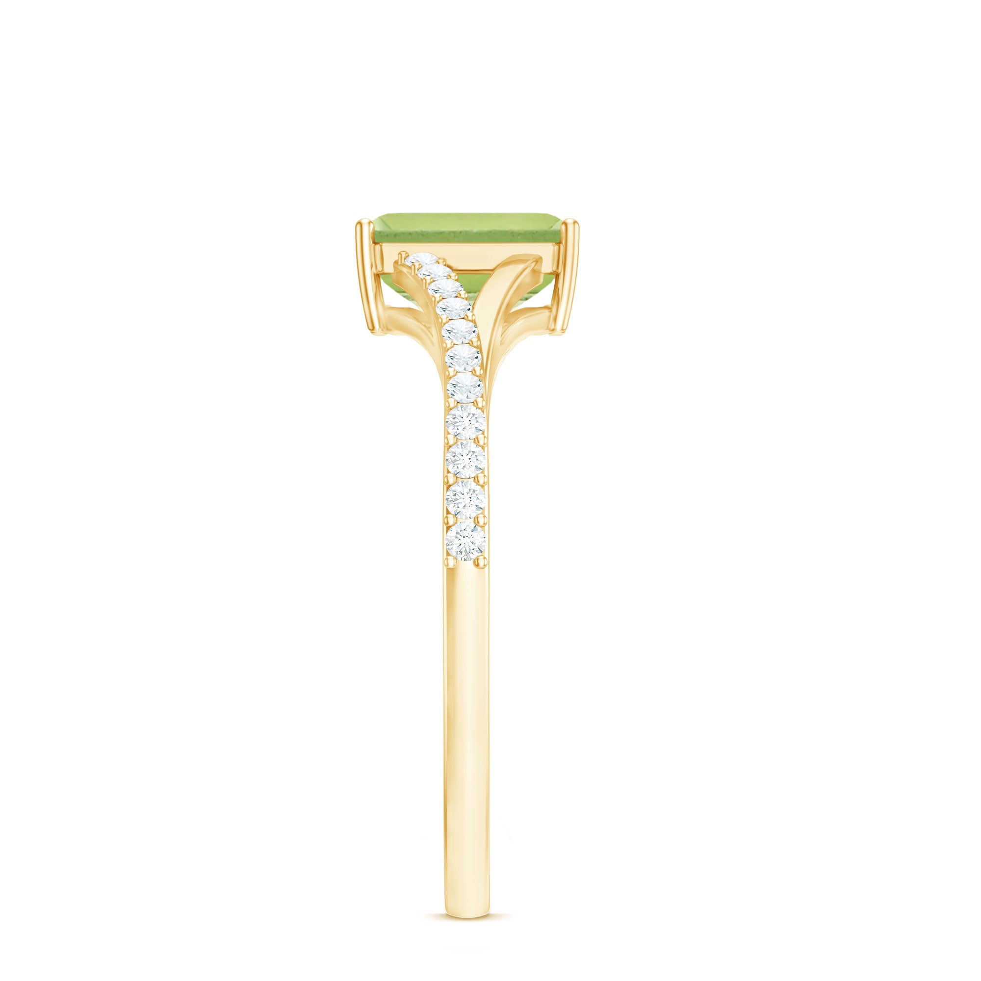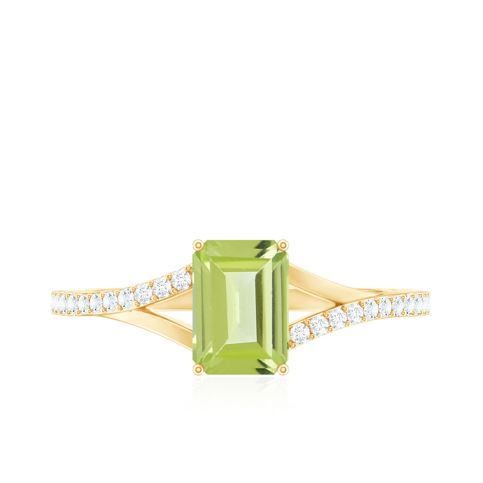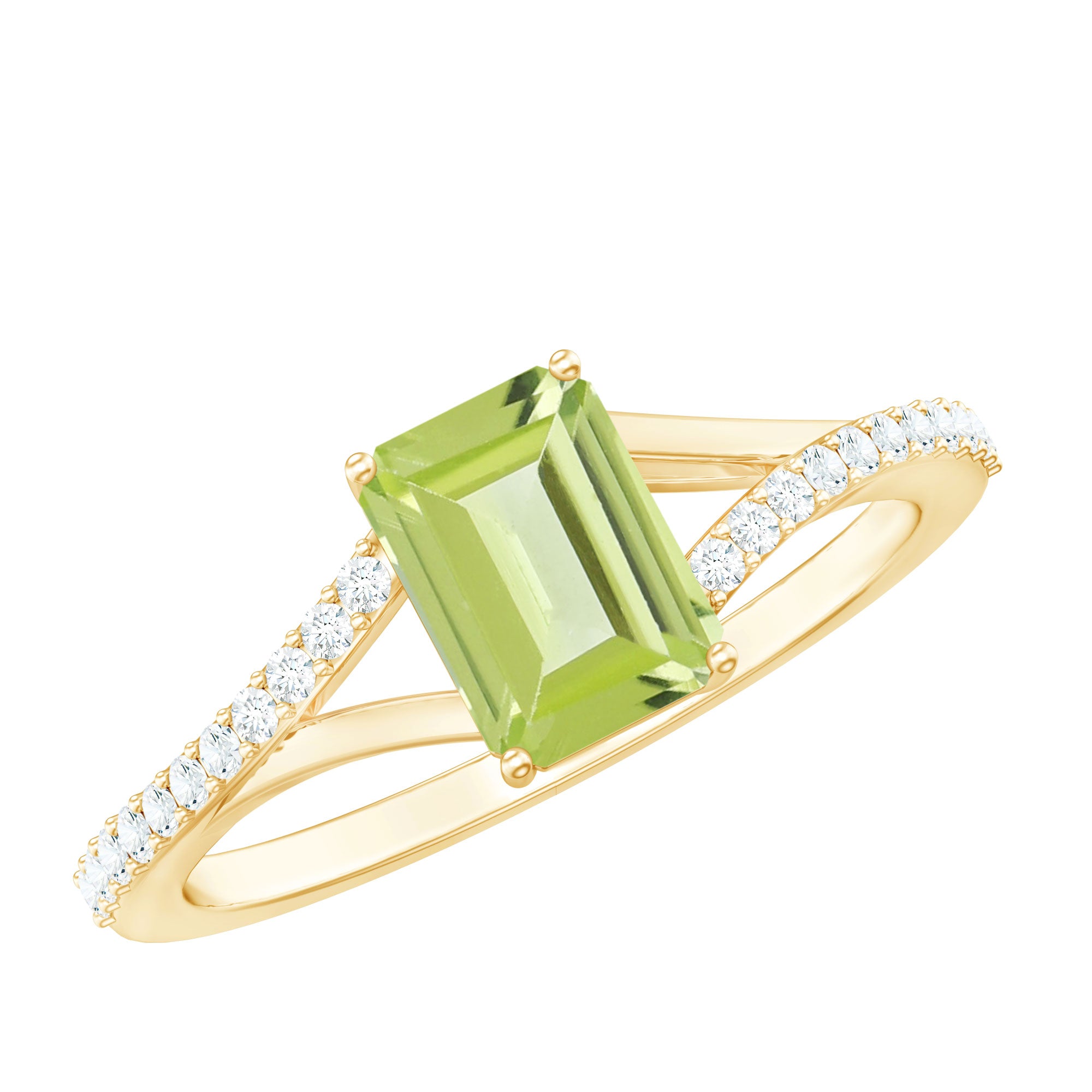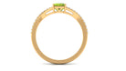Look gorgeous by wearing this pleasing Solitaire Ring embellished with Emerald Cut Peridot in 4 Prong Setting while the shimmering Diamond Stones are studded over Split Shank. Crafted with Gold, this Peridot Solitaire Ring will give you a stand out look from others. Get this adorable Peridot Stone Ring for your special person and make her feel special.