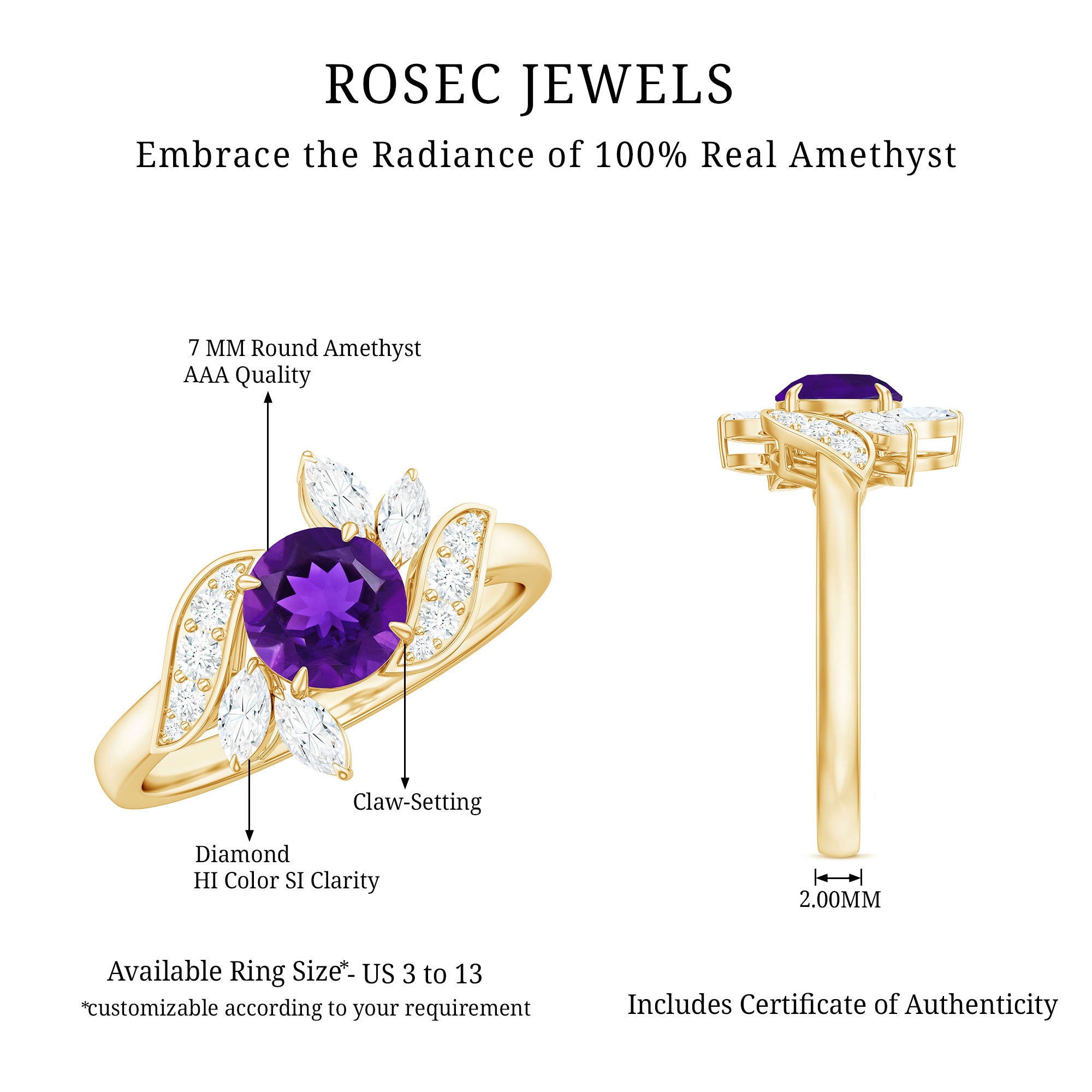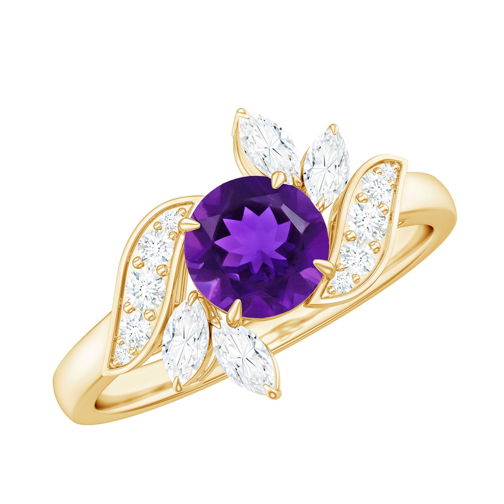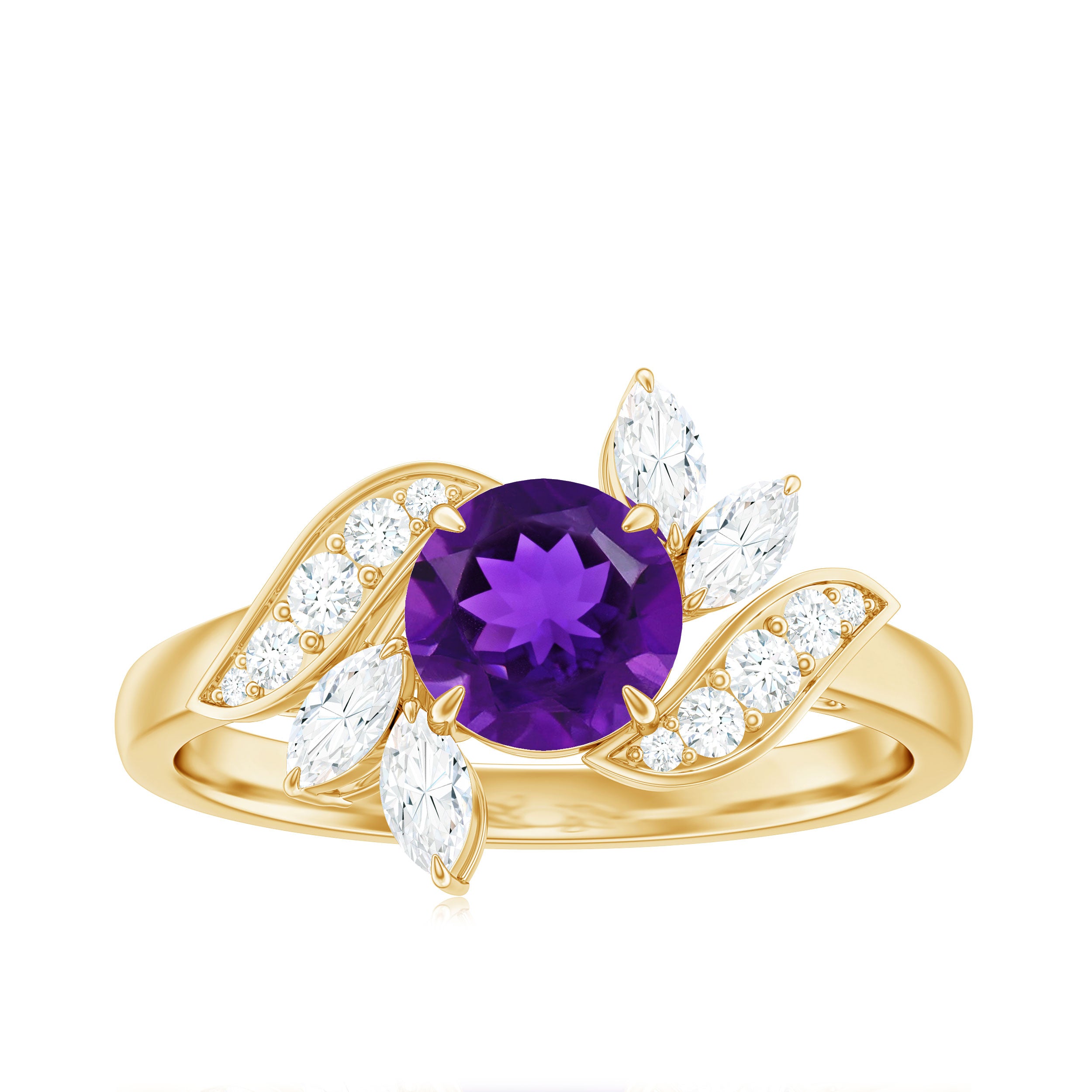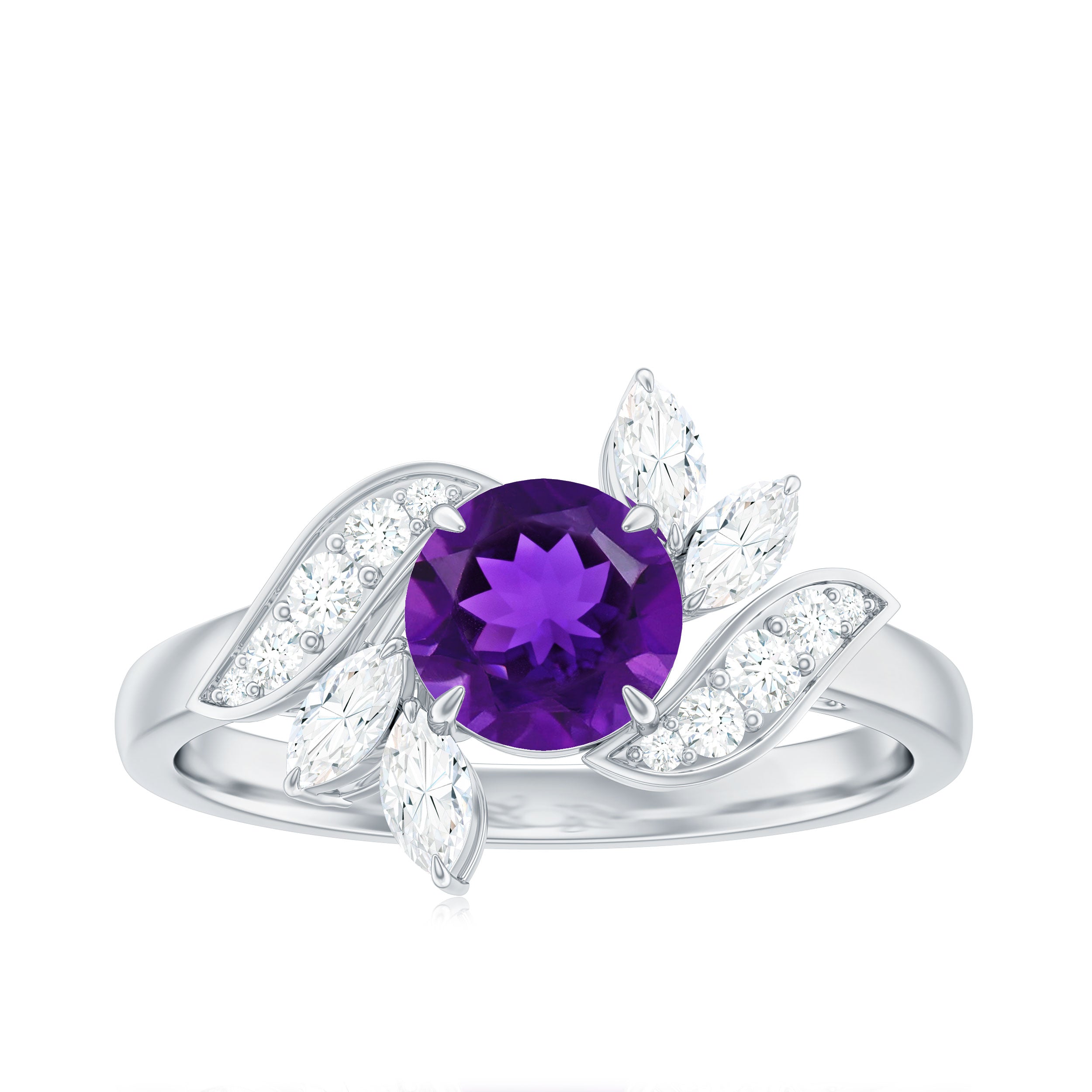 Every moment of yours is worth celebrating, so why not celebrate it with an alluring fine jewelry. This Amethyst Engagement Ring is exactly what your are looking for your partner, Round Amethyst and Marquise Diamond is held in Claw Setting and Round Diamond is held in prong setting are featured in leaf pattern. Show your love to your partner with this Vintage Amethyst Ring.
