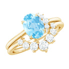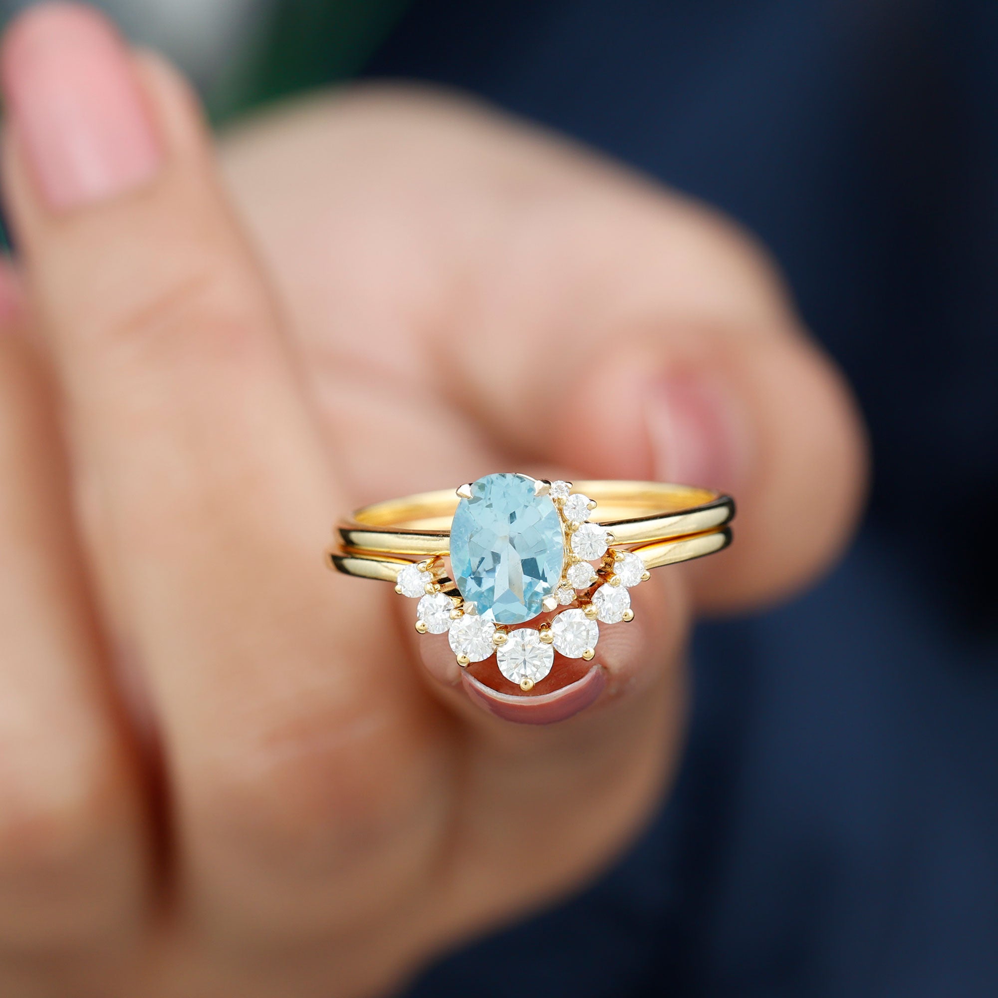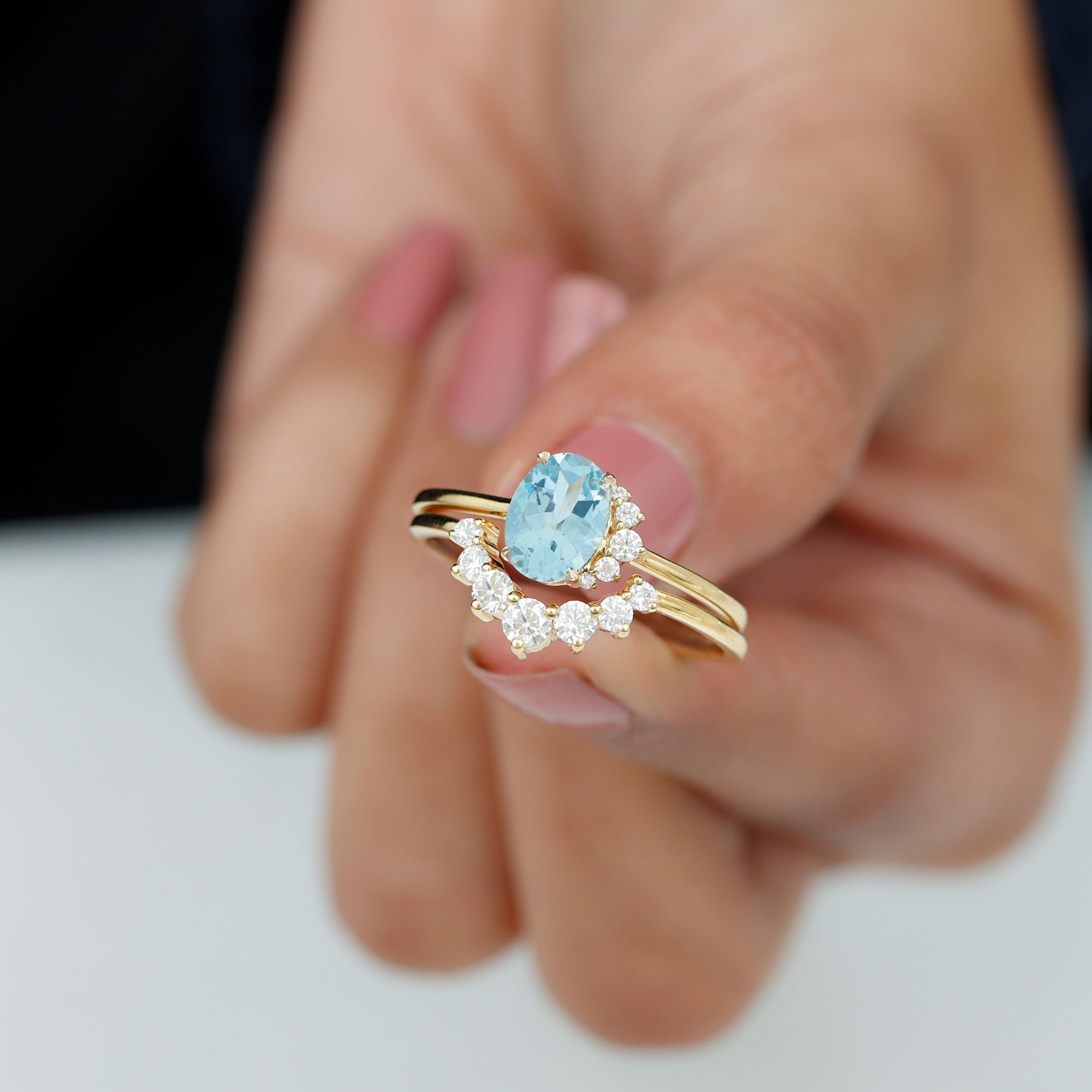 Embrace the perfect blend of beauty and elegance with this exquisite Wedding Ring Set, featuring a mesmerizing Oval Shape Aquamarine stone that sits elegantly as the centerpiece in a secure claw setting. The solitaire is complemented by sparkling Round Shape Diamond stones that are set in a sleek and stylish prong setting on the enhancer band. Crafted in solid gold, this Wedding Ring Set exudes a luxurious and opulent charm, making it the perfect choice to grace your special day.