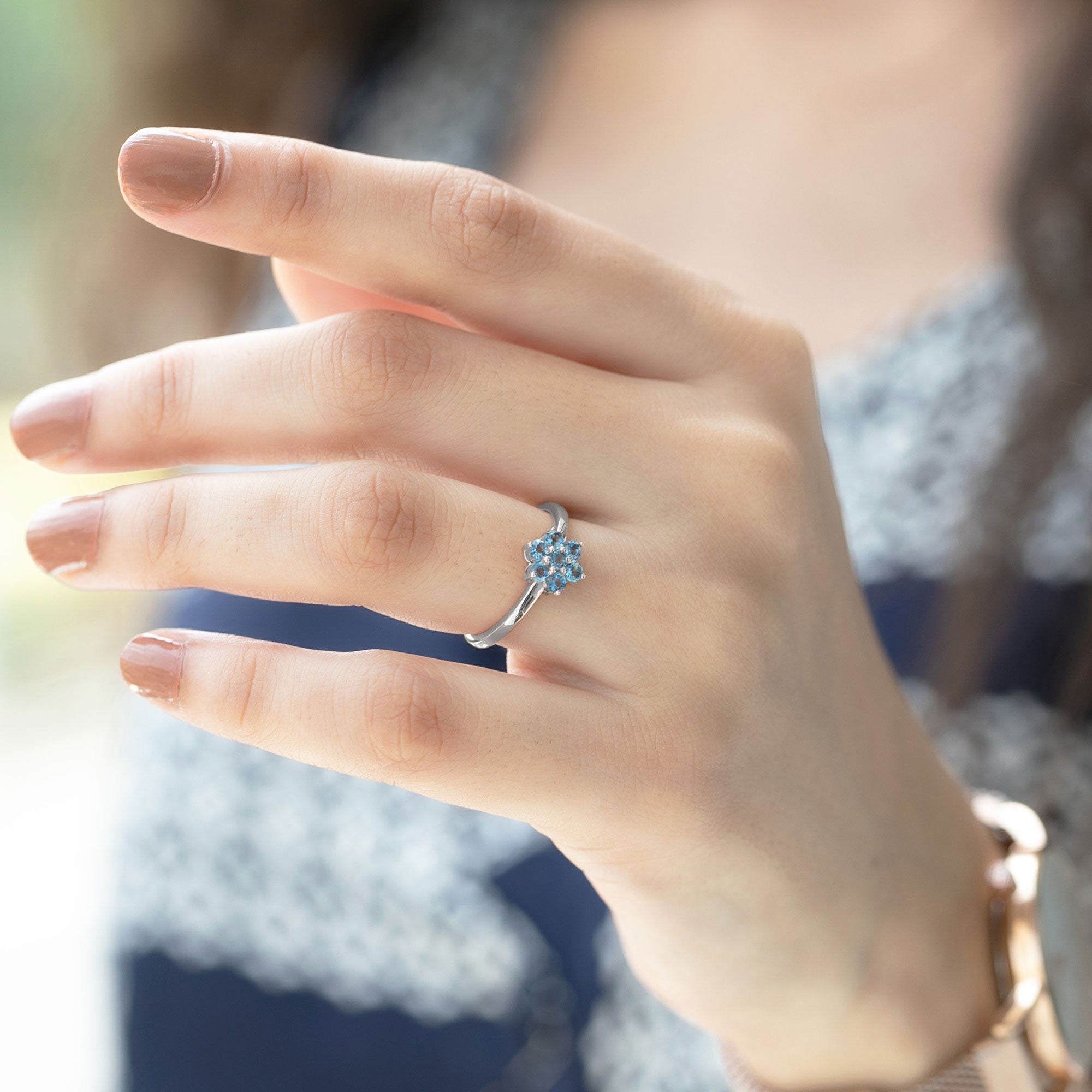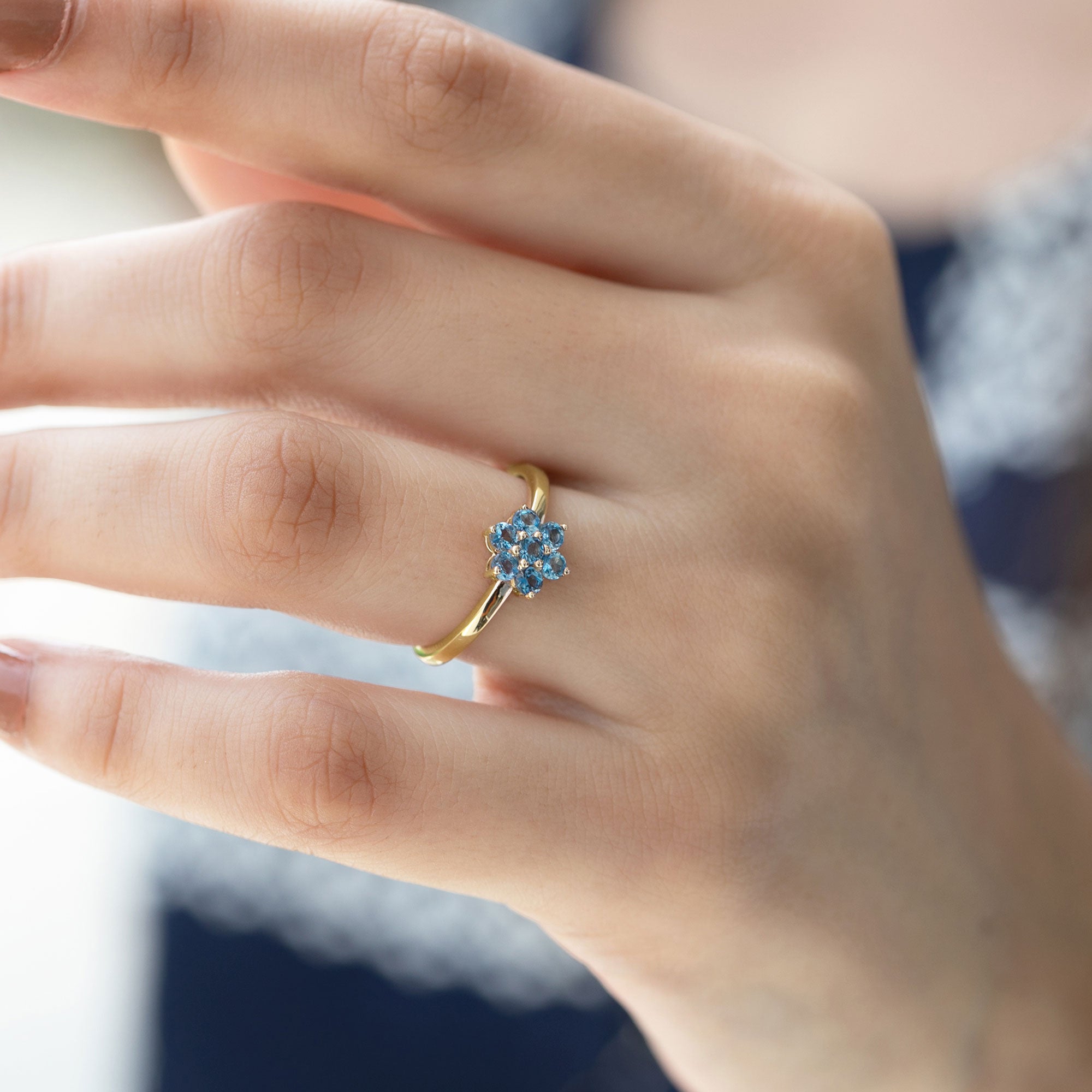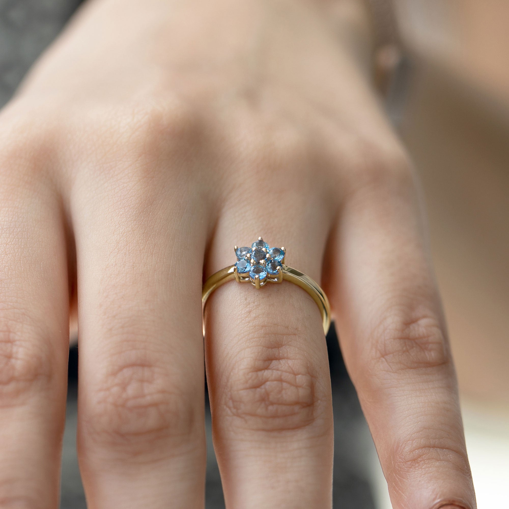 Make your bride-to-be feel special with this stunning Aquamarine Cluster Ring. This Gold Flower Ring features a 4 MM round cut aquamarine elegantly set in a prong setting. Available in 10K, 14K, and 18K solid gold, this ring is a must-have for your wedding jewelry collection.