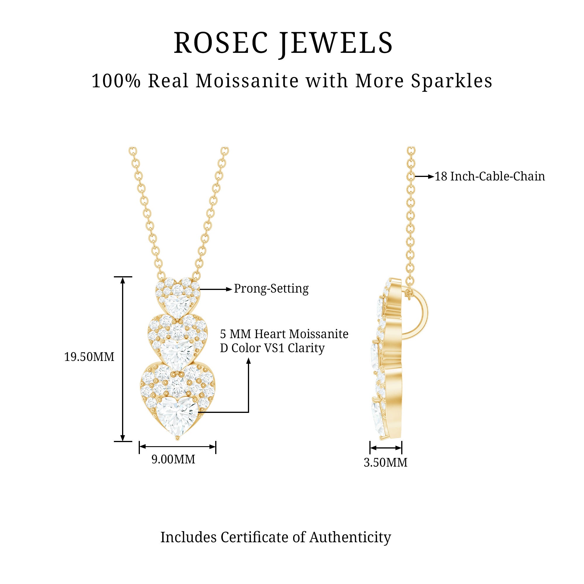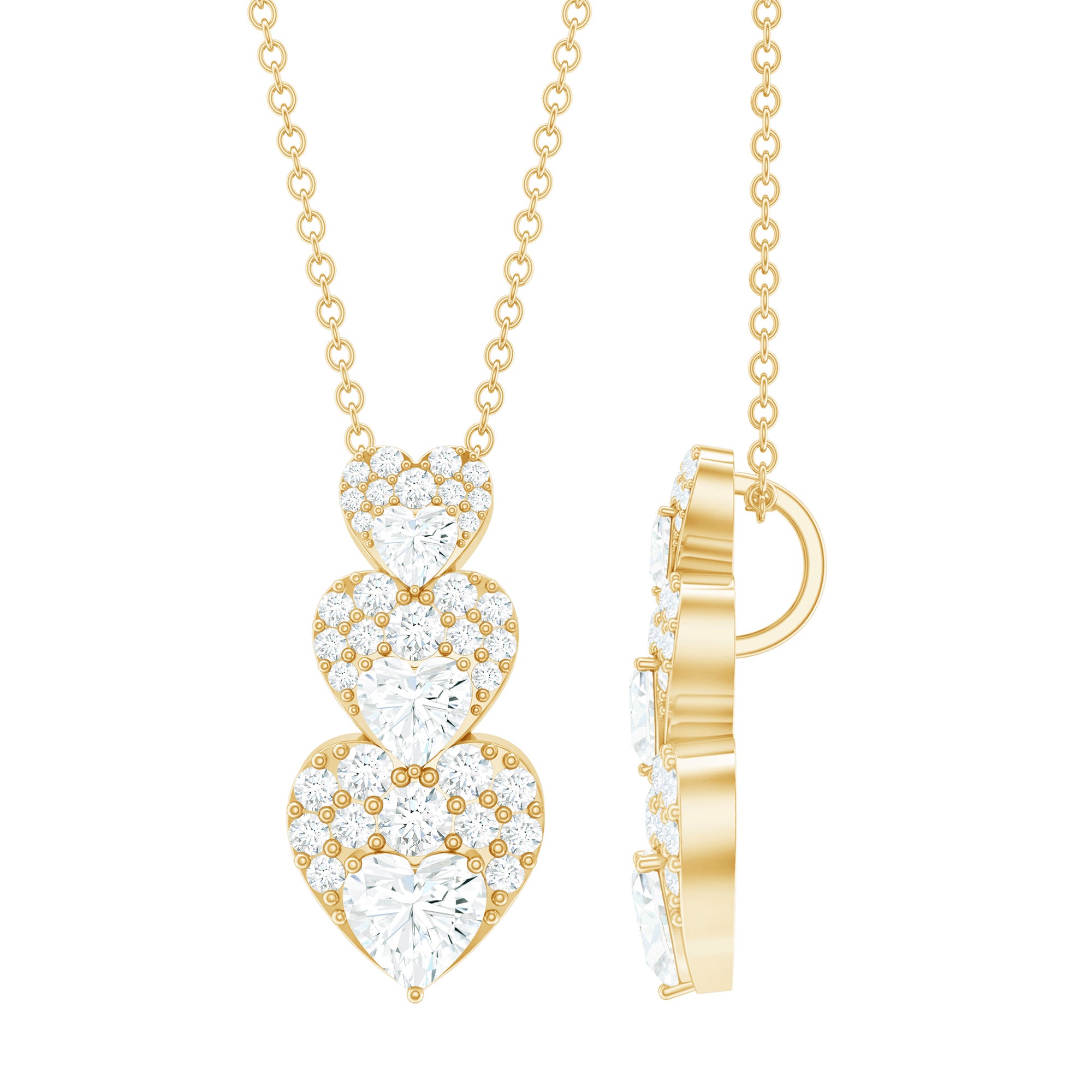 This Heart Dangle Pendant is a beautiful combination of Heart Shape and round shape Moissanite stones set in a prong setting. The unique design includes a hidden bail, which adds to the elegance of this pendant. This Moissanite Pendant crafted in Gold and is a perfect addition to any jewelry collection.