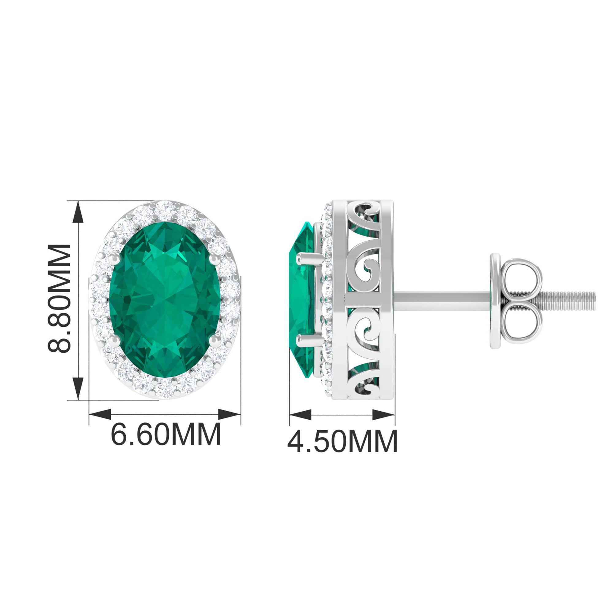 Adorn yourself in these Stud Earrings featuring Oval Cut Emerald Solitaire adorned by a Round Brilliant Diamond Halo adding to the look of these Halo Stud Earrings.