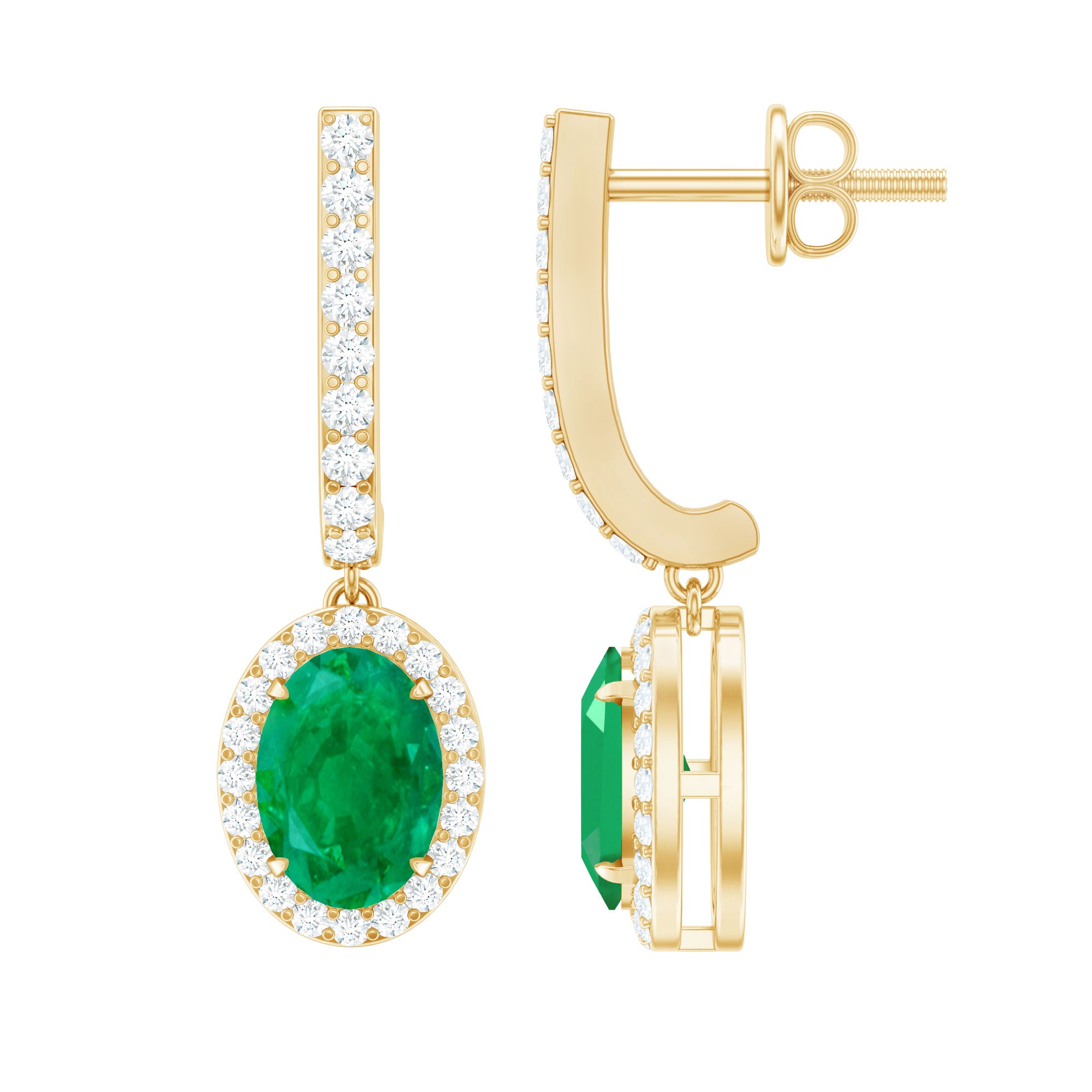 Celebrate this mothers day with stunning and beautiful Drop Hoop Earrings for your loving mother. These J Hoop Earrings are adorned with Oval Cut Emerald in Claw Setting with Diamond Halo, crafted in Solid Gold Metal.