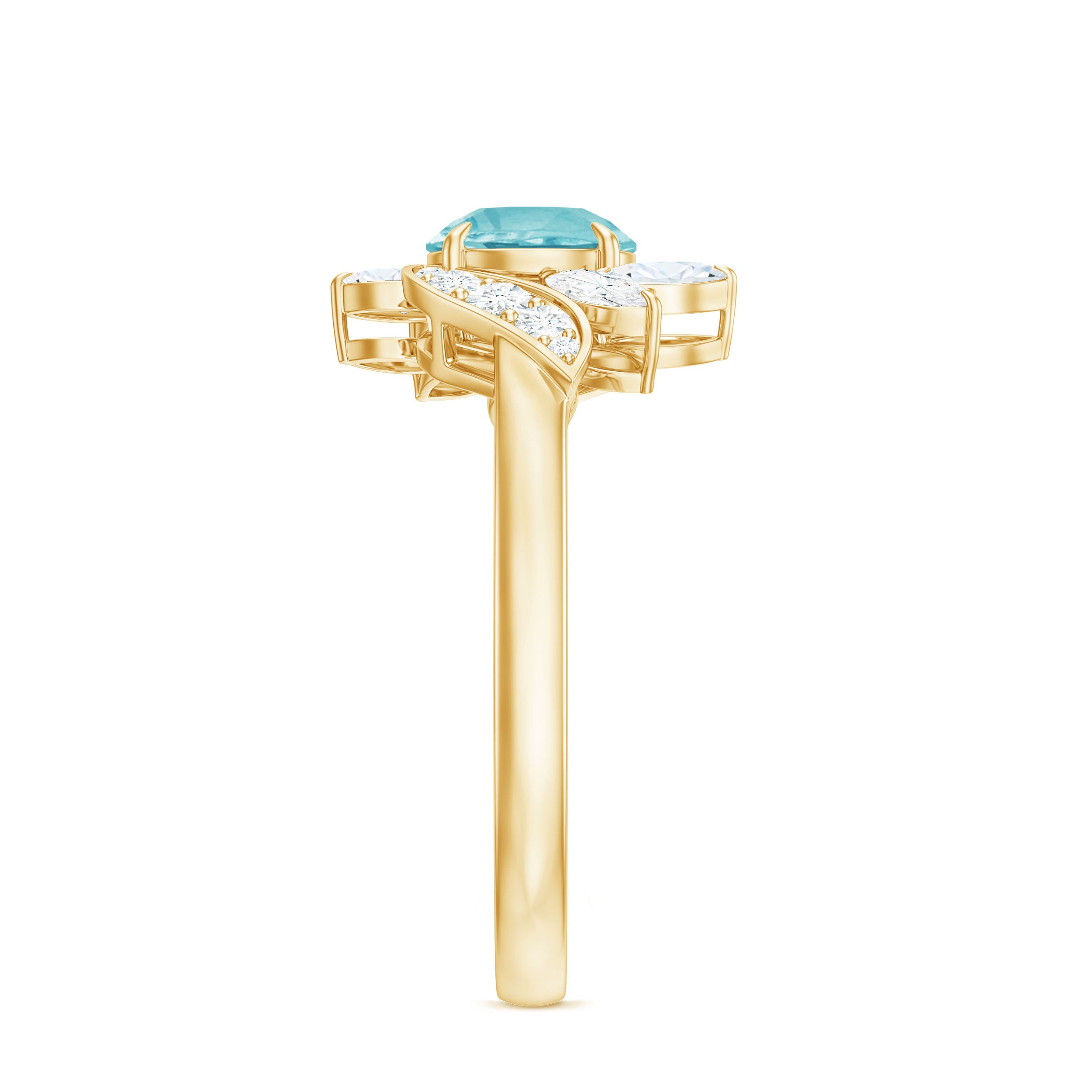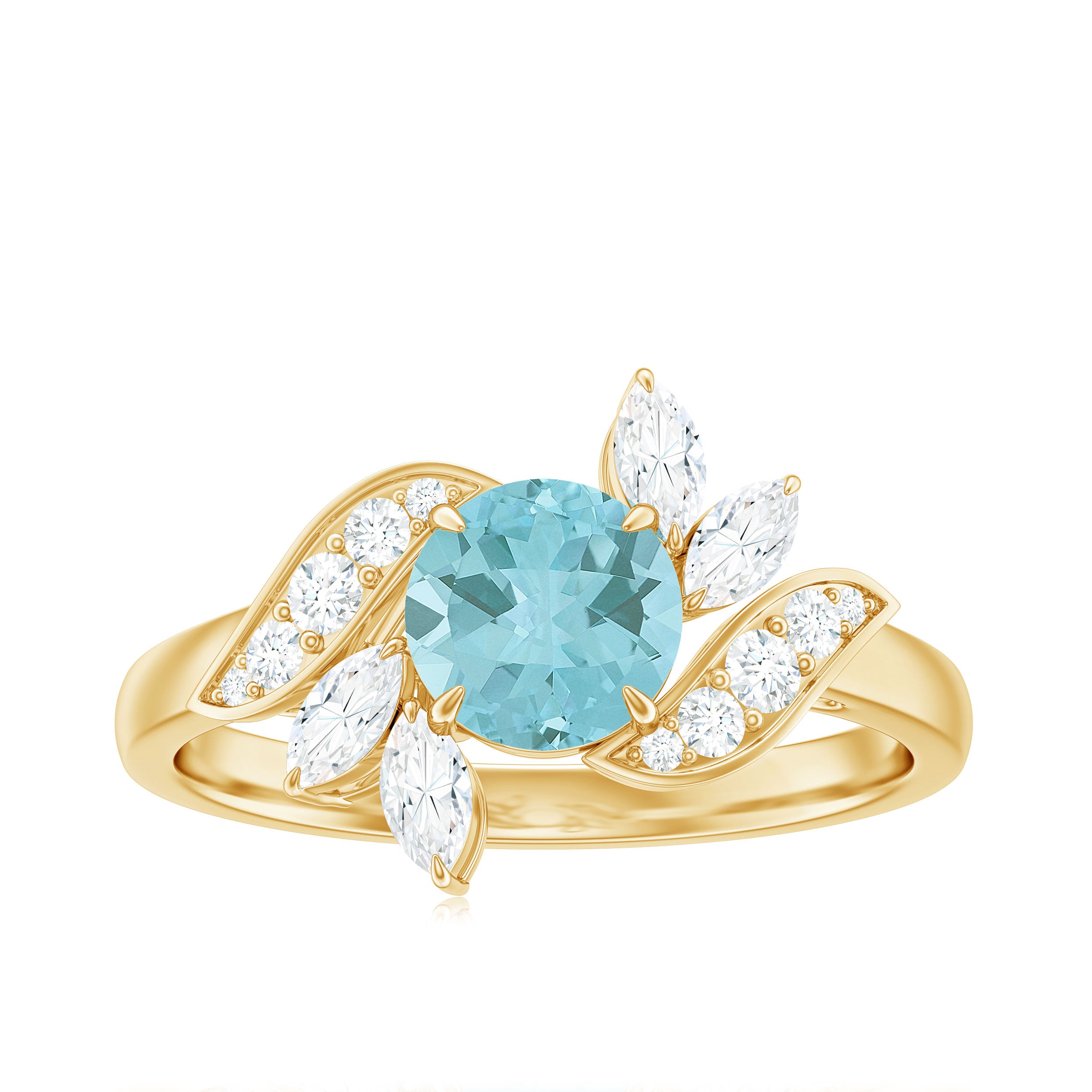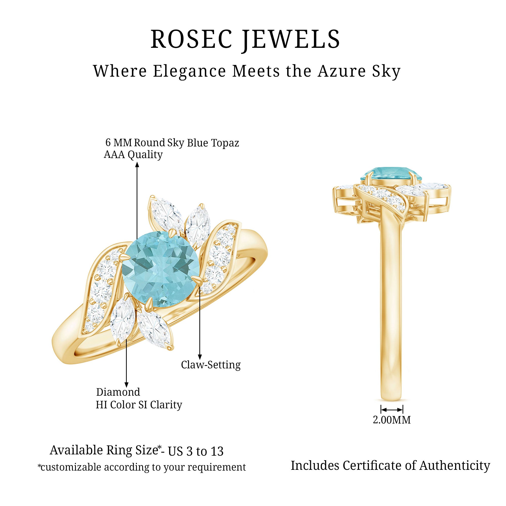 Declare your love with this exquisite Leaf Engagement Ring, featuring a 6 MM Round Shape Sky Blue Topaz set in a Claw Setting, and adorned with Round and Marquise Cut Diamond. The ring is expertly crafted from Solid Gold, creating a luxurious and timeless piece that symbolizes your commitment to each other. The Leaf design adds a touch of nature-inspired beauty to the ring, making it a perfect choice for any nature-loving bride-to-be. The Sky Blue Topaz is known for its calming and soothing energy, while the Diamond adds a dazzling touch of sparkle. This ring is a beautiful representation of your love and devotion to each other.
